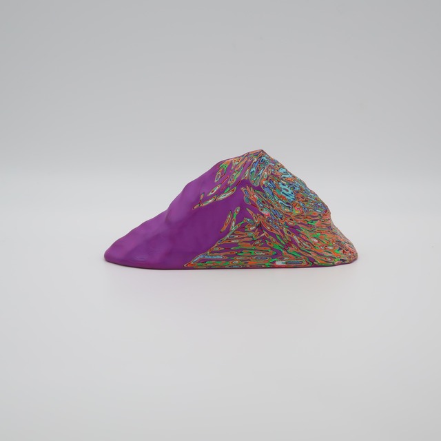ヤマ(パープル) w13.5×d4.5×h6.5㎝ 100層の色を重ね、色を彫刻する。木彫をベースにしながら、アクリル絵具を気が遠くなるほど塗り重ね、「色」という皮膚を厚くしていきます。 『COLOR SCULPTURE(色彩彫刻)』というオリジナルの手法で制作された木彫作品は、ポップでカラフルな見た目の奥に重層的なレイヤーが現れます。 表面の「かわいさ」だけでなく、その下に隠れた「色の重なり」を覗き見る楽しさがある作品です 今展では不思議な魅力を持つ、ガールズ作品を中心に展示いたします。 ハットリコウヘイ 1978 東京都生まれ 2007 武蔵野美術大学大学院 美術専攻 彫刻コース修了 ※設置場所について ・エアコンの風が直接当たる場所や、極端に乾燥する場所への長時間の設置は避けてください。中の木材が変形し、表面の塗膜にひび割れが生じる恐れがあります。 ・耐水性の絵具を使用しておりますが、木材の性質上、水気のある場所でのご使用・保管はお控えください ※お手入れ方法 ほこりや汚れが付着した際は、乾いた柔らかい布で優しく拭き取ってください。変形やシミの原因となるため、水拭きは避けてください。 ※お使いの端末や閲覧環境により、写真と実物の色味や質感が多少異なって見えることがございます。ご了承ください。