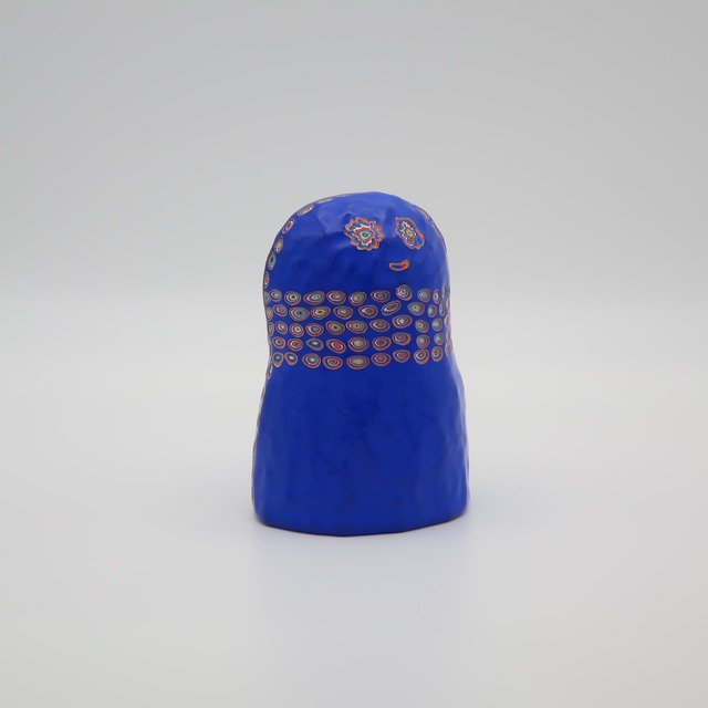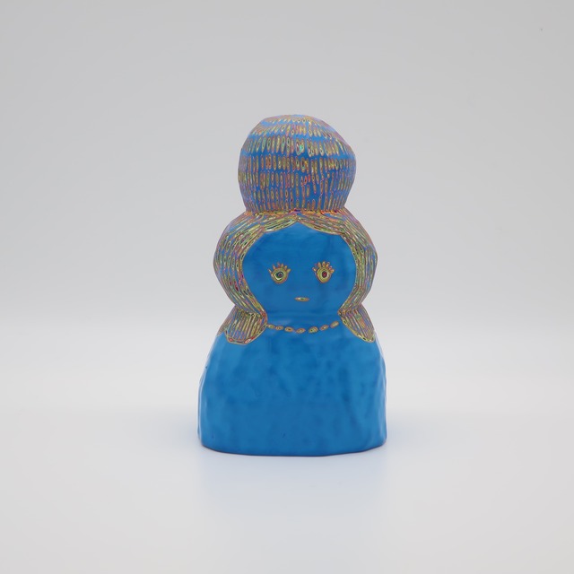 マダムブルー w8×d6×h13㎝ 100層の色を重ね、色を彫刻する。木彫をベースにしながら、アクリル絵具を気が遠くなるほど塗り重ね、「色」という皮膚を厚くしていきます。 『COLOR SCULPTURE(色彩彫刻)』というオリジナルの手法で制作された木彫作品は、ポップでカラフルな見た目の奥に重層的なレイヤーが現れます。 表面の「かわいさ」だけでなく、その下に隠れた「色の重なり」を覗き見る楽しさがある作品です 今展では不思議な魅力を持つ、ガールズ作品を中心に展示いたします。 ハットリコウヘイ 1978 東京都生まれ 2007 武蔵野美術大学大学院 美術専攻 彫刻コース修了 ※設置場所について ・エアコンの風が直接当たる場所や、極端に乾燥する場所への長時間の設置は避けてください。中の木材が変形し、表面の塗膜にひび割れが生じる恐れがあります。 ・耐水性の絵具を使用しておりますが、木材の性質上、水気のある場所でのご使用・保管はお控えください ※お手入れ方法 ほこりや汚れが付着した際は、乾いた柔らかい布で優しく拭き取ってください。変形やシミの原因となるため、水拭きは避けてください。 ※お使いの端末や閲覧環境により、写真と実物の色味や質感が多少異なって見えることがございます。ご了承ください。