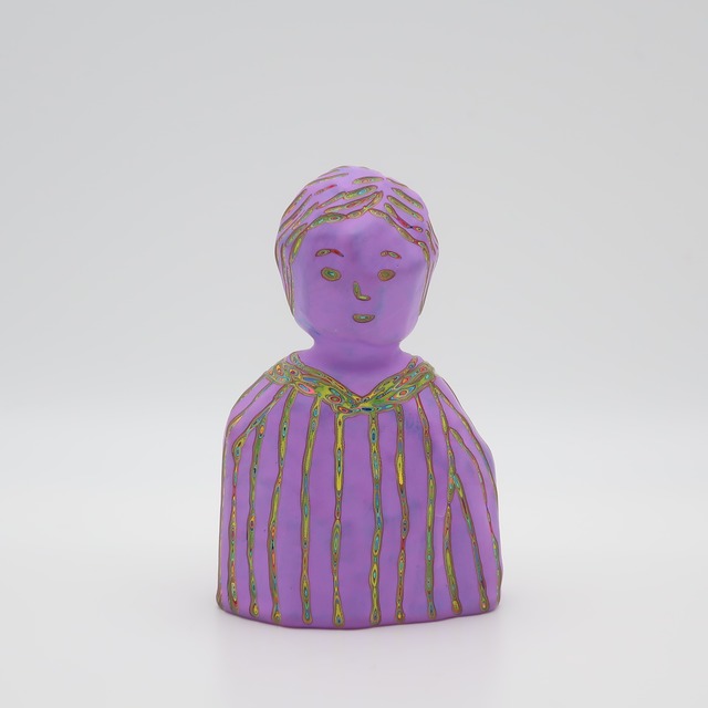 ラベンダー w7×d4×h11㎝ 100層の色を重ね、色を彫刻する。木彫をベースにしながら、アクリル絵具を気が遠くなるほど塗り重ね、「色」という皮膚を厚くしていきます。 『COLOR SCULPTURE(色彩彫刻)』というオリジナルの手法で制作された木彫作品は、ポップでカラフルな見た目の奥に重層的なレイヤーが現れます。 表面の「かわいさ」だけでなく、その下に隠れた「色の重なり」を覗き見る楽しさがある作品です 今展では不思議な魅力を持つ、ガールズ作品を中心に展示いたします。 ハットリコウヘイ 1978 東京都生まれ 2007 武蔵野美術大学大学院 美術専攻 彫刻コース修了 ※設置場所について ・エアコンの風が直接当たる場所や、極端に乾燥する場所への長時間の設置は避けてください。中の木材が変形し、表面の塗膜にひび割れが生じる恐れがあります。 ・耐水性の絵具を使用しておりますが、木材の性質上、水気のある場所でのご使用・保管はお控えください ※お手入れ方法 ほこりや汚れが付着した際は、乾いた柔らかい布で優しく拭き取ってください。変形やシミの原因となるため、水拭きは避けてください。 ※お使いの端末や閲覧環境により、写真と実物の色味や質感が多少異なって見えることがございます。ご了承ください。