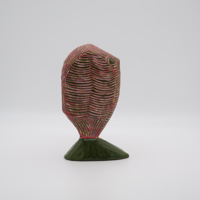 サカナグリーン w10.5×d4.5×h17㎝ 100層の色を重ね、色を彫刻する。木彫をベースにしながら、アクリル絵具を気が遠くなるほど塗り重ね、「色」という皮膚を厚くしていきます。 『COLOR SCULPTURE(色彩彫刻)』というオリジナルの手法で制作された木彫作品は、ポップでカラフルな見た目の奥に重層的なレイヤーが現れます。 表面の「かわいさ」だけでなく、その下に隠れた「色の重なり」を覗き見る楽しさがある作品です 今展では不思議な魅力を持つ、ガールズ作品を中心に展示いたします。 ハットリコウヘイ 1978 東京都生まれ 2007 武蔵野美術大学大学院 美術専攻 彫刻コース修了 ※設置場所について ・エアコンの風が直接当たる場所や、極端に乾燥する場所への長時間の設置は避けてください。中の木材が変形し、表面の塗膜にひび割れが生じる恐れがあります。 ・耐水性の絵具を使用しておりますが、木材の性質上、水気のある場所でのご使用・保管はお控えください ※お手入れ方法 ほこりや汚れが付着した際は、乾いた柔らかい布で優しく拭き取ってください。変形やシミの原因となるため、水拭きは避けてください。 ※お使いの端末や閲覧環境により、写真と実物の色味や質感が多少異なって見えることがございます。ご了承ください。