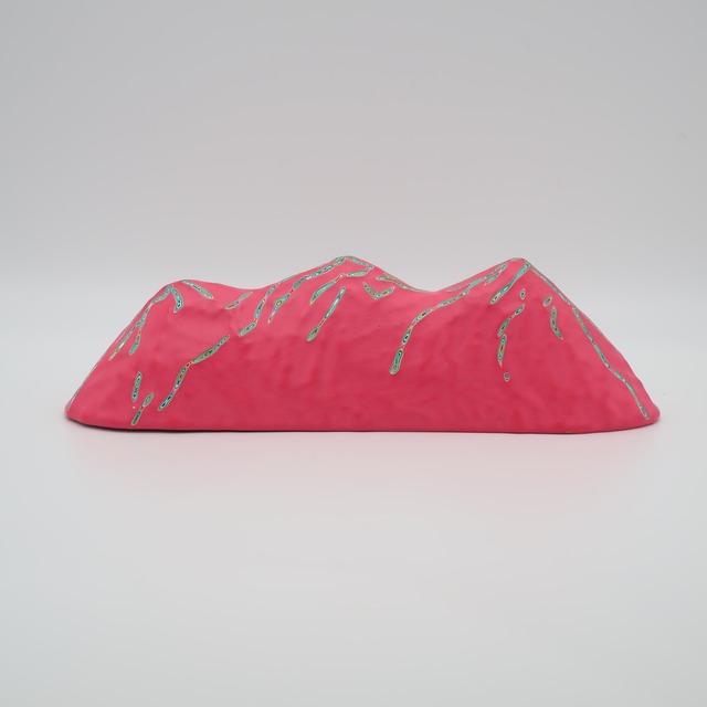 キノコマウンテン(ピンク) w21×d5.5×h6.5㎝ 100層の色を重ね、色を彫刻する。木彫をベースにしながら、アクリル絵具を気が遠くなるほど塗り重ね、「色」という皮膚を厚くしていきます。 『COLOR SCULPTURE(色彩彫刻)』というオリジナルの手法で制作された木彫作品は、ポップでカラフルな見た目の奥に重層的なレイヤーが現れます。 表面の「かわいさ」だけでなく、その下に隠れた「色の重なり」を覗き見る楽しさがある作品です 今展では不思議な魅力を持つ、ガールズ作品を中心に展示いたします。 ハットリコウヘイ 1978 東京都生まれ 2007 武蔵野美術大学大学院 美術専攻 彫刻コース修了 ※設置場所について ・エアコンの風が直接当たる場所や、極端に乾燥する場所への長時間の設置は避けてください。中の木材が変形し、表面の塗膜にひび割れが生じる恐れがあります。 ・耐水性の絵具を使用しておりますが、木材の性質上、水気のある場所でのご使用・保管はお控えください ※お手入れ方法 ほこりや汚れが付着した際は、乾いた柔らかい布で優しく拭き取ってください。変形やシミの原因となるため、水拭きは避けてください。 ※お使いの端末や閲覧環境により、写真と実物の色味や質感が多少異なって見えることがございます。ご了承ください。