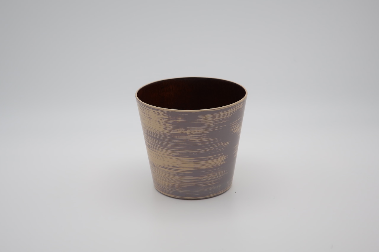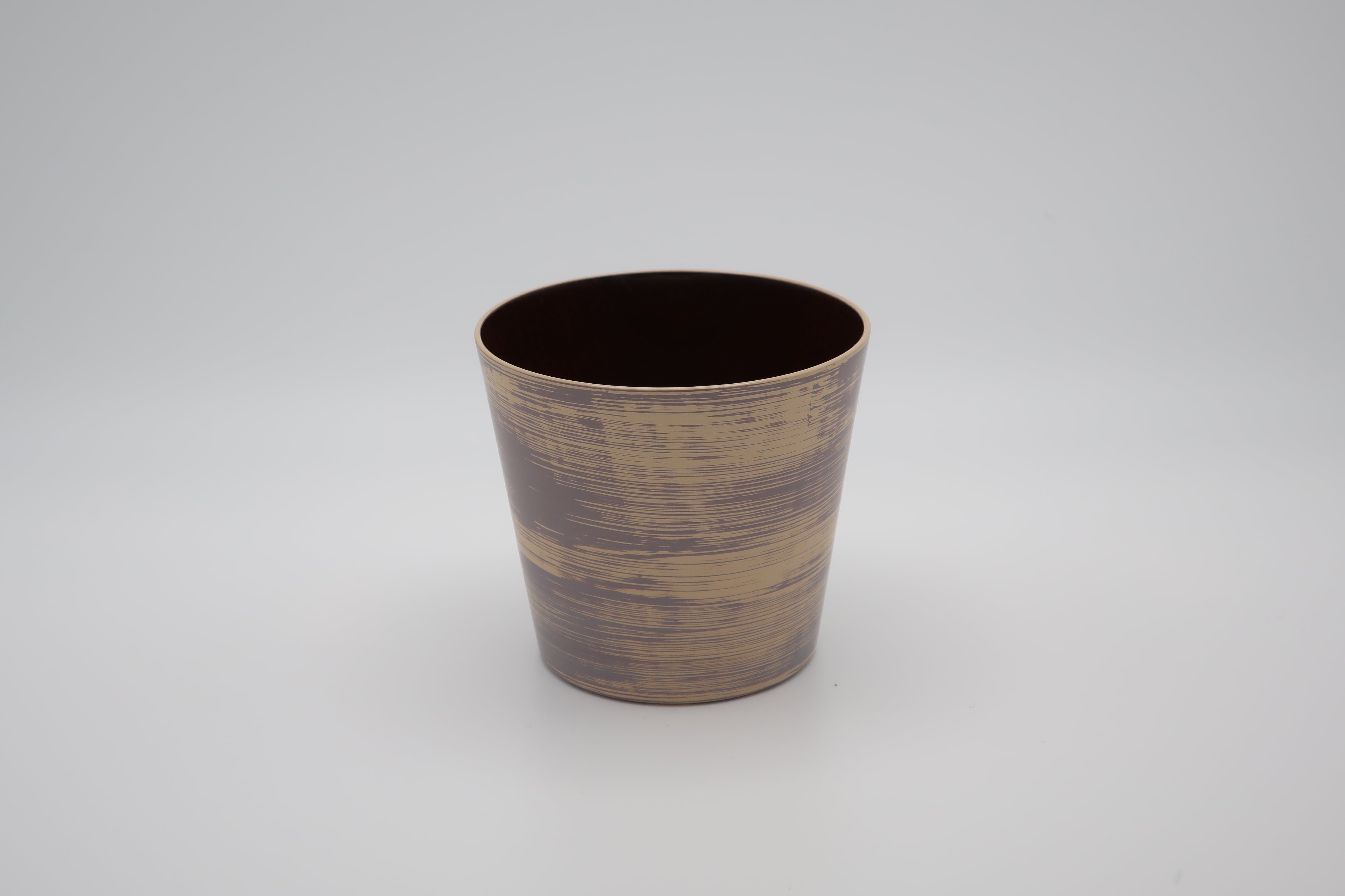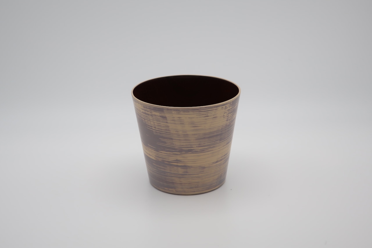水目桜の木地に内側は生漆を摺り重ね、光沢のある木目をみせています。外側は黒漆の上から色漆を塗っています。その後、色漆の表面を研ぎだす事で目には見えなかった漆の細かい刷毛目の凹凸や、木地の木目が柄となって現れます。形は同じでも木目の個性や、色味や模様は異なることで一期一会の楽しみがあります。