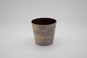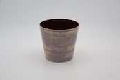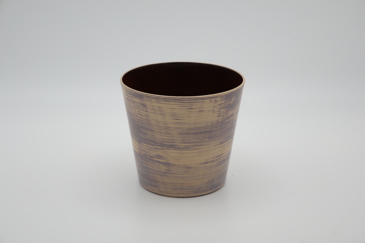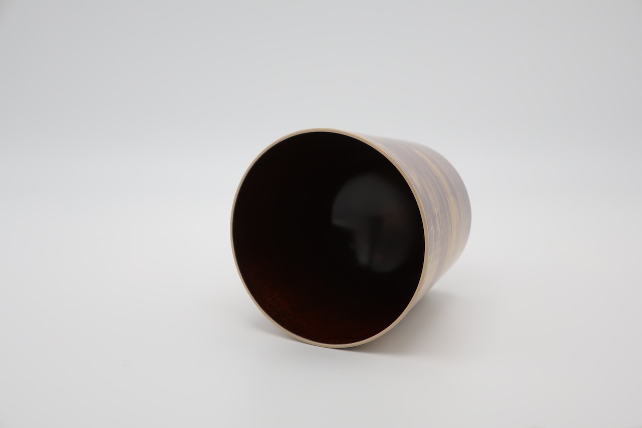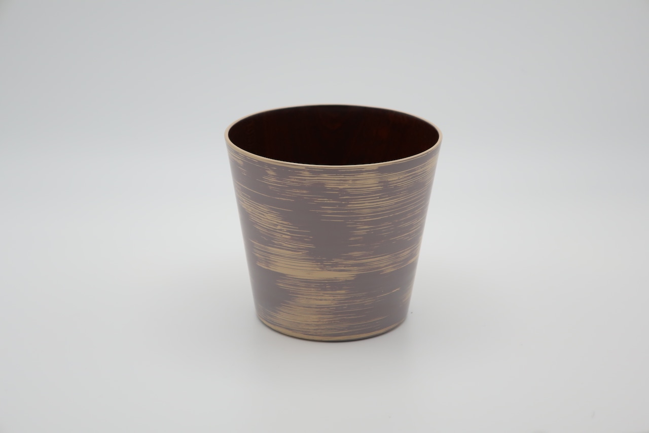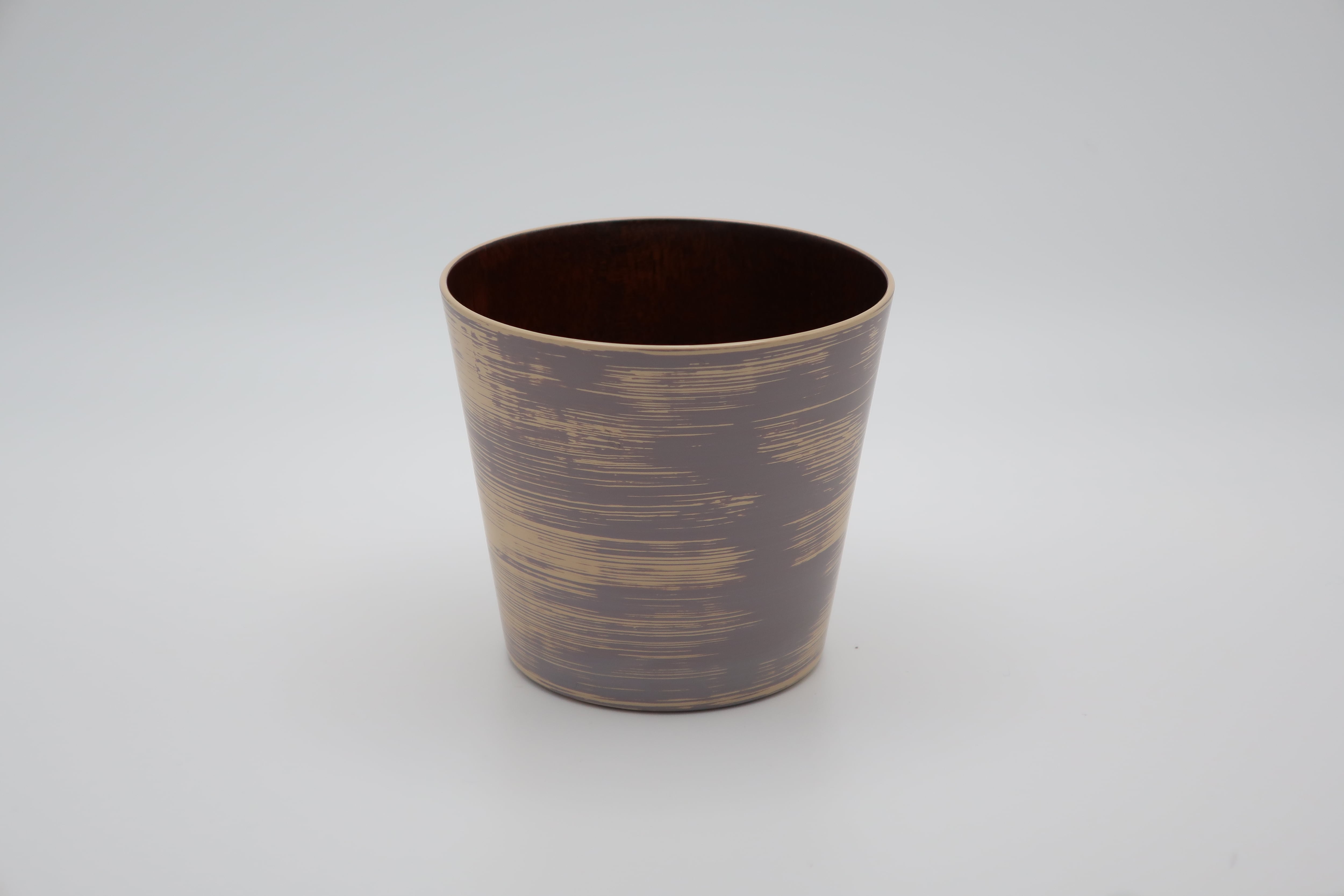 水目桜の木地に内側は生漆を摺り重ね、光沢のある木目をみせています。外側は黒漆の上から色漆を塗っています。その後、色漆の表面を研ぎだす事で目には見えなかった漆の細かい刷毛目の凹凸や、木地の木目が柄となって現れます。形は同じでも木目の個性や、色味や模様は異なることで一期一会の楽しみがあります。