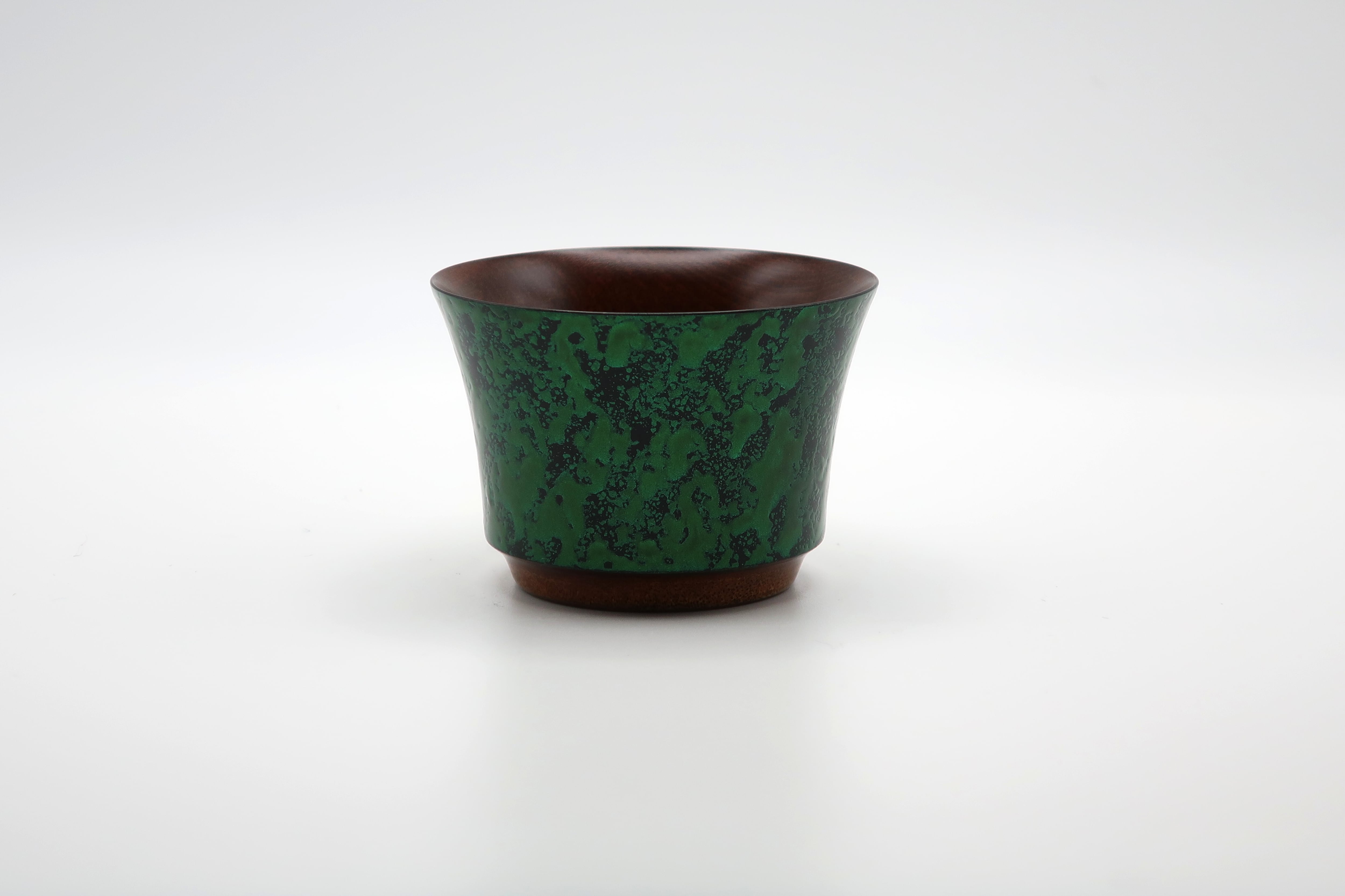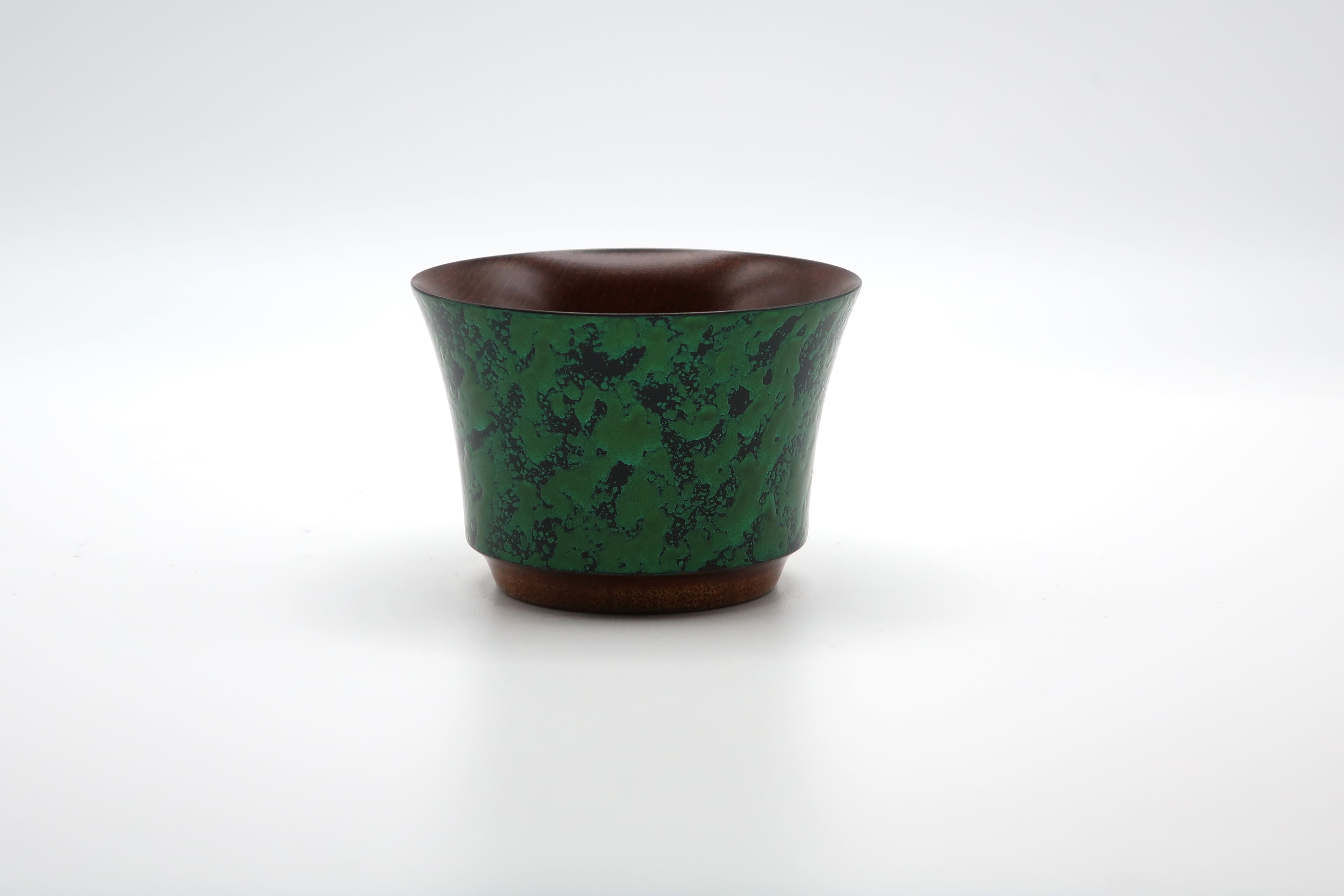 水目桜の木地に内側は生漆を摺り重ね、光沢のある木目をみせています。外側は黒漆の上から色漆でカラフルにテクスチャーを付けています。形は同じでも木目の個性や、漆の模様や色味は一つ一つ異なるよう工夫しております。
