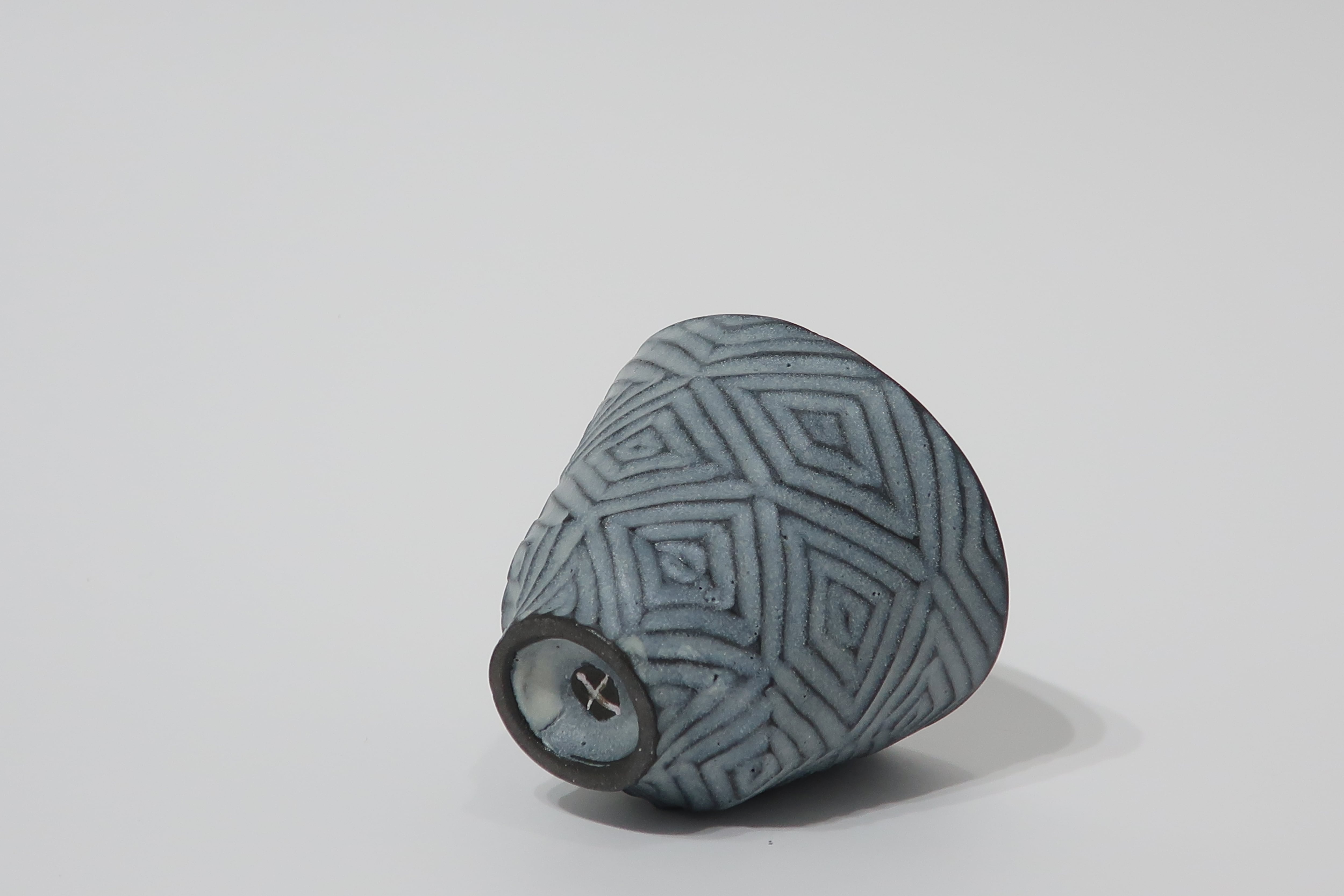 黒い陶土で成形し、まだ柔らかいうちに模様を入れて素焼をする。素焼後に白い釉薬を掛けて本焼成。黒い陶体の凹凸に釉薬の濃淡でほんのり青味を感じささる雰囲気を出している。彫りの模様で自然物の成長や躍動感、流れなどを表現しています。