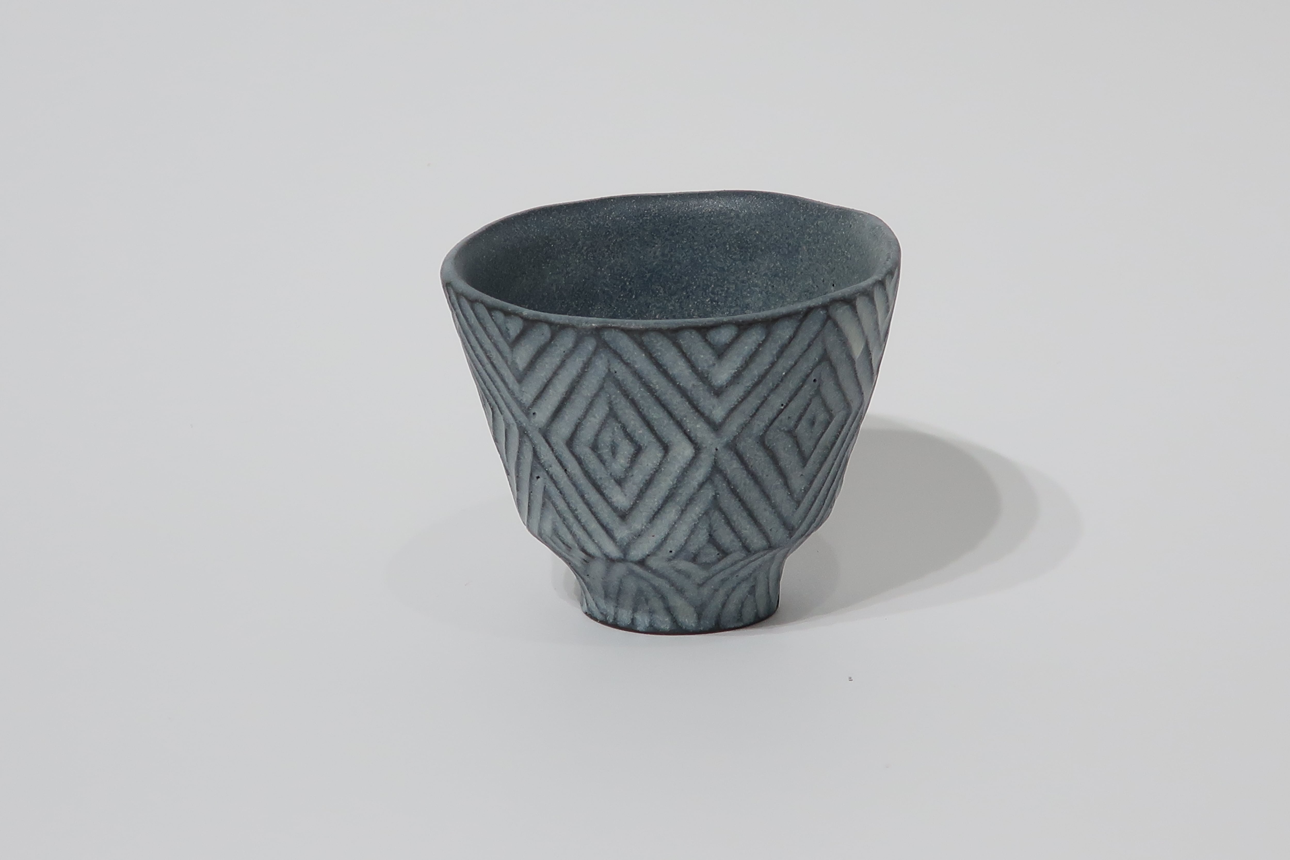 黒い陶土で成形し、まだ柔らかいうちに模様を入れて素焼をする。素焼後に白い釉薬を掛けて本焼成。黒い陶体の凹凸に釉薬の濃淡でほんのり青味を感じささる雰囲気を出している。彫りの模様で自然物の成長や躍動感、流れなどを表現しています。