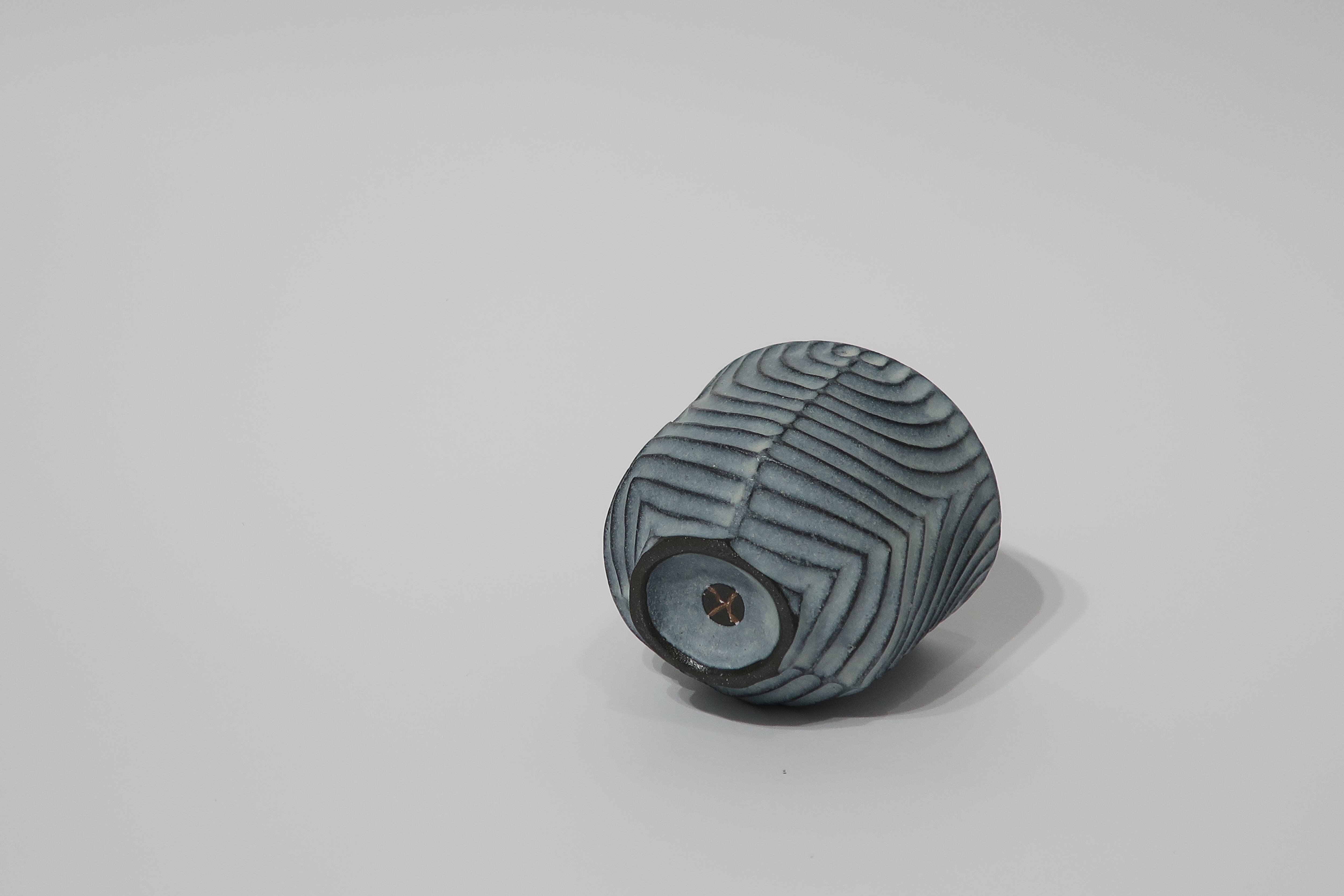 黒い陶土で成形し、まだ柔らかいうちに模様を入れて素焼をする。素焼後に白い釉薬を掛けて本焼成。黒い陶体の凹凸に釉薬の濃淡でほんのり青味を感じささる雰囲気を出している。彫りの模様で自然物の成長や躍動感、流れなどを表現しています。