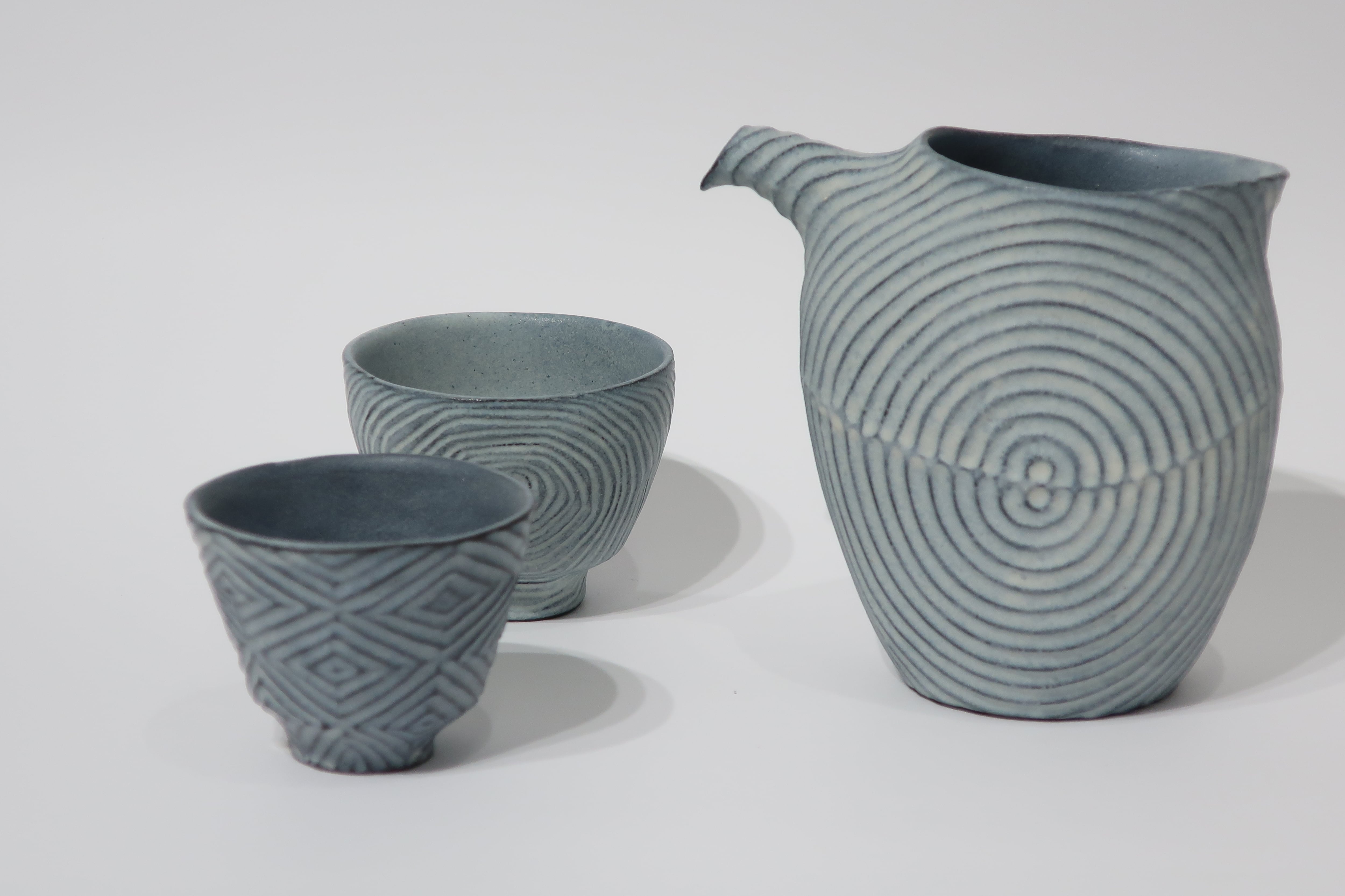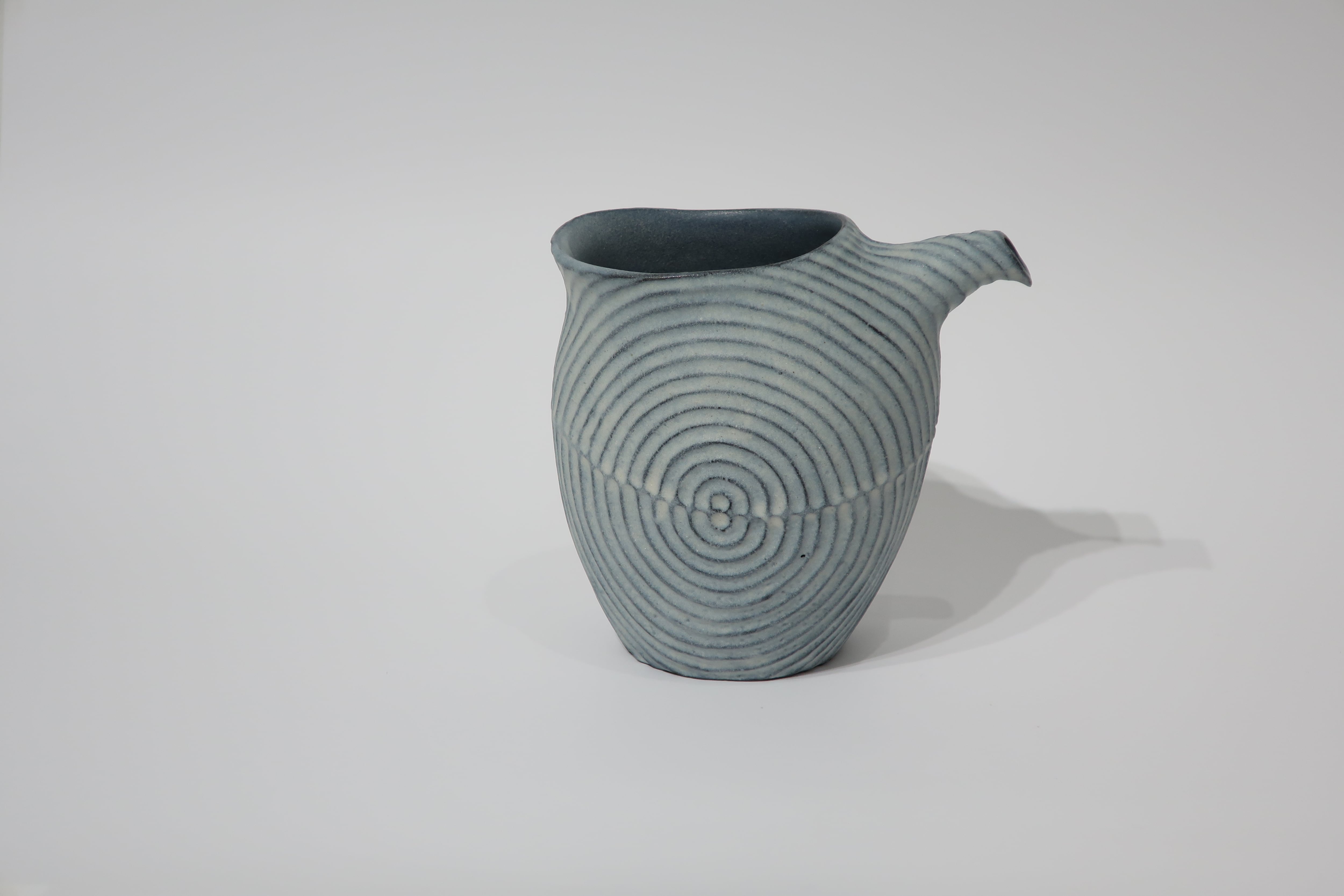 黒い陶土で成形し、まだ柔らかいうちに模様を入れて素焼をする。素焼後に白い釉薬を掛けて本焼成。黒い陶体の凹凸に釉薬の濃淡でほんのり青味を感じささる雰囲気を出している。彫りの模様で自然物の成長や躍動感、流れなどを表現しています。