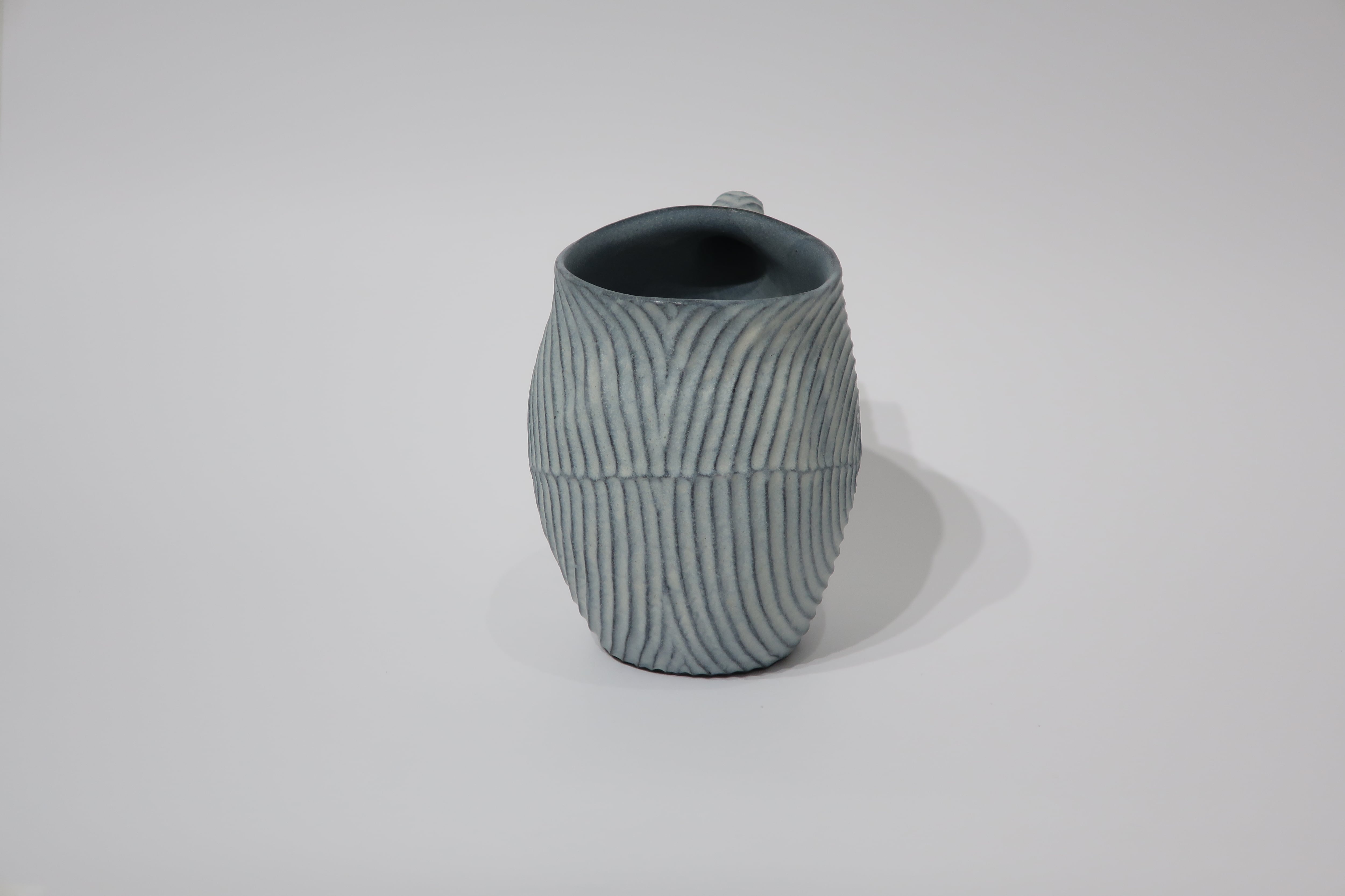 黒い陶土で成形し、まだ柔らかいうちに模様を入れて素焼をする。素焼後に白い釉薬を掛けて本焼成。黒い陶体の凹凸に釉薬の濃淡でほんのり青味を感じささる雰囲気を出している。彫りの模様で自然物の成長や躍動感、流れなどを表現しています。