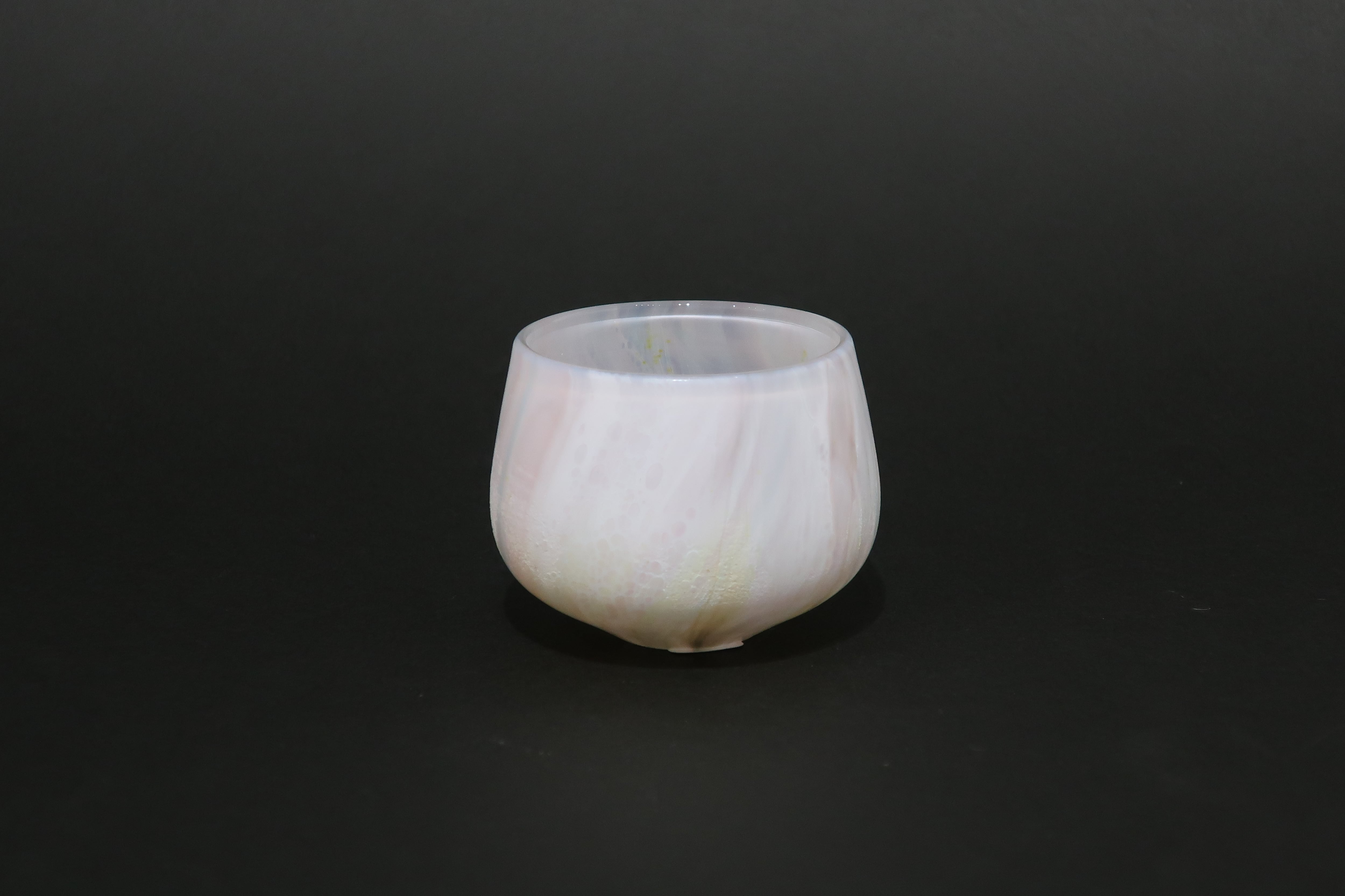 宙吹きガラスの技法の中で、炎、温度、時間、色、それぞれのある条件が重なって生まれる表情は唯一のものです。 流れる色や沸き立つ模様は絵の具のようにも見え、器の形をキャンバスに絵を描くような気持ちで制作しました。