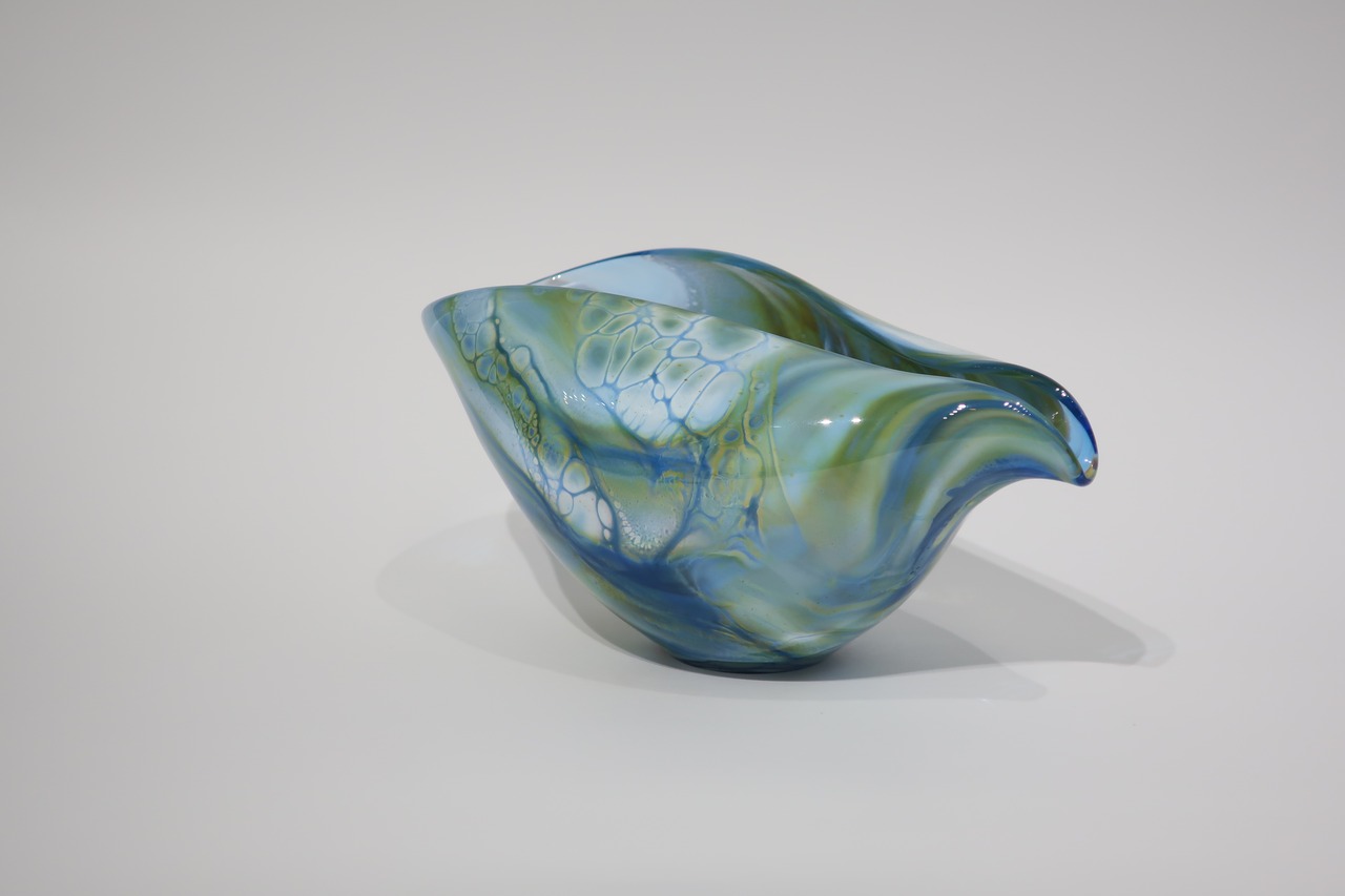 宙吹きガラスの技法の中で、炎、温度、時間、色、それぞれのある条件が重なって生まれる表情は唯一のものです。 流れる色や沸き立つ模様は絵の具のようにも見え、器の形をキャンバスに絵を描くような気持ちで制作しました。