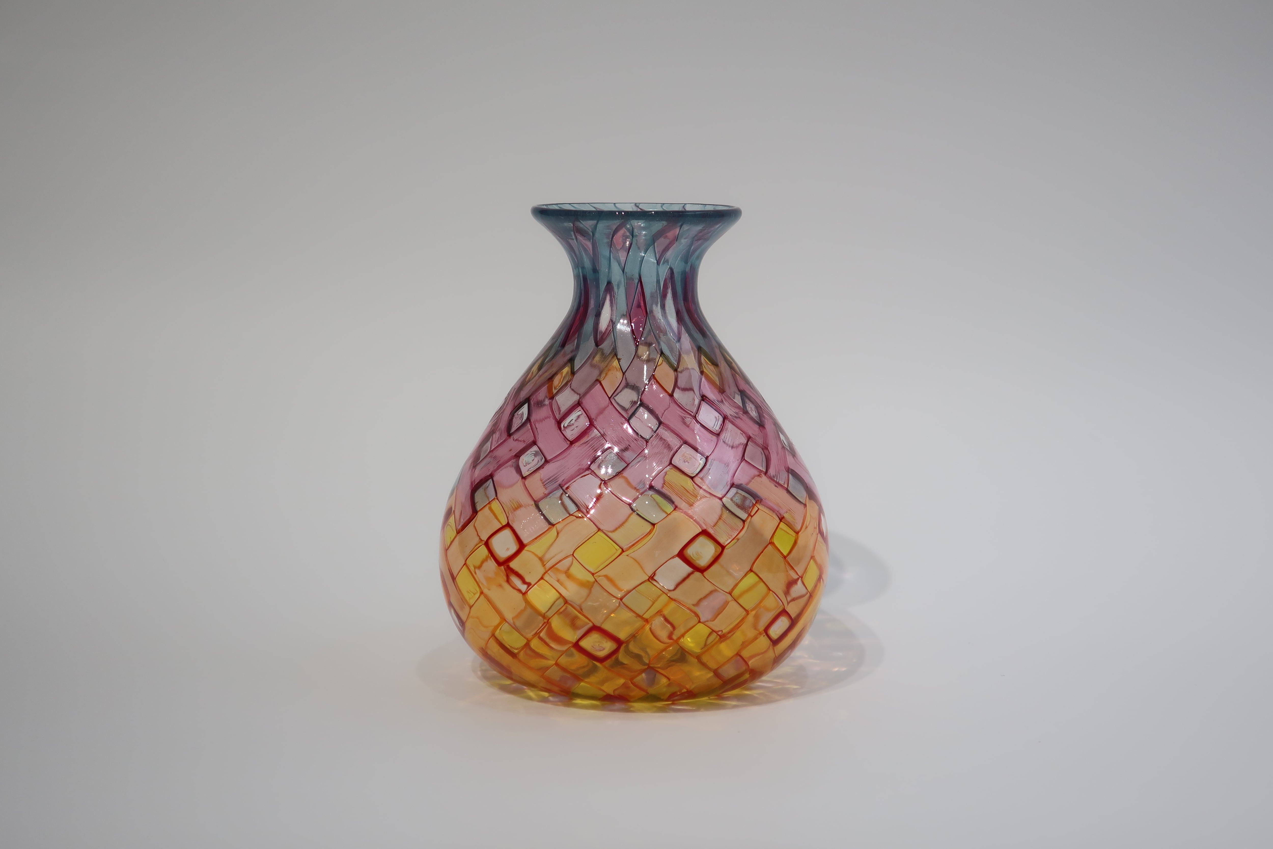 数ミリ角の小さな色ガラスのパーツを並べることで、模様を作り、吹きガラスの技法で成形しています。