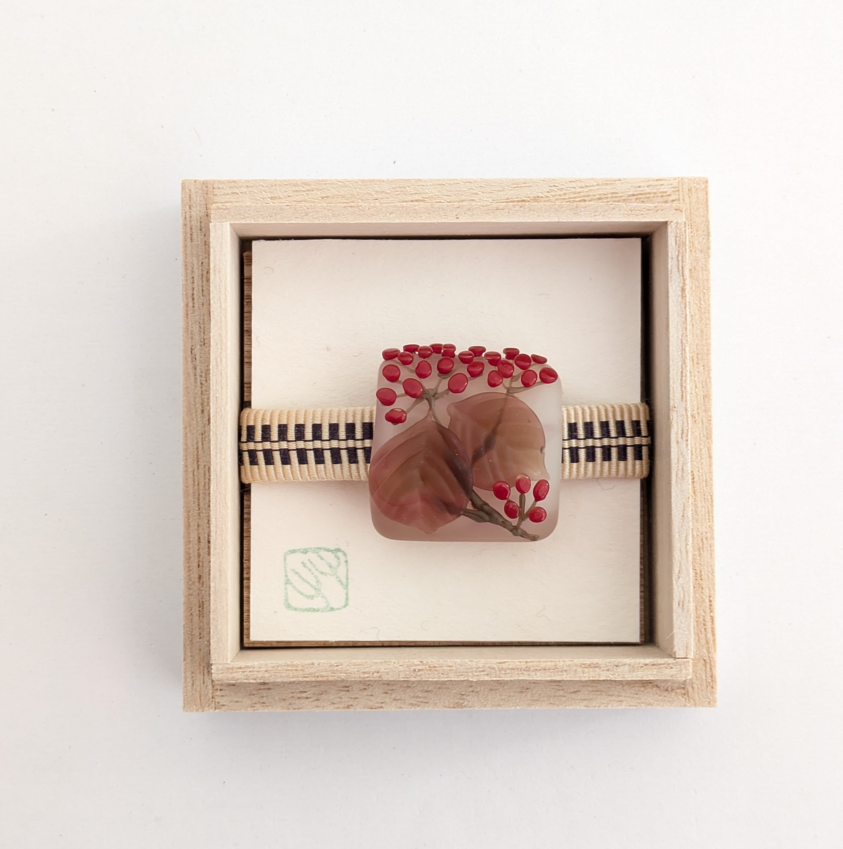 これらはコアガラスと呼ばれる技法です。その技法を用いて、身近な草木花を立体的に表し、四季折々の空気が感じられる作品を手掛けています。