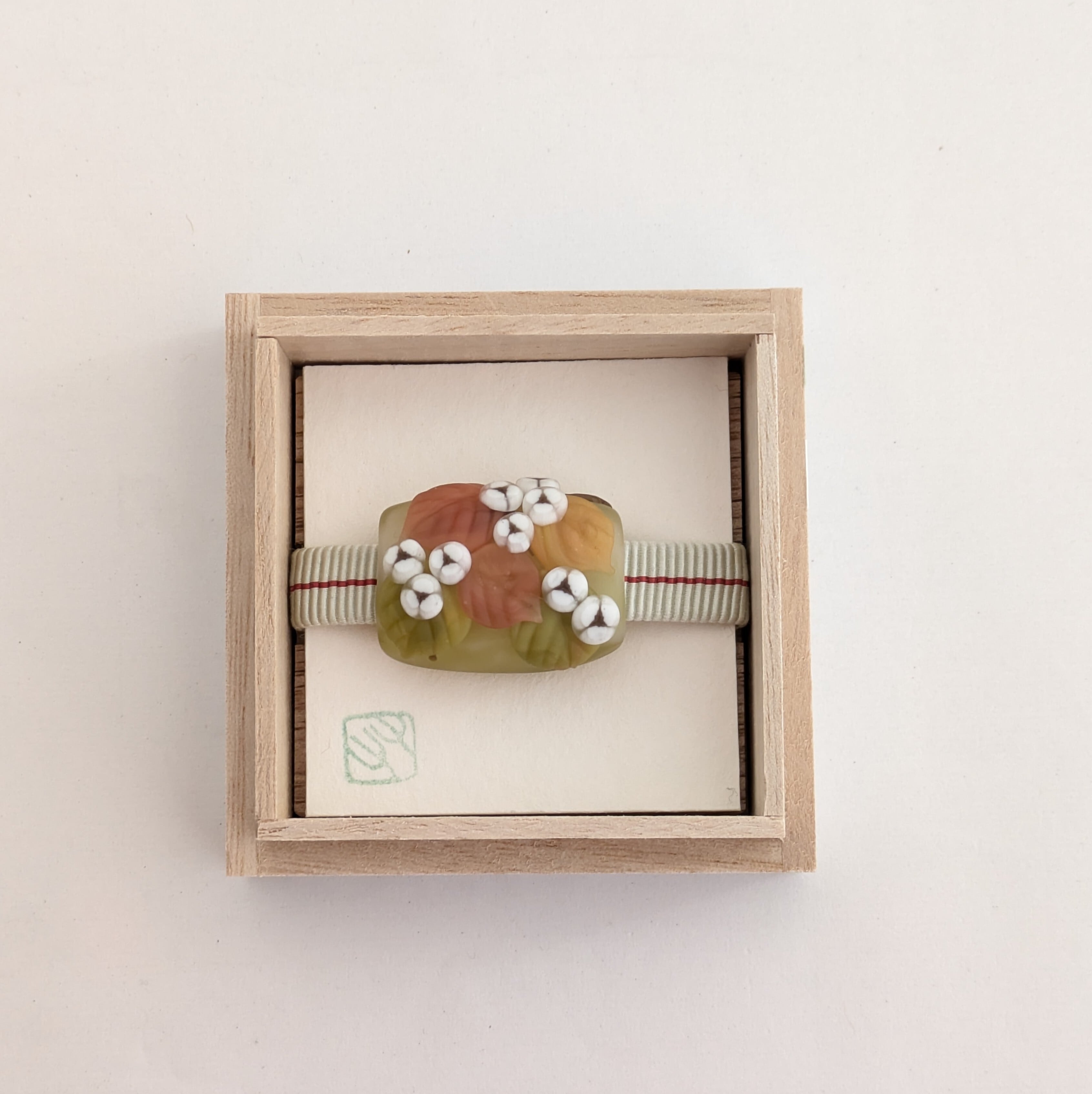 これらはコアガラスと呼ばれる技法です。その技法を用いて、身近な草木花を立体的に表し、四季折々の空気が感じられる作品を手掛けています。
