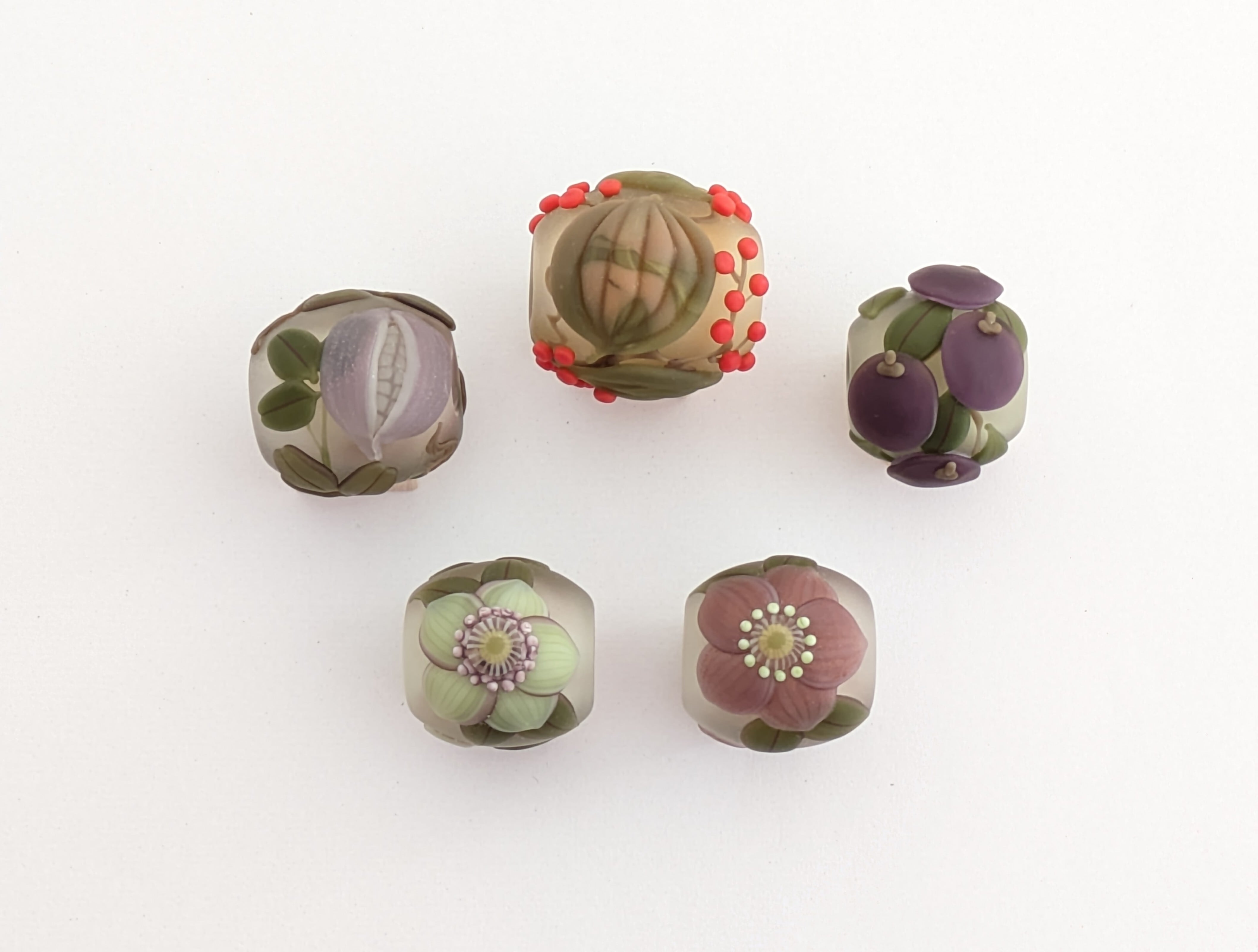 これらはコアガラスと呼ばれる技法です。その技法を用いて、身近な草木花を立体的に表し、四季折々の空気が感じられる作品を手掛けています。