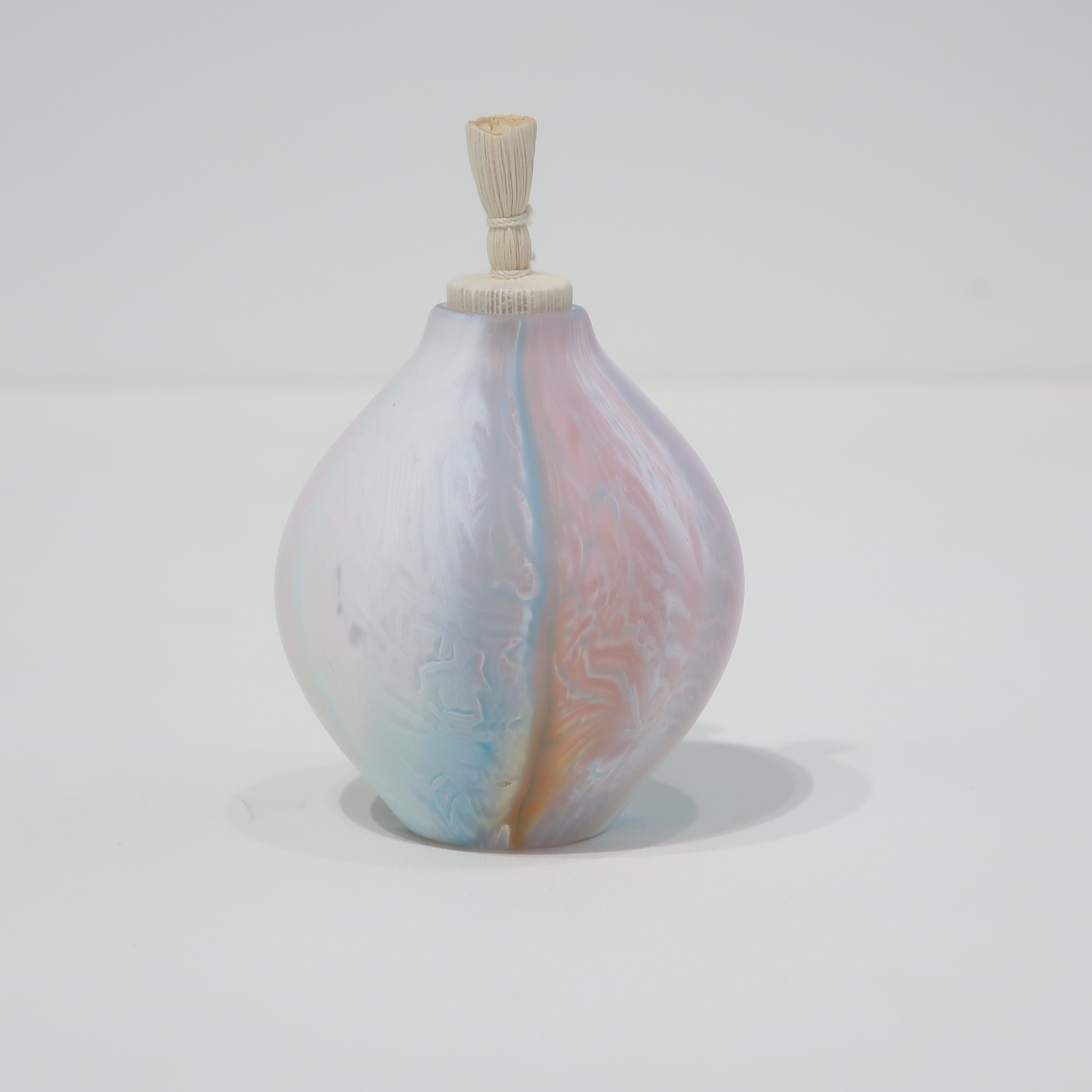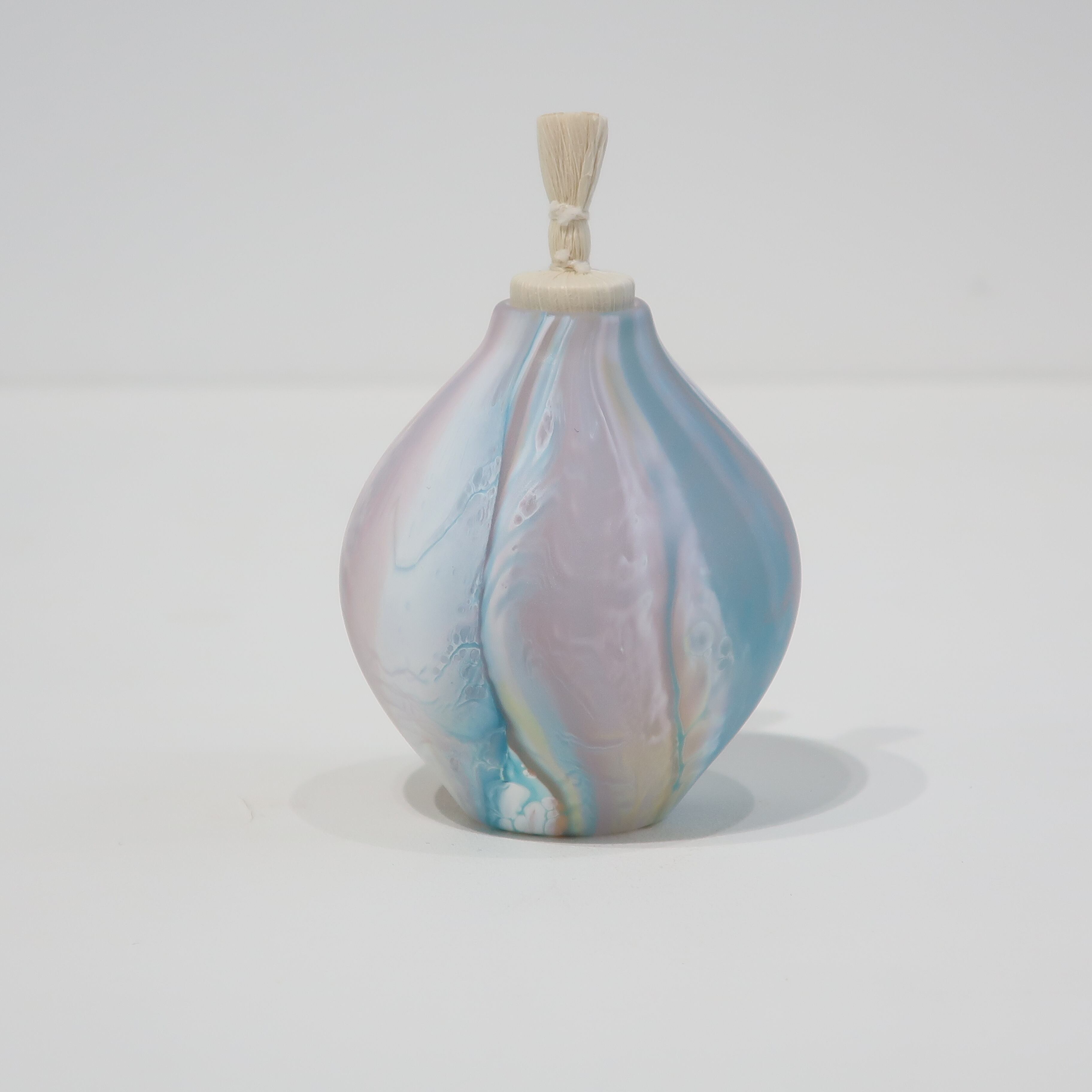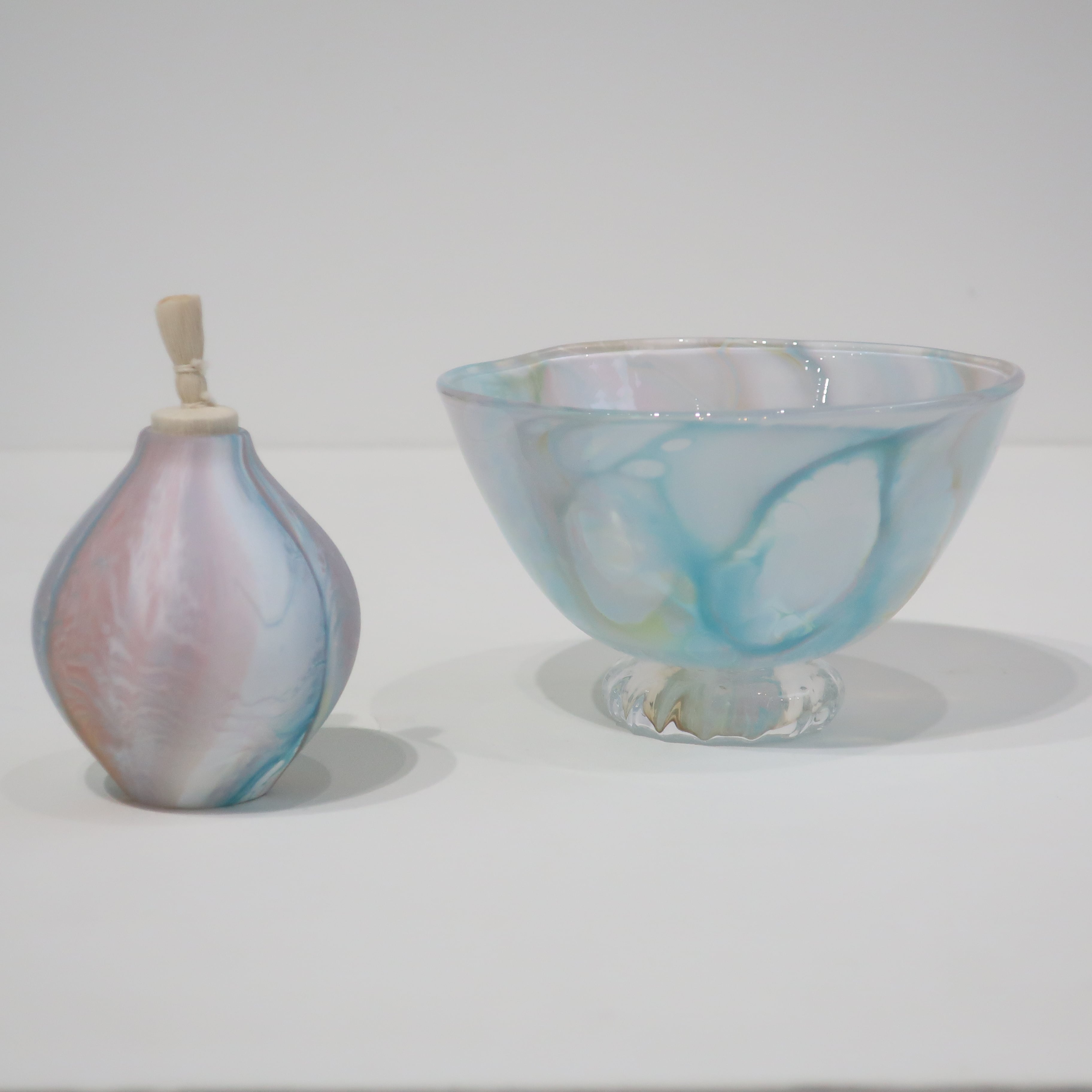 宙吹きガラスの技法の中で、炎、温度、時間、色、それぞれのある条件が重なって生まれる表情は唯一のものです。 流れる色や沸き立つ模様は絵の具のようにも見え、器の形をキャンバスに絵を描くような気持ちで制作しました。