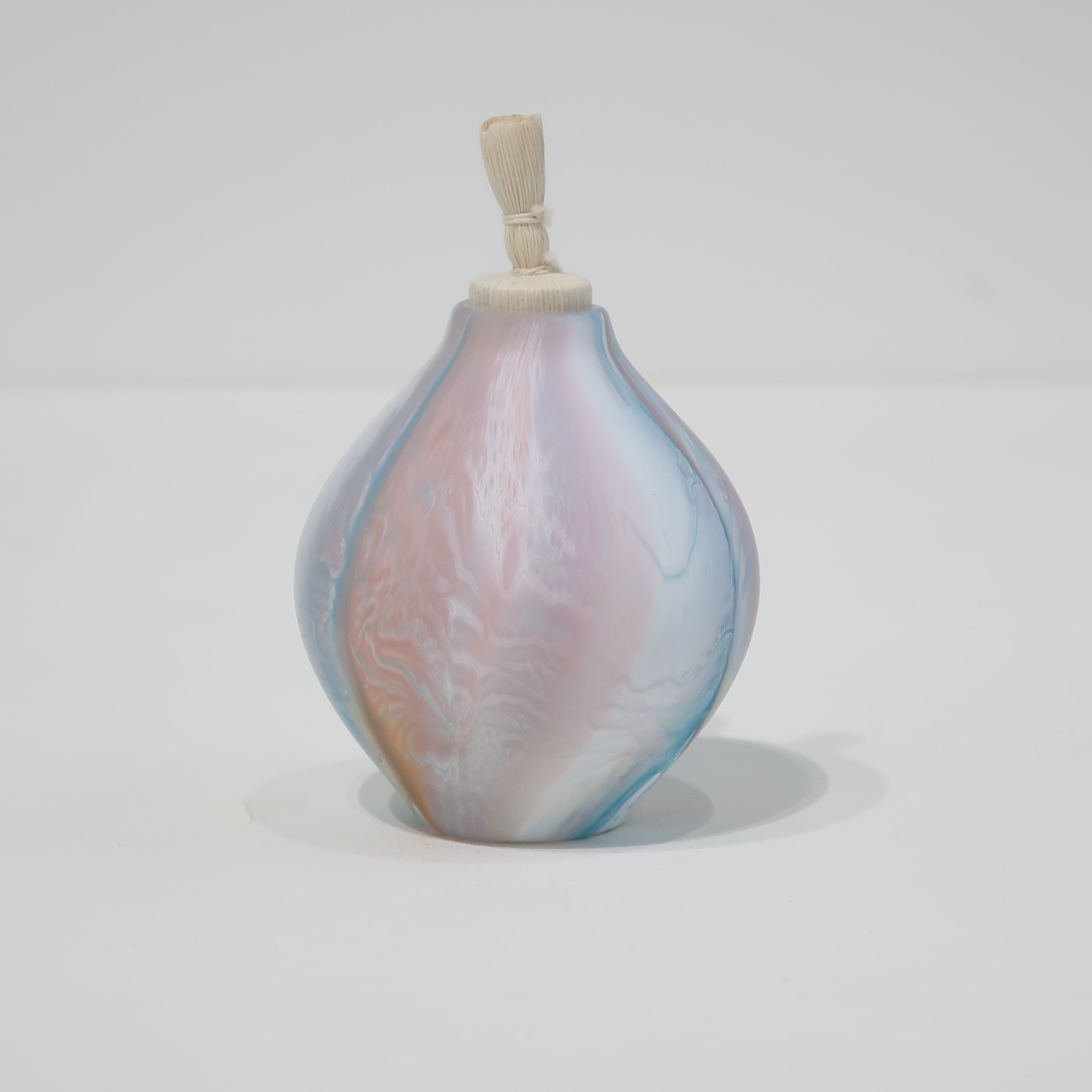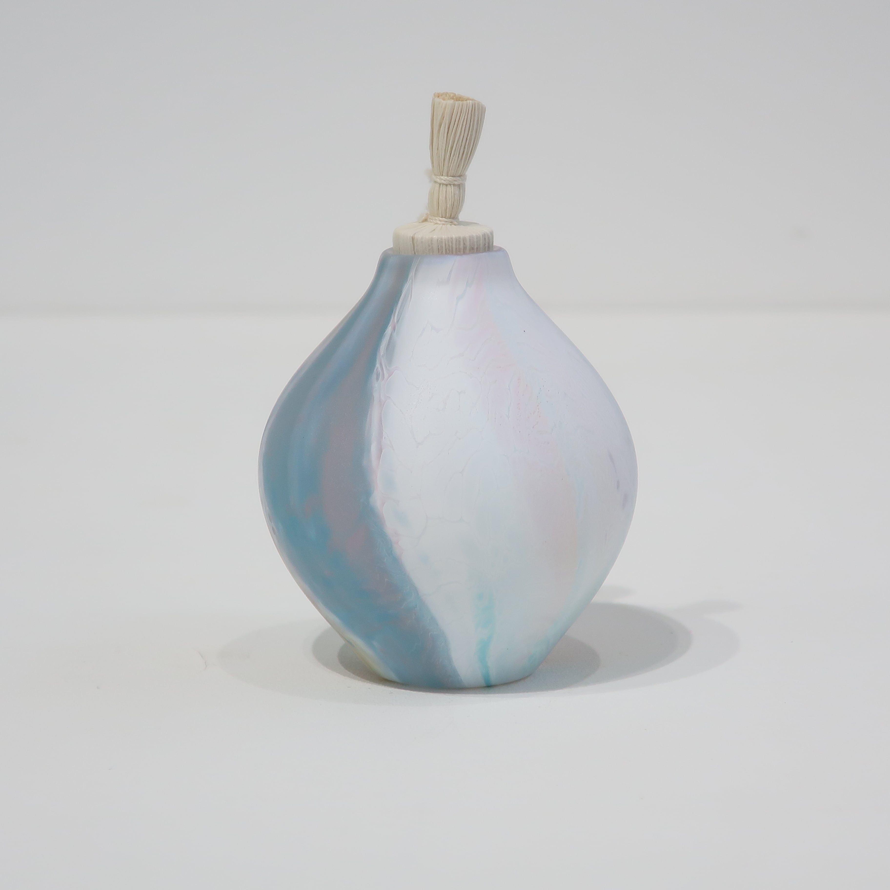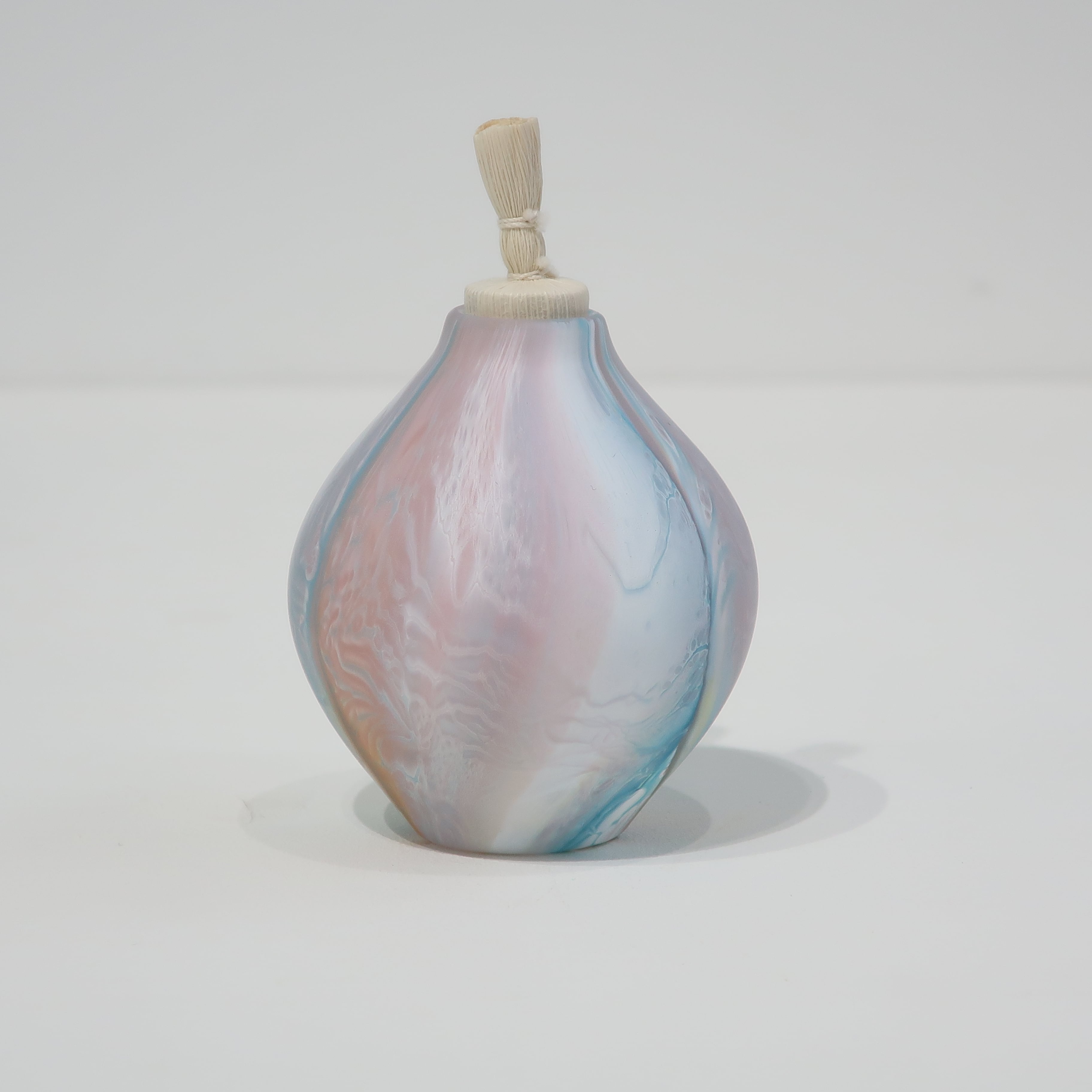 宙吹きガラスの技法の中で、炎、温度、時間、色、それぞれのある条件が重なって生まれる表情は唯一のものです。 流れる色や沸き立つ模様は絵の具のようにも見え、器の形をキャンバスに絵を描くような気持ちで制作しました。