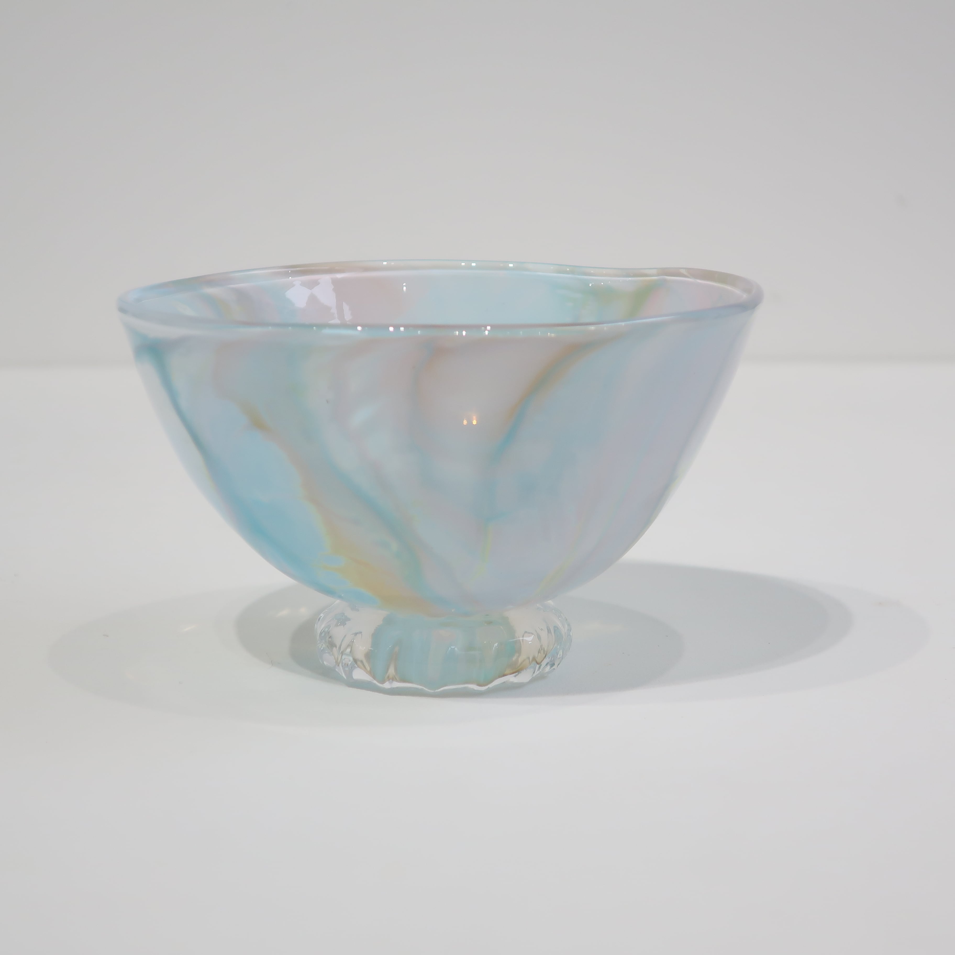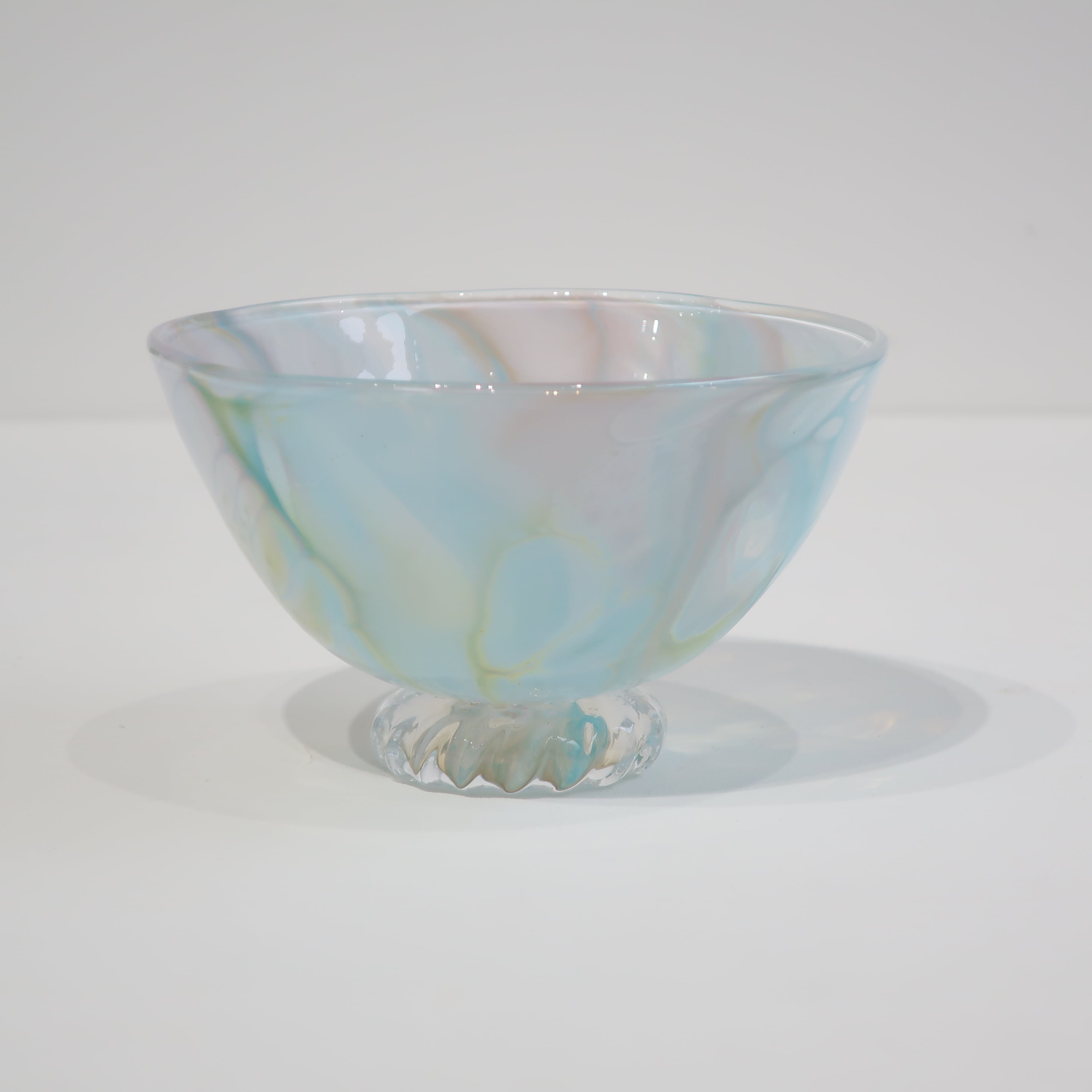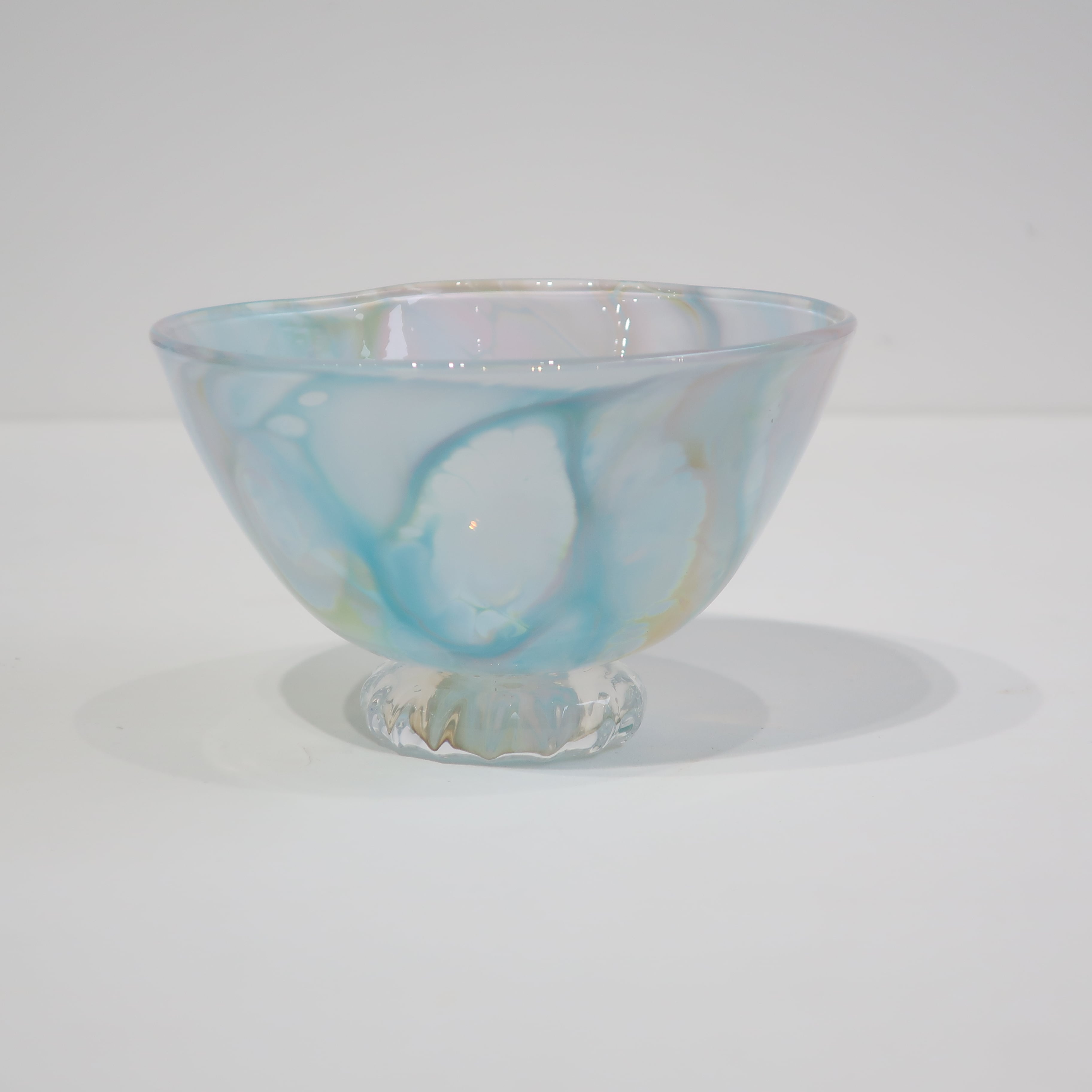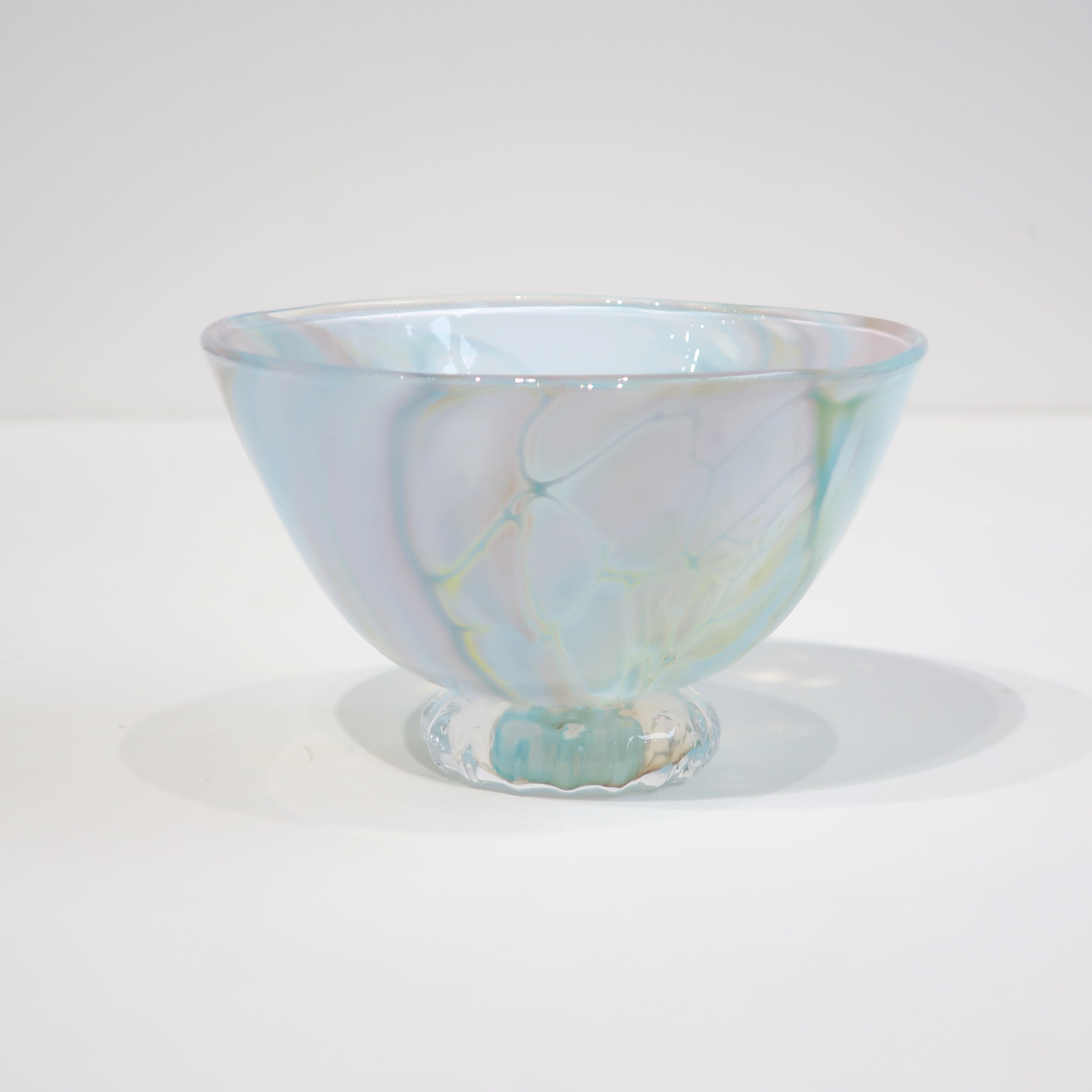 宙吹きガラスの技法の中で、炎、温度、時間、色、それぞれのある条件が重なって生まれる表情は唯一のものです。 流れる色や沸き立つ模様は絵の具のようにも見え、器の形をキャンバスに絵を描くような気持ちで制作しました。