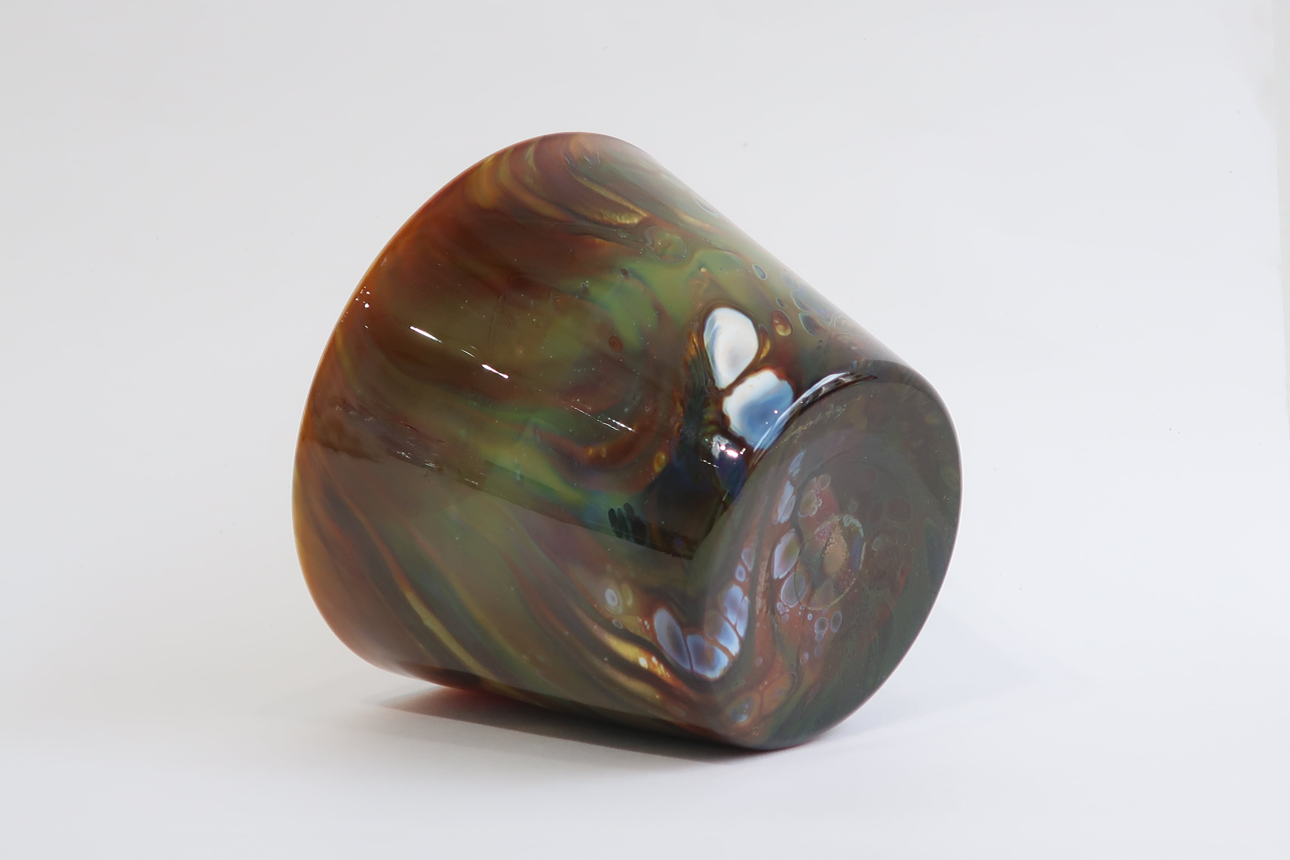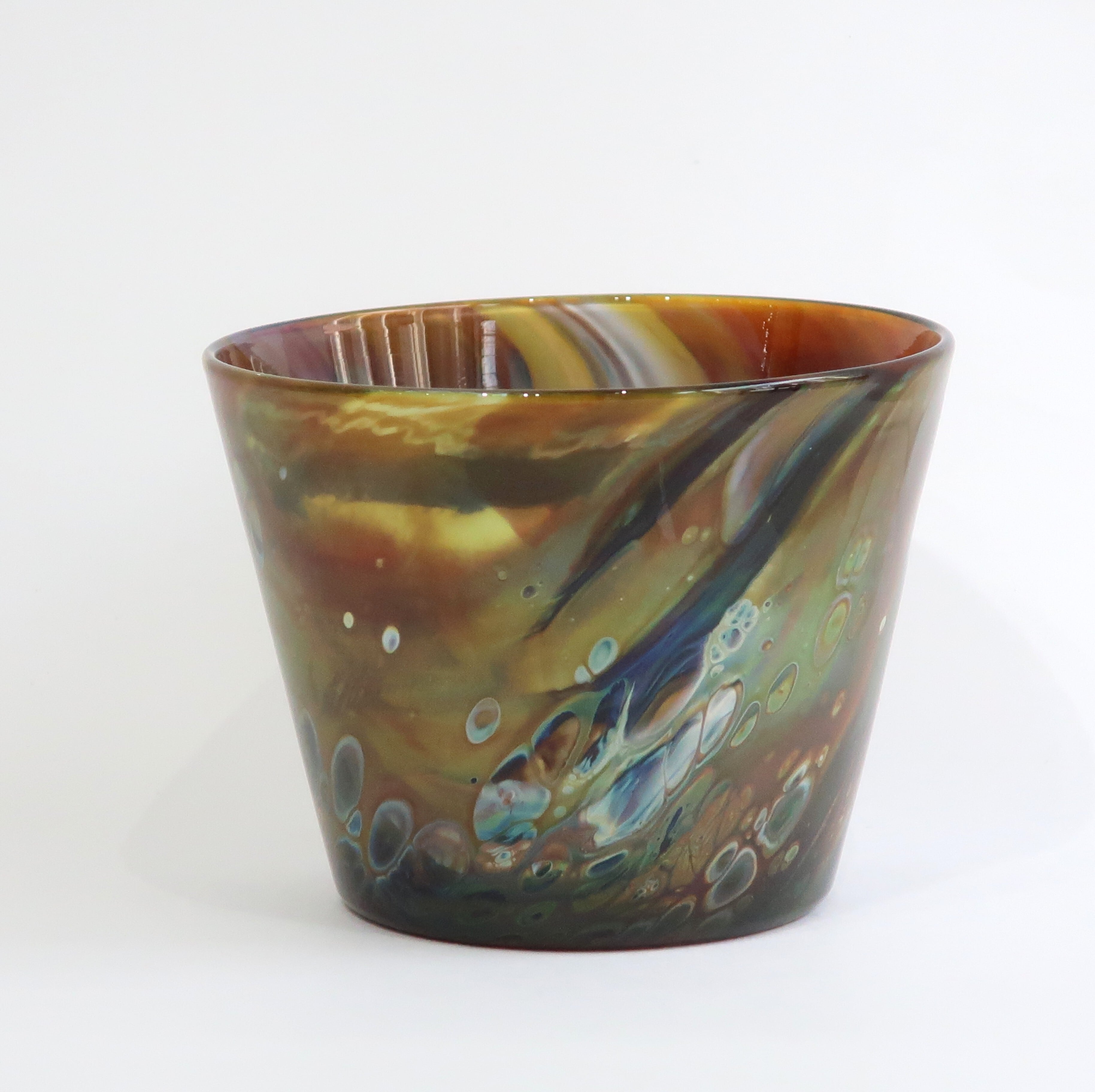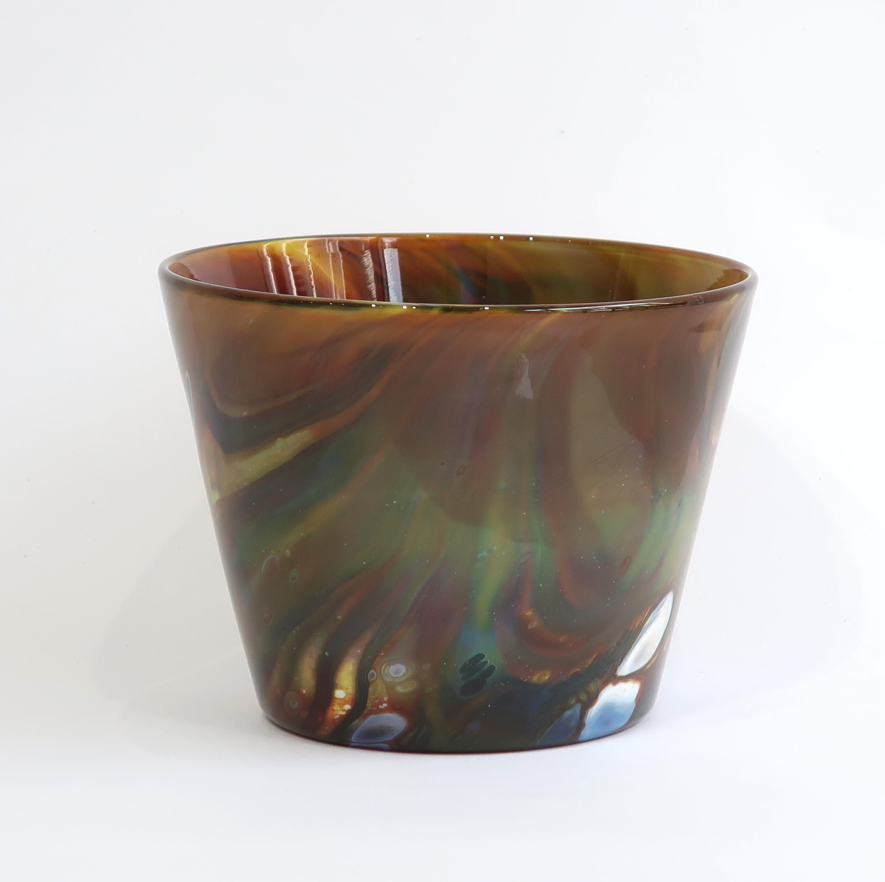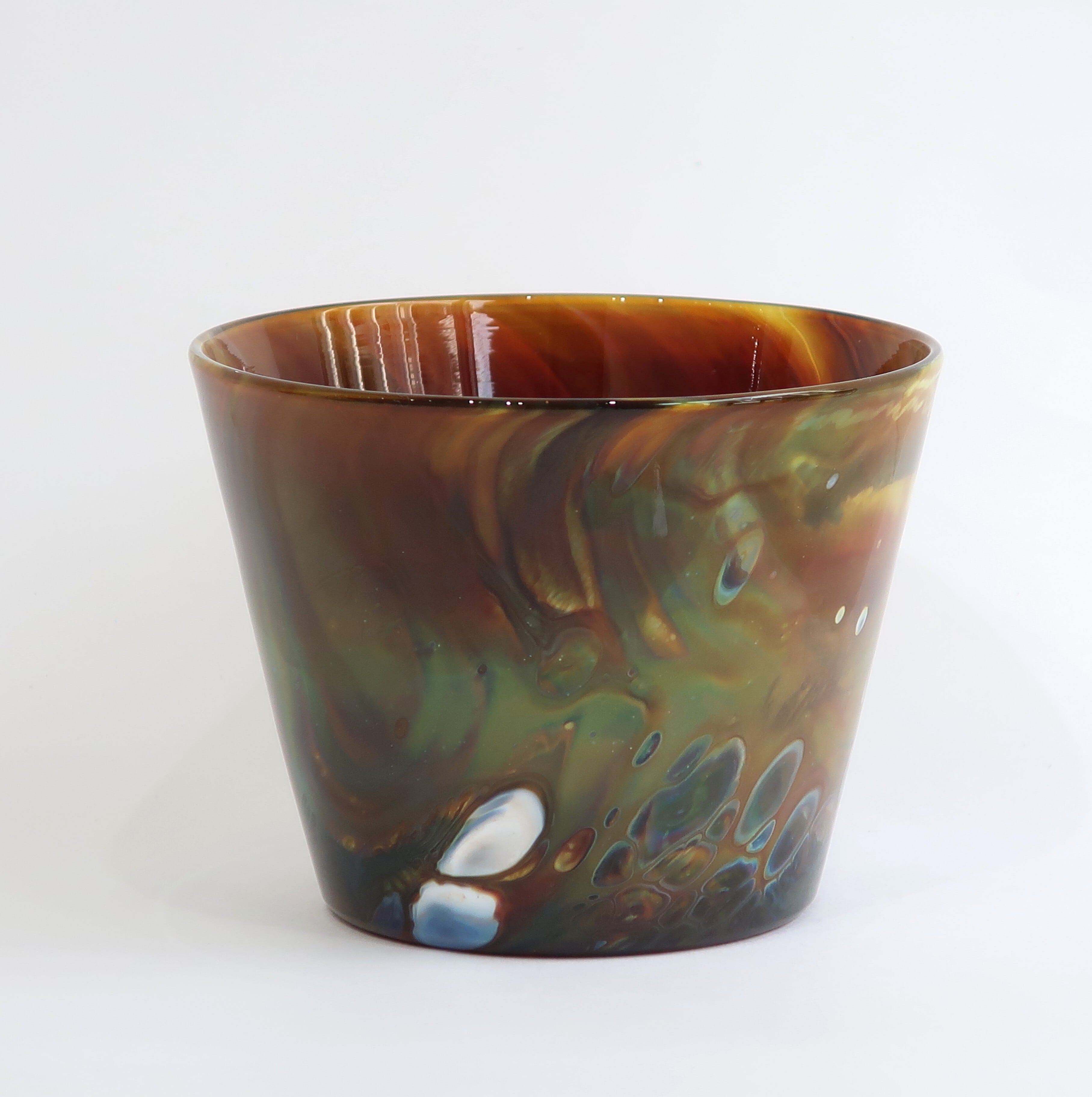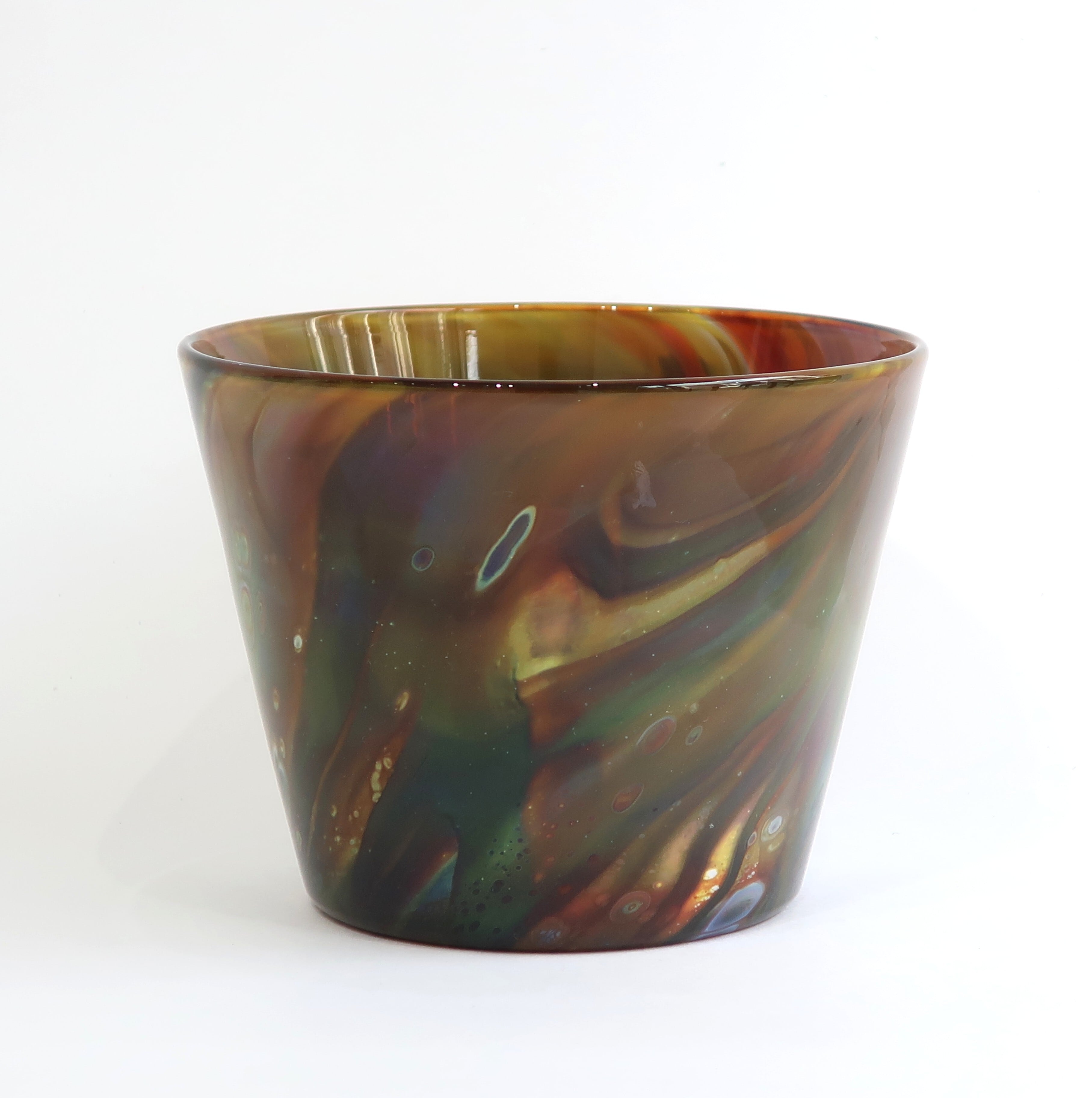 宙吹きガラスの技法の中で、炎、温度、時間、色、それぞれのある条件が重なって生まれる表情は唯一のものです。 流れる色や沸き立つ模様は絵の具のようにも見え、器の形をキャンバスに絵を描くような気持ちで制作しました。
