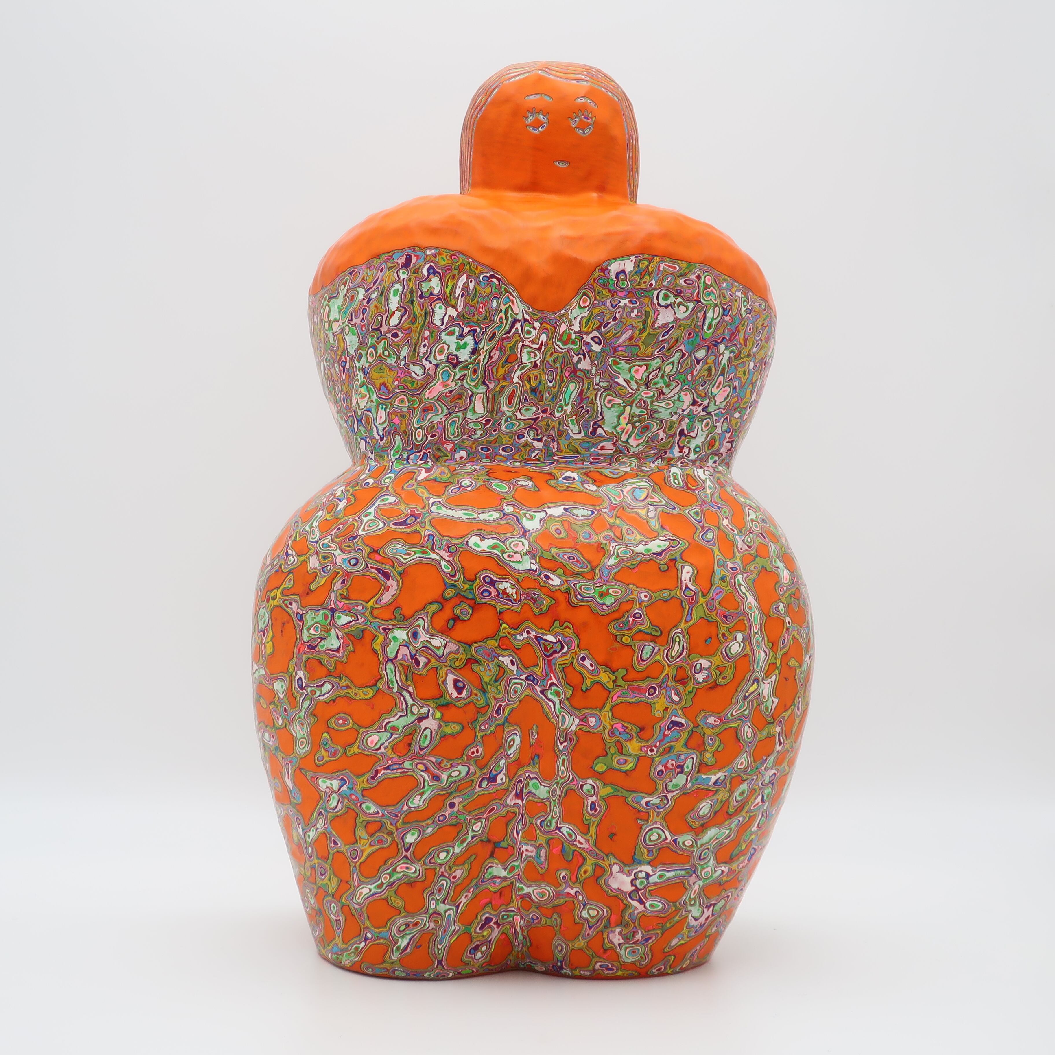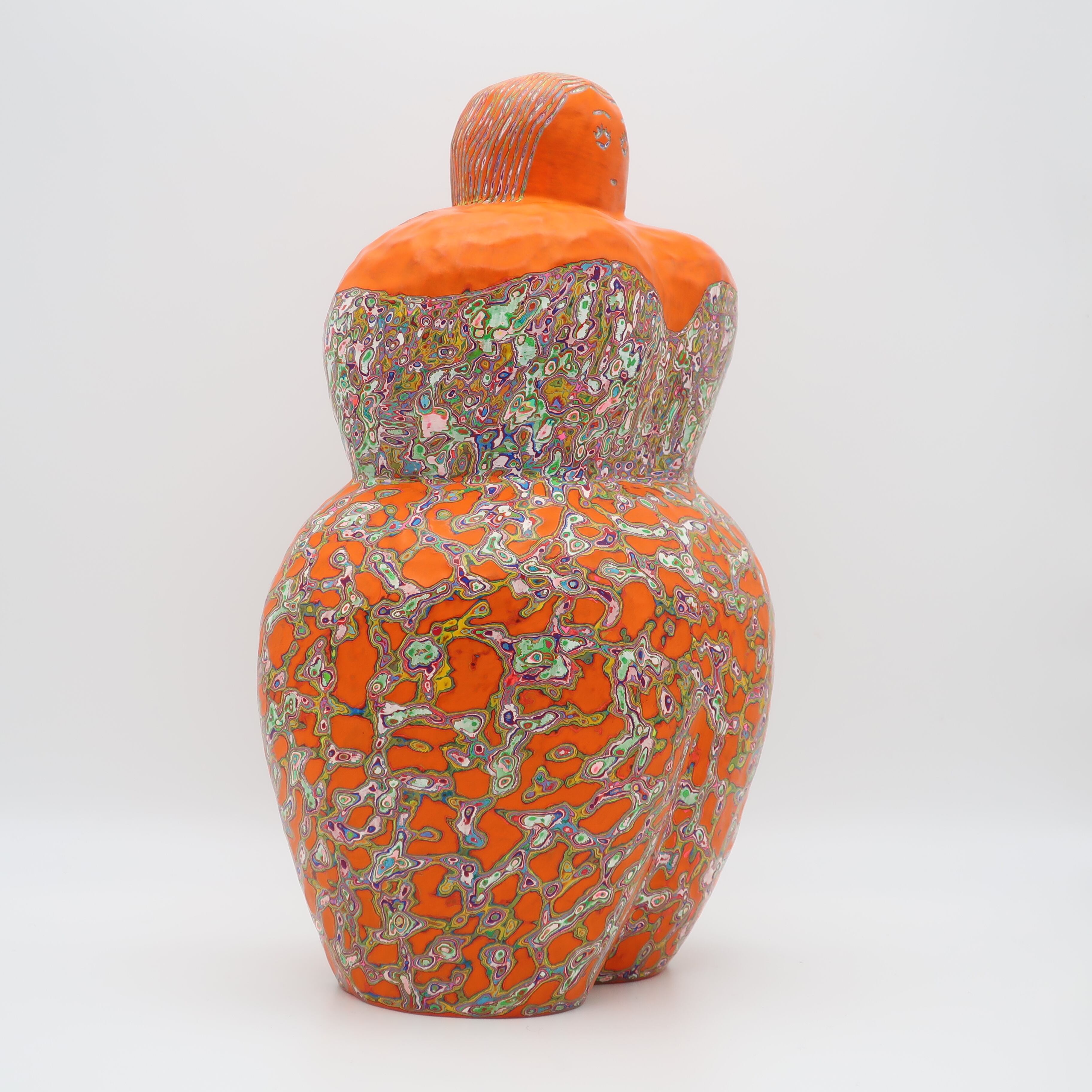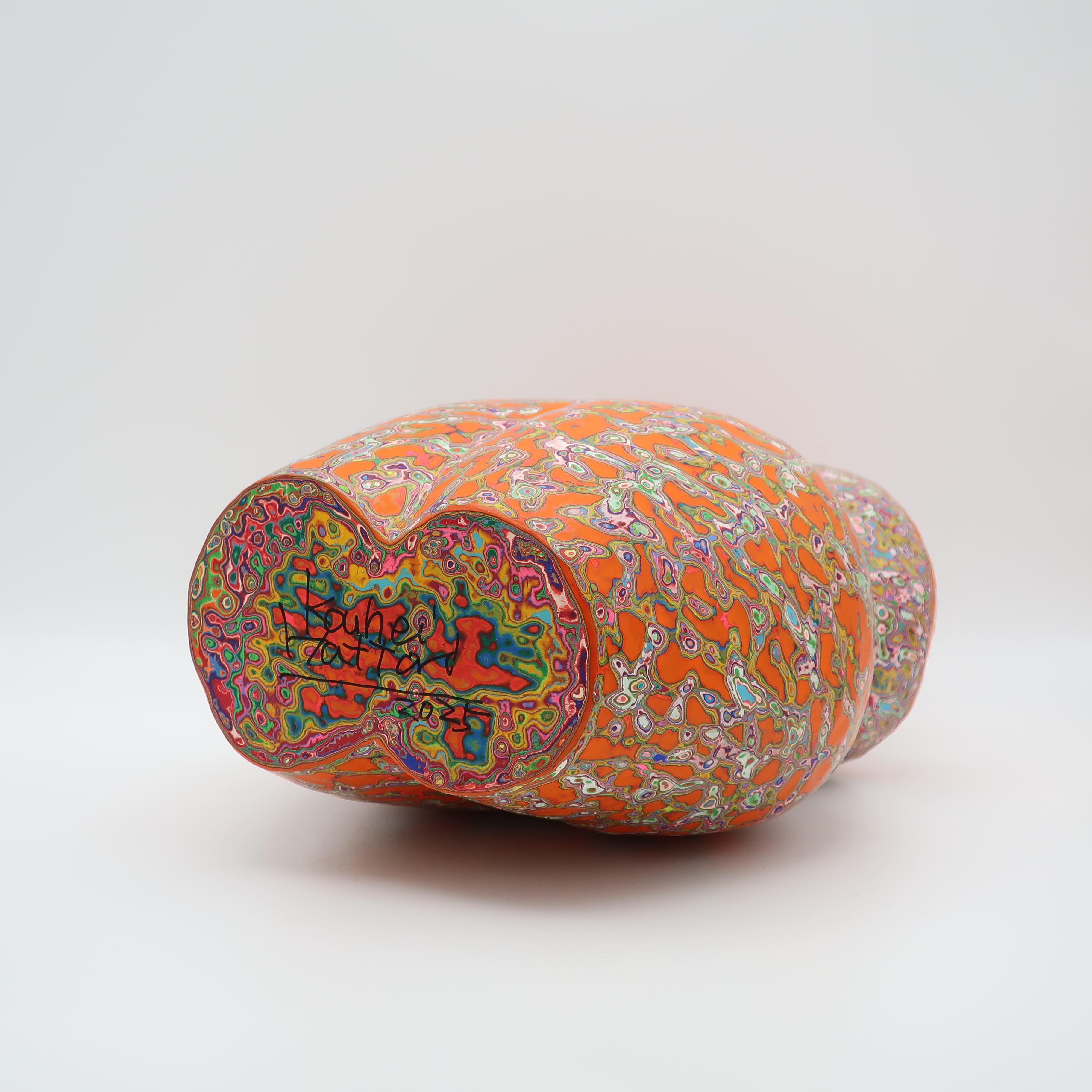 『COLOR SCULPTURE(色彩彫刻)』というオリジナルの手法で制作された木彫作品は、ポップでカラフルな見た目の奥に重層的なレイヤーが現れます。