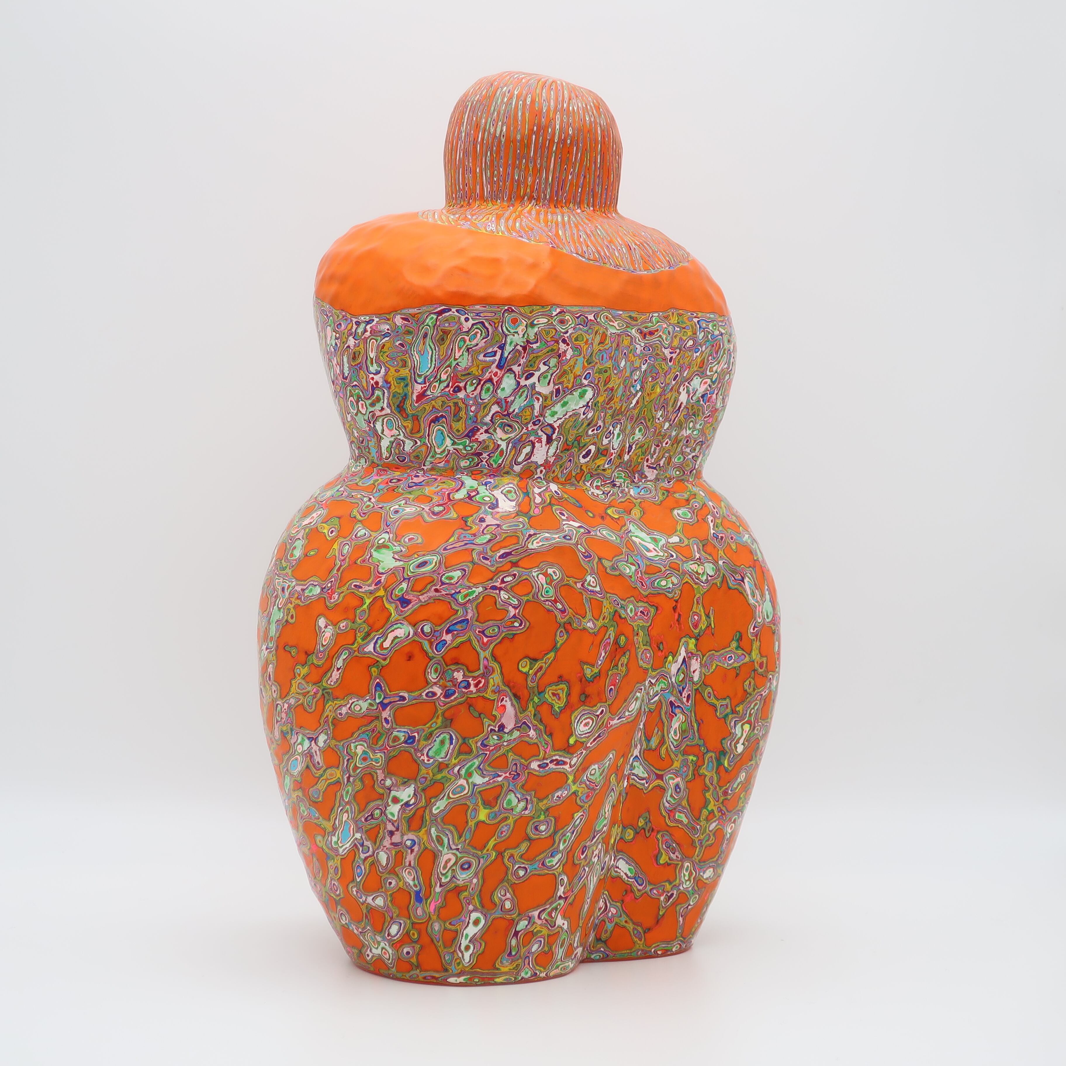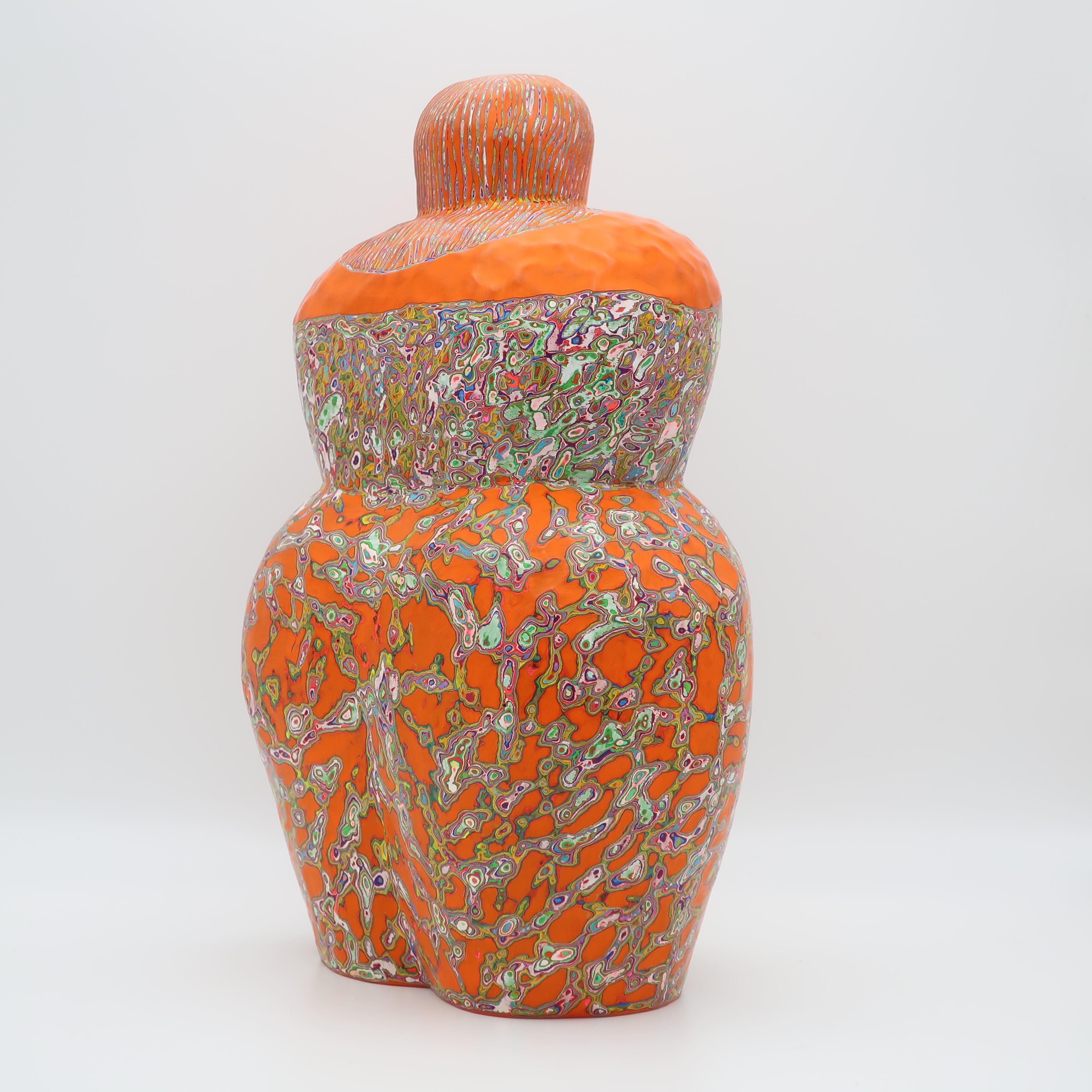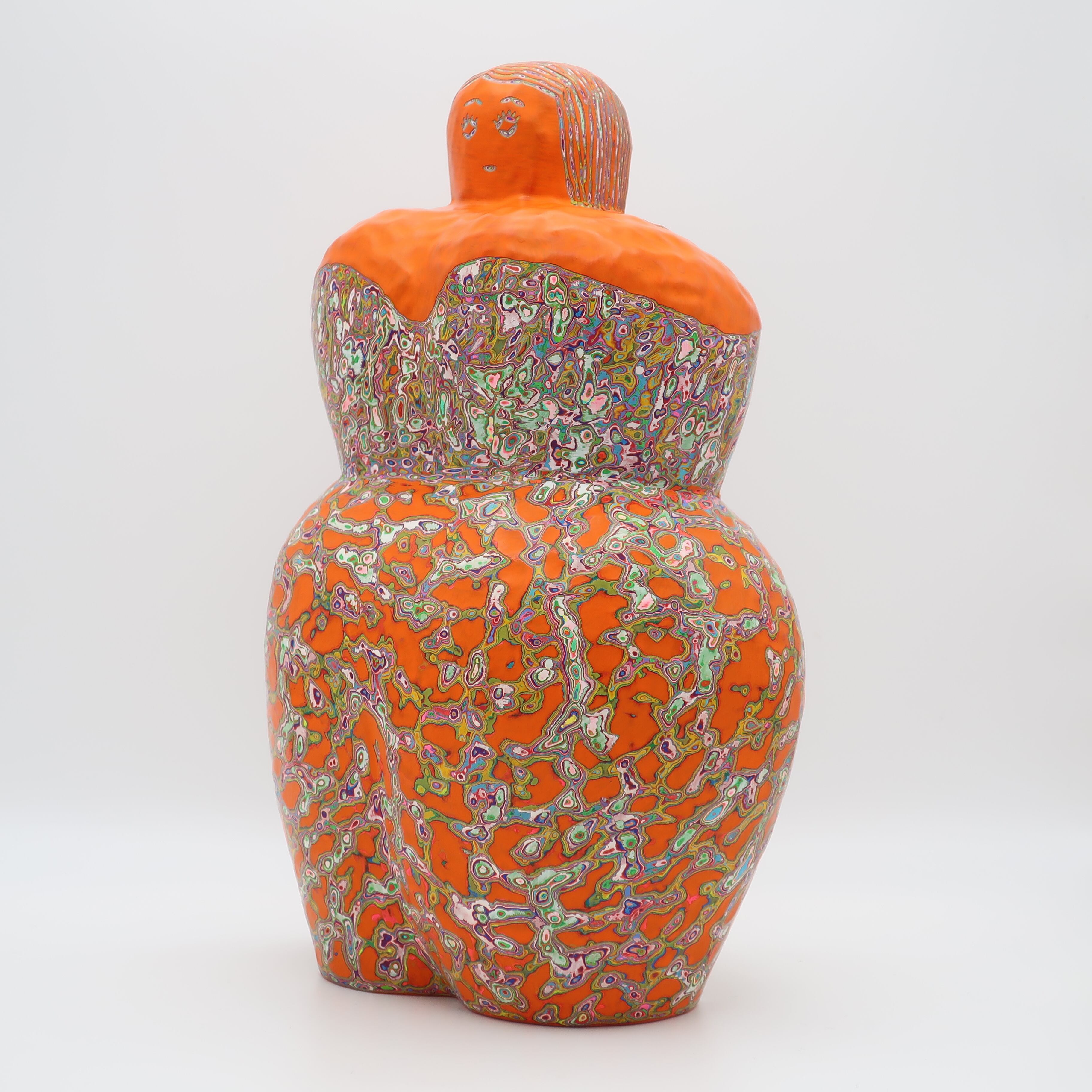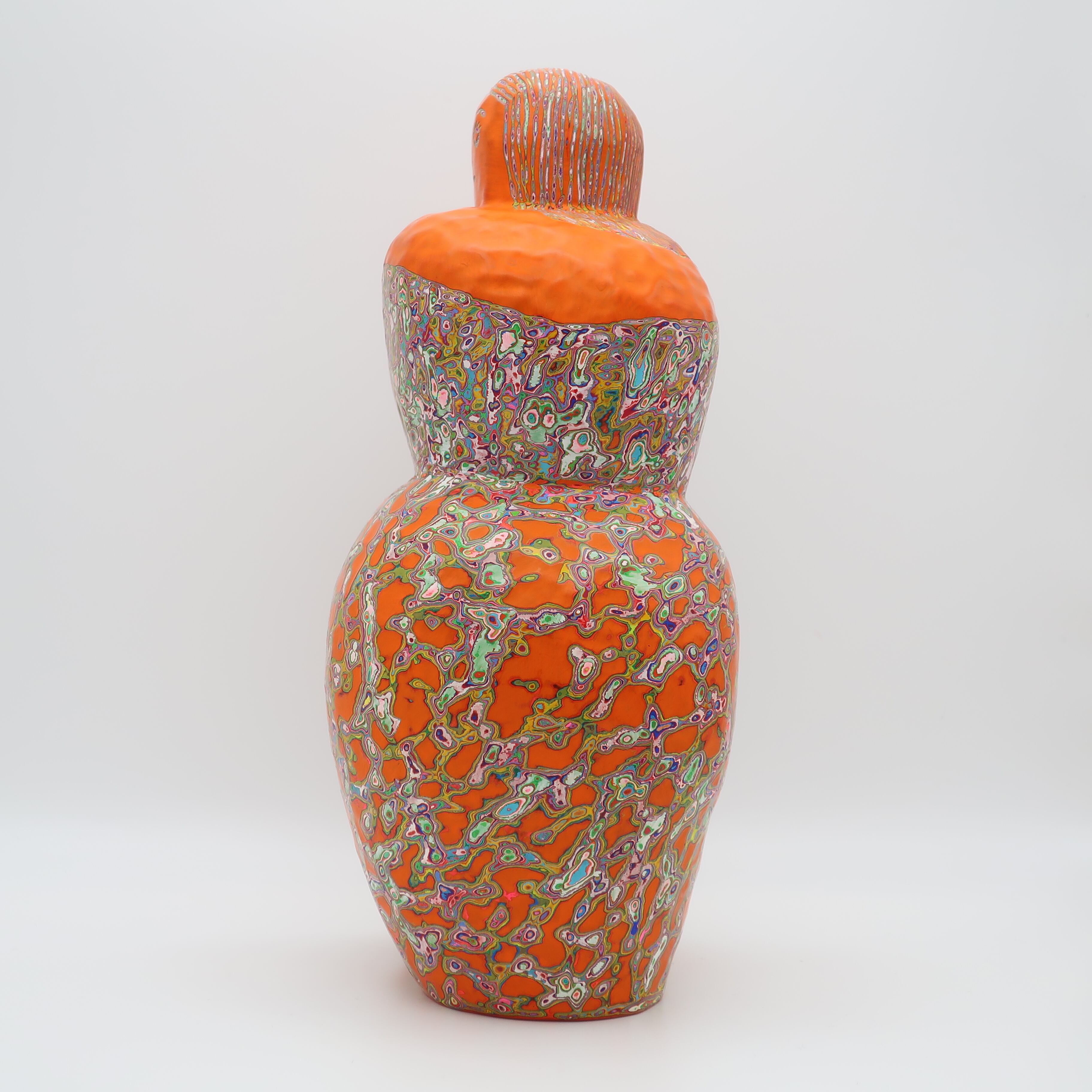 『COLOR SCULPTURE(色彩彫刻)』というオリジナルの手法で制作された木彫作品は、ポップでカラフルな見た目の奥に重層的なレイヤーが現れます。