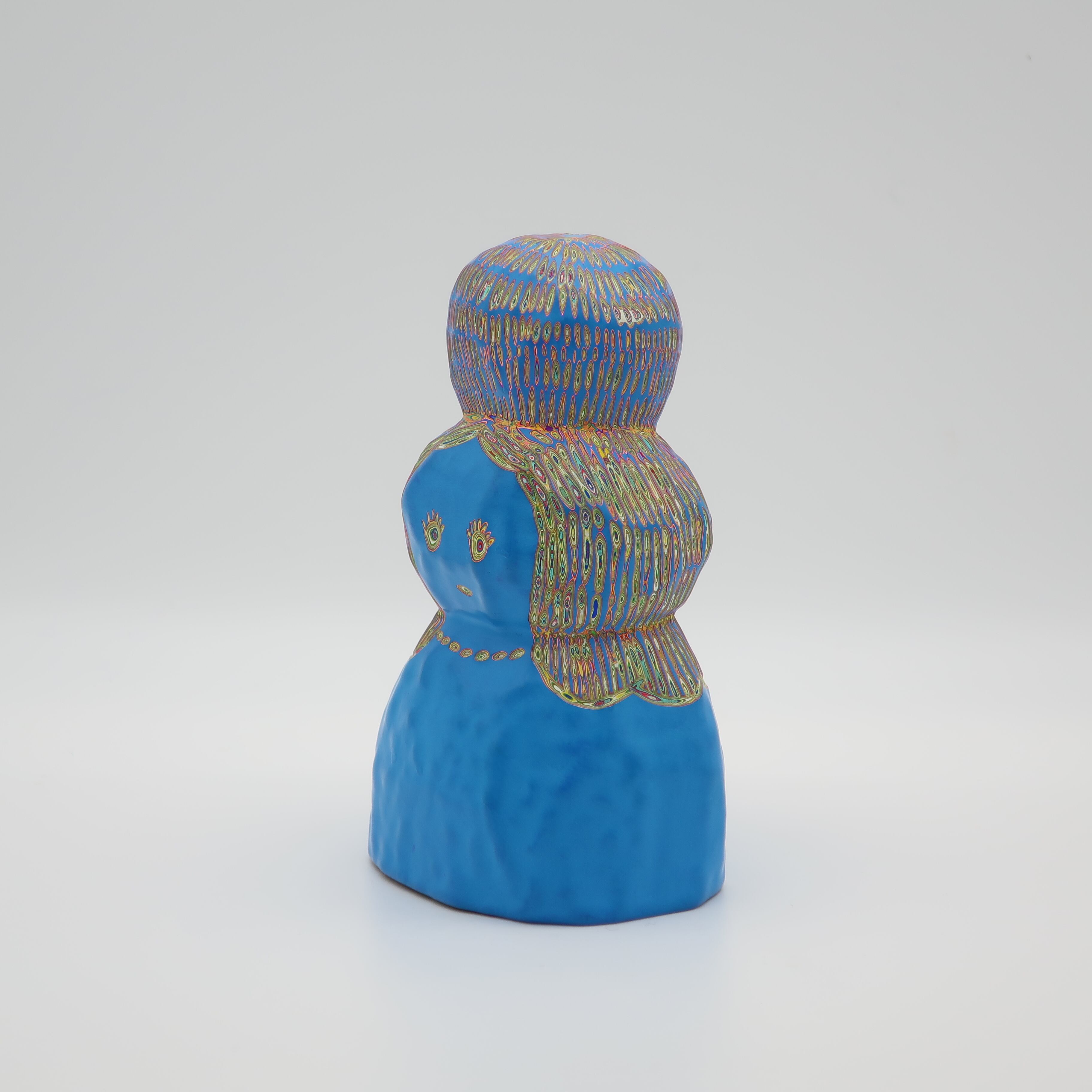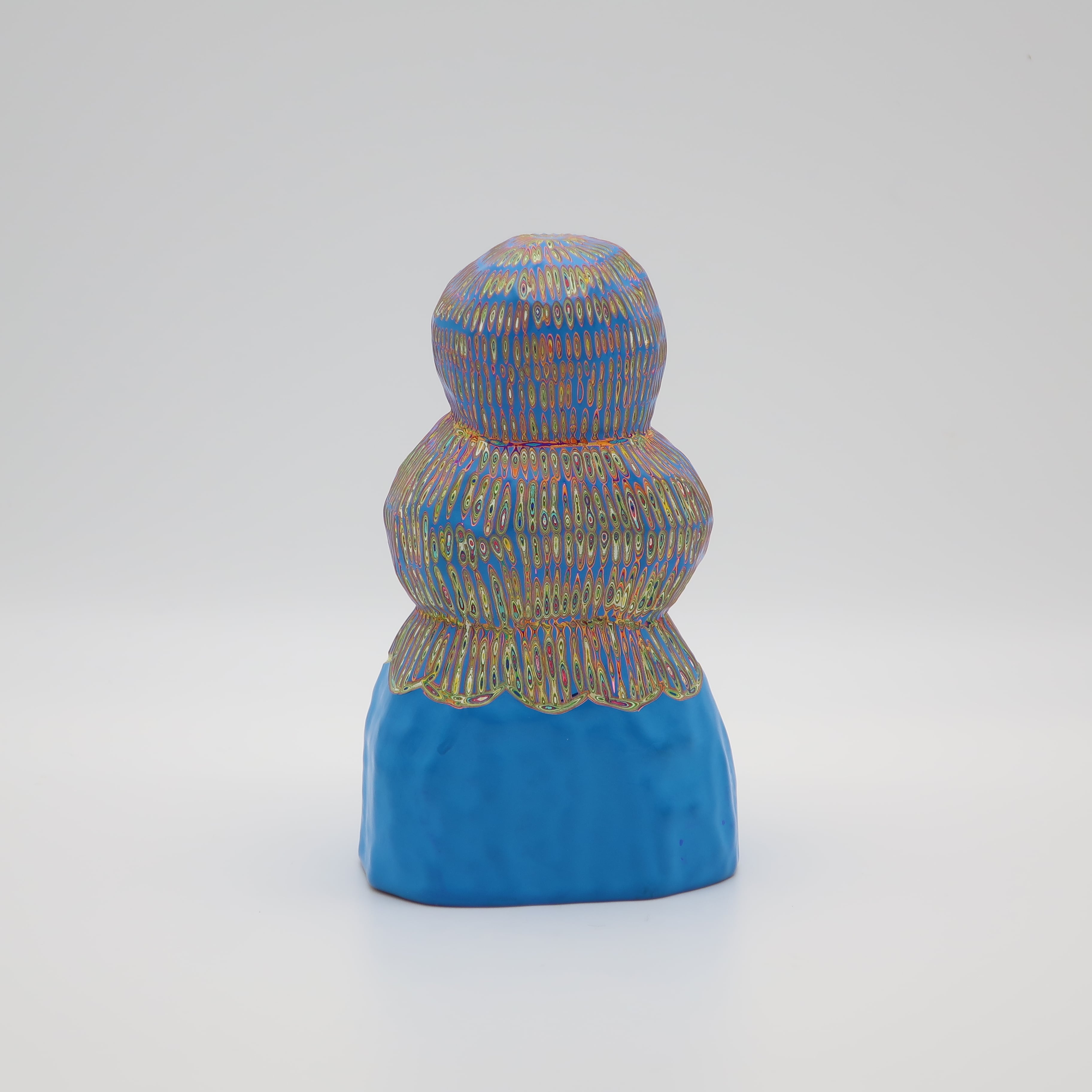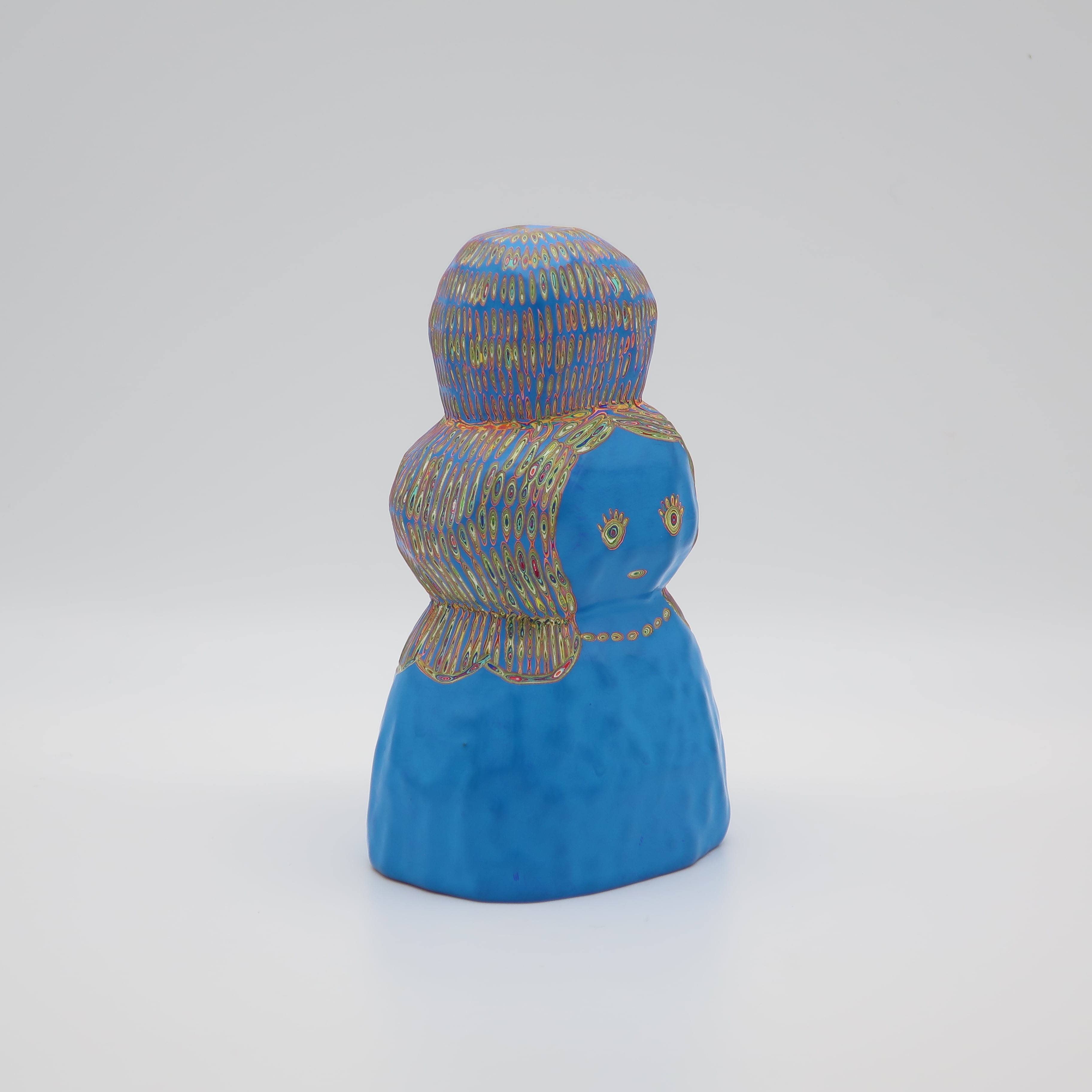 『COLOR SCULPTURE(色彩彫刻)』というオリジナルの手法で制作された木彫作品は、ポップでカラフルな見た目の奥に重層的なレイヤーが現れます。