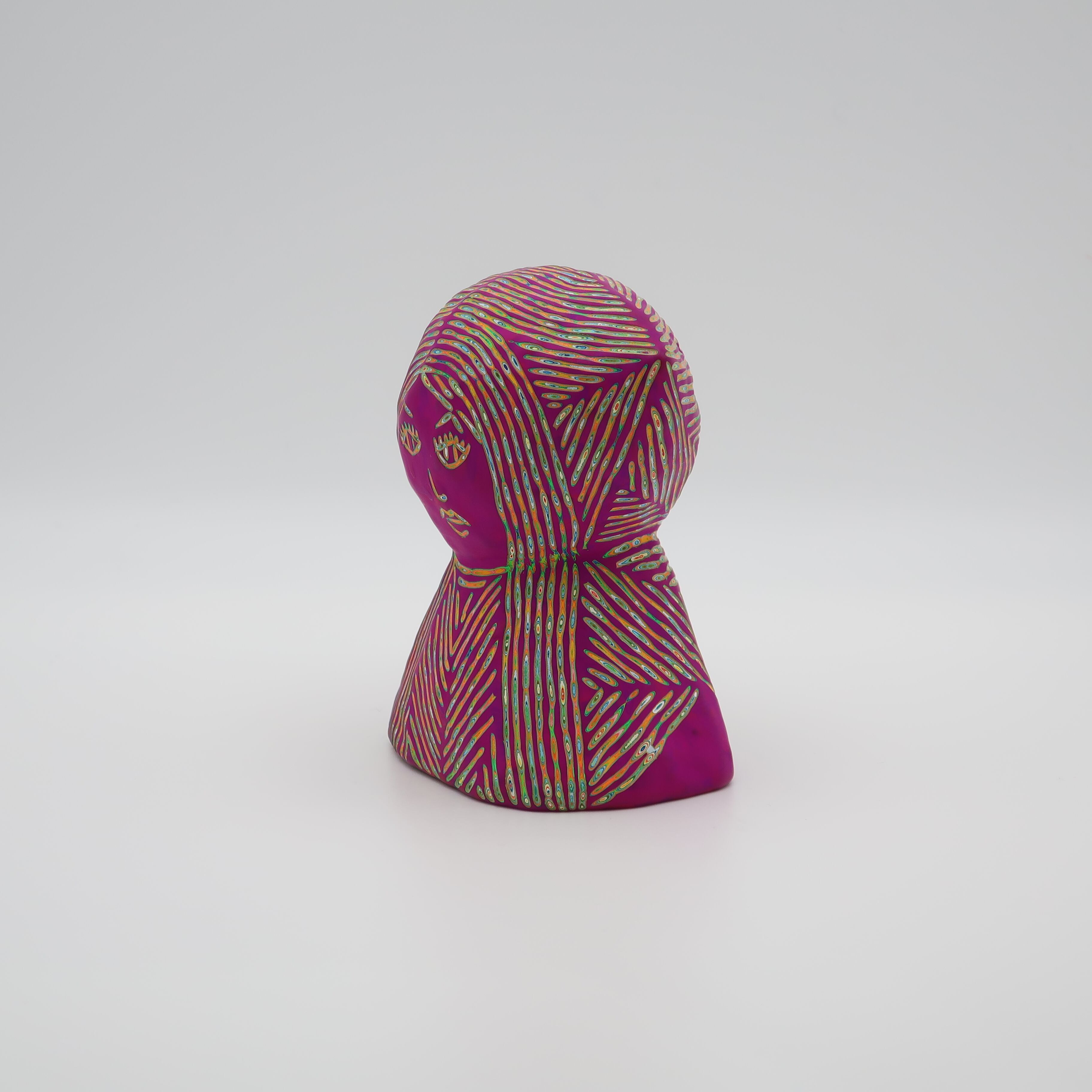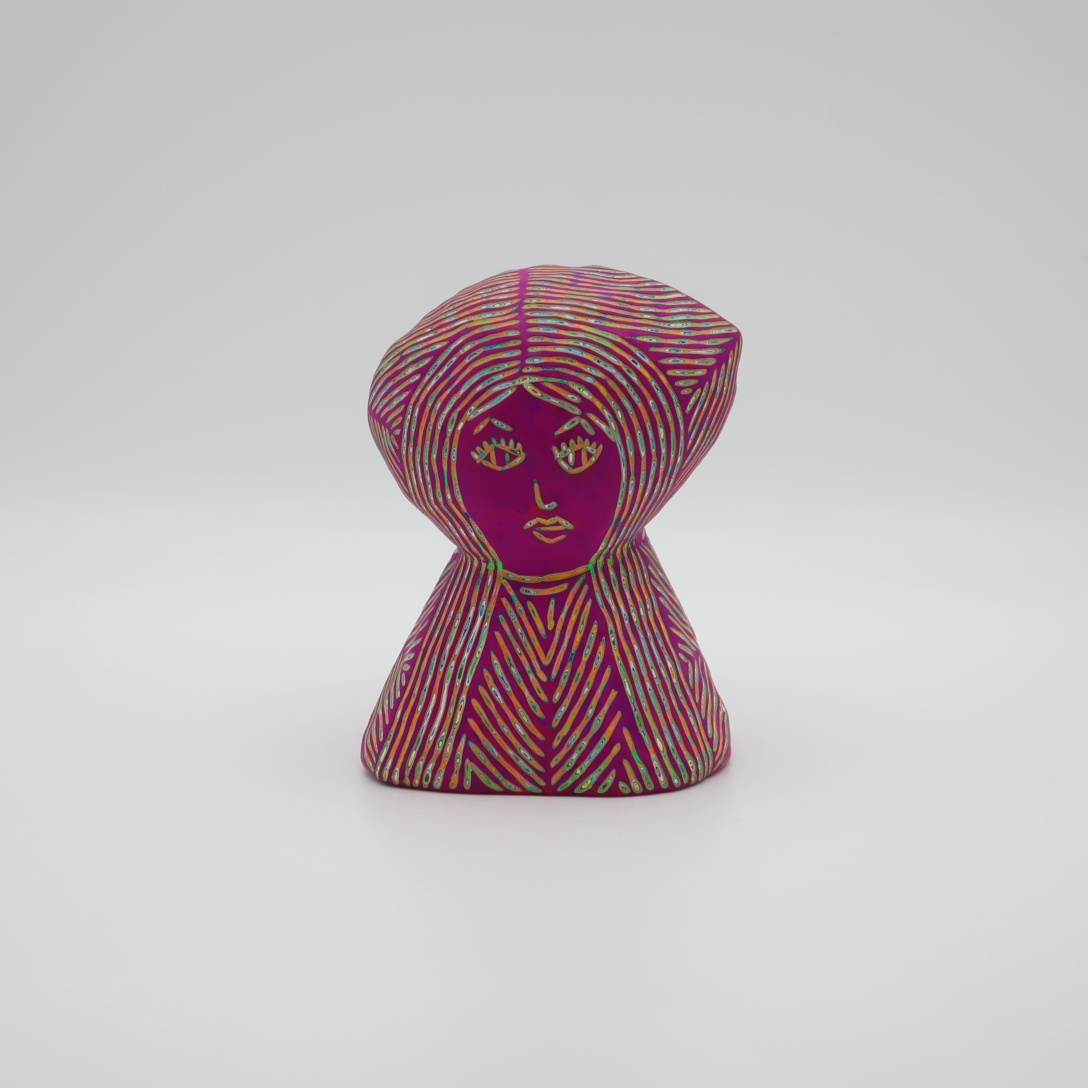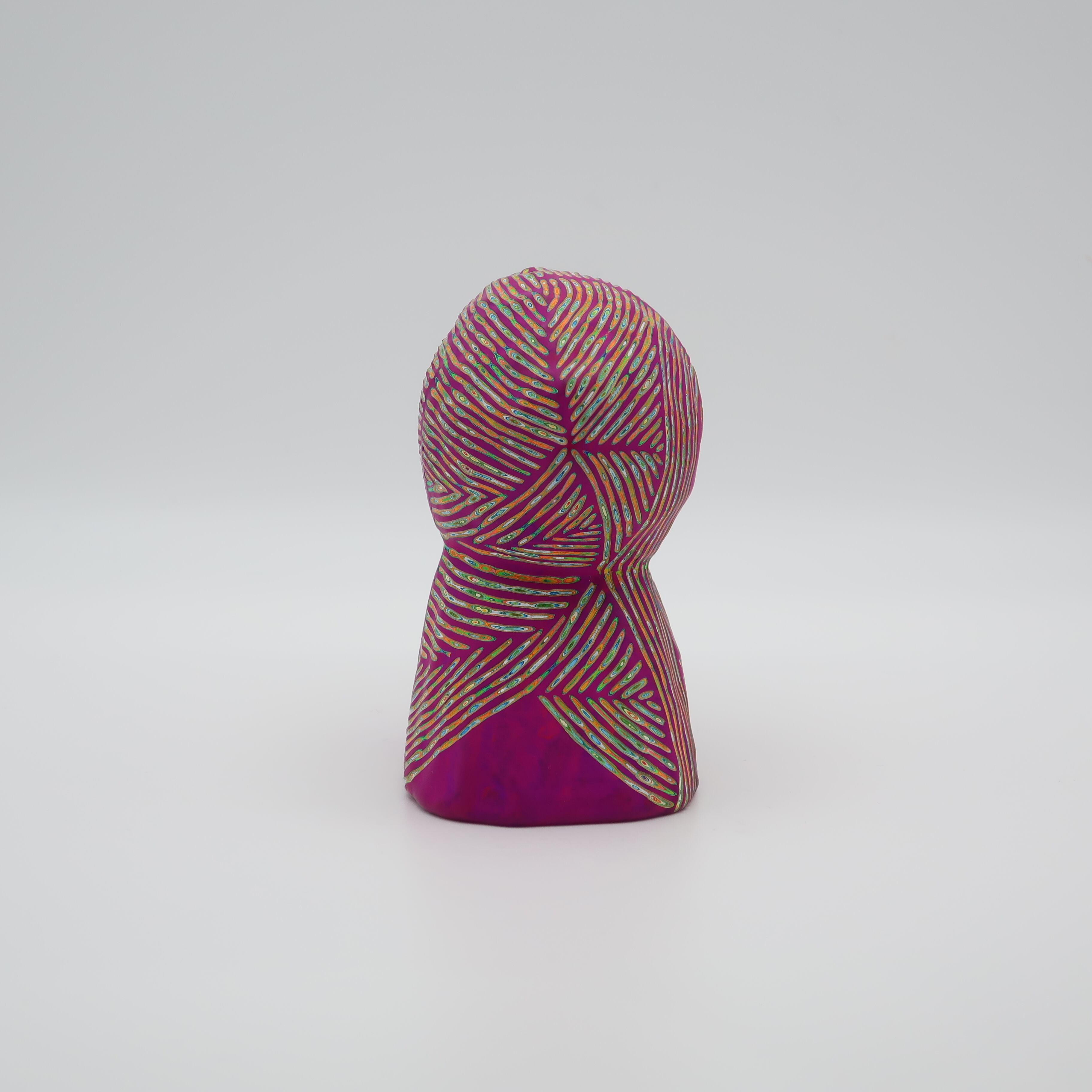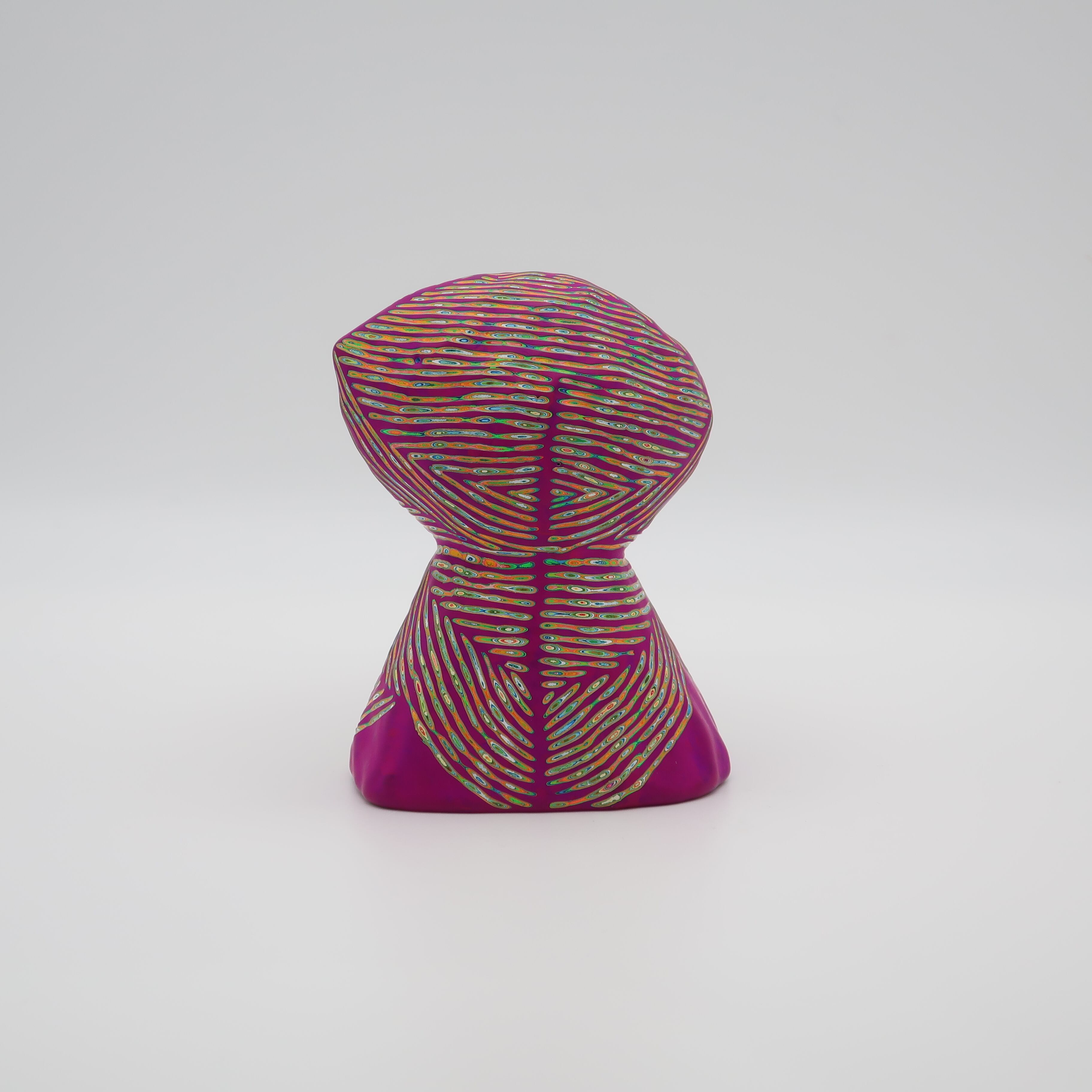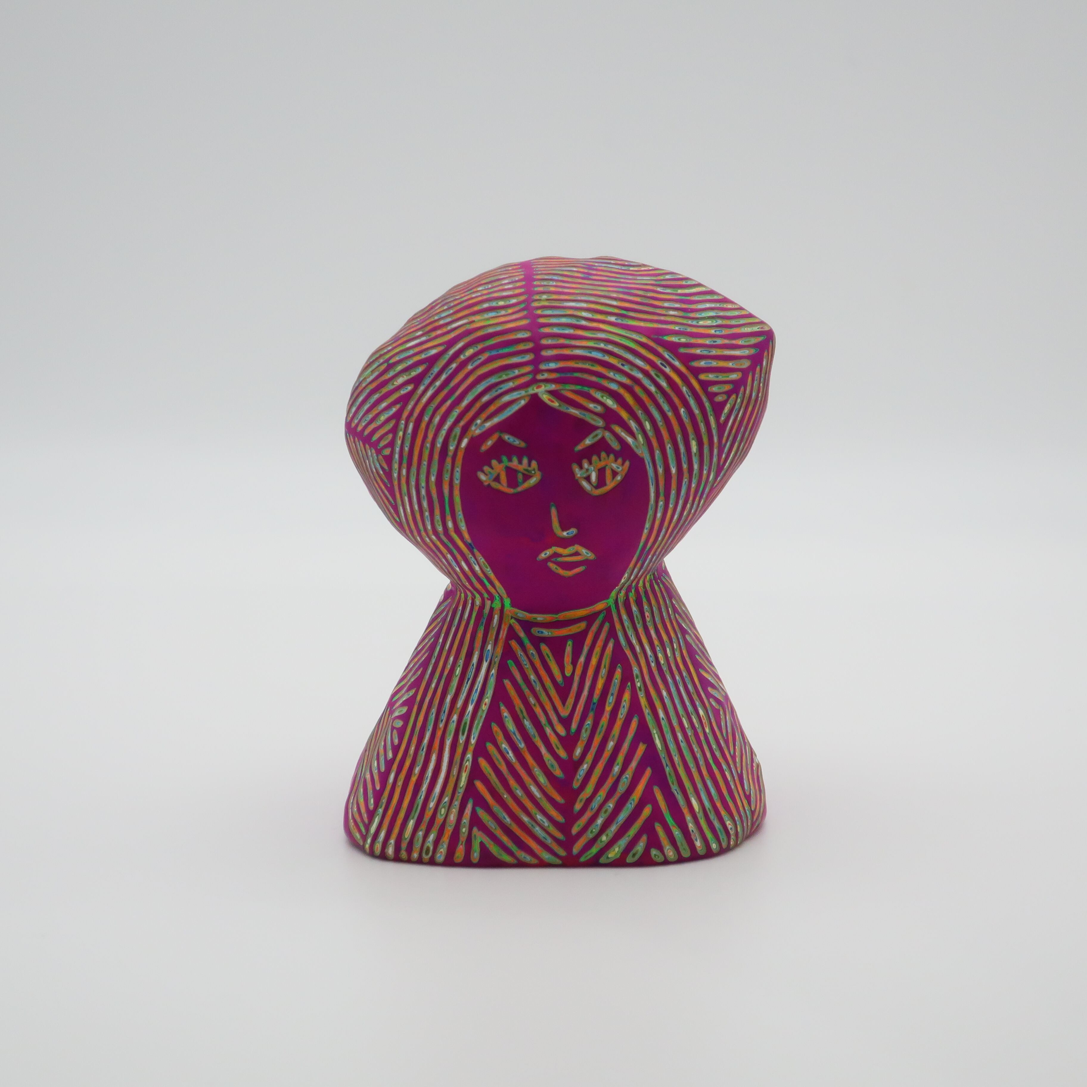 『COLOR SCULPTURE(色彩彫刻)』というオリジナルの手法で制作された木彫作品は、ポップでカラフルな見た目の奥に重層的なレイヤーが現れます。