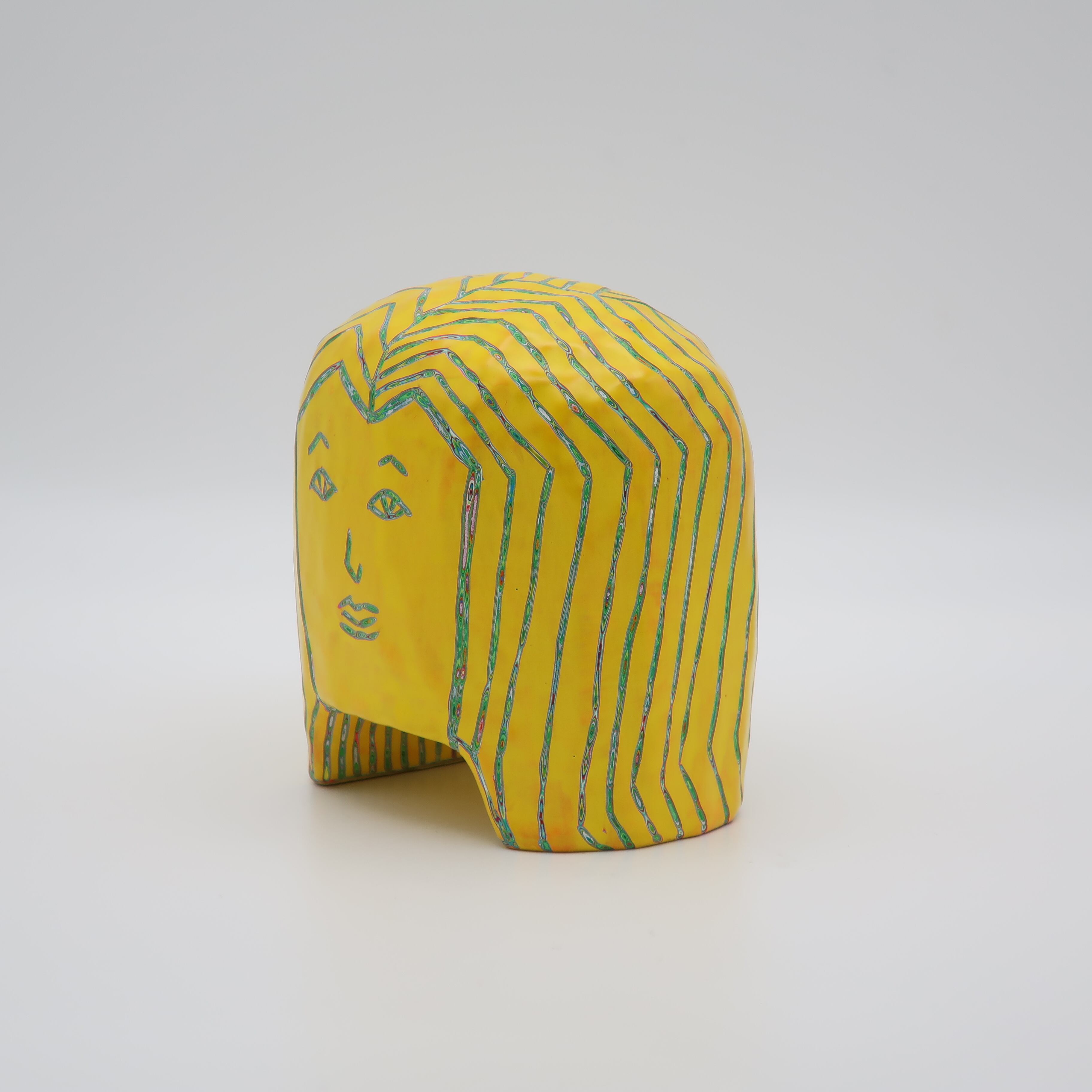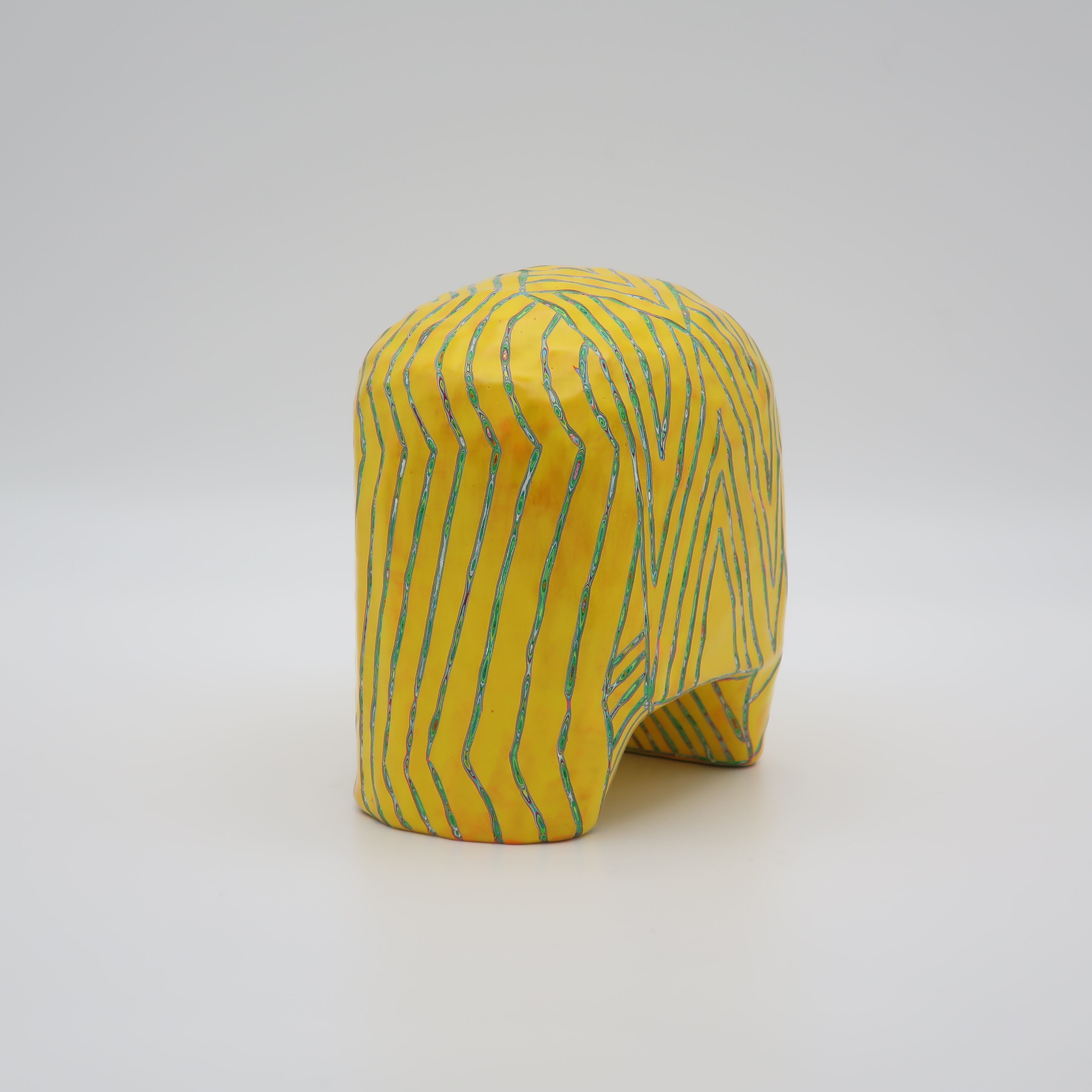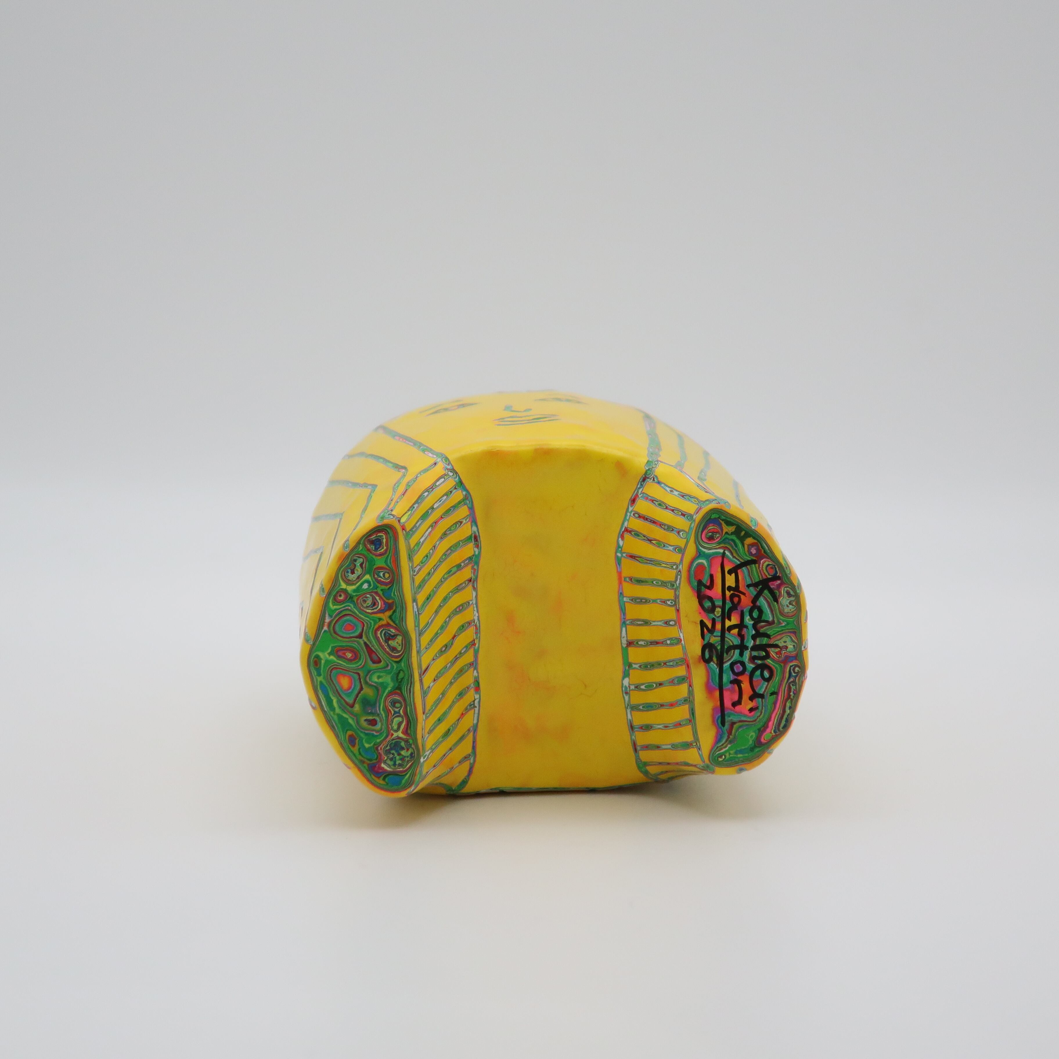 『COLOR SCULPTURE(色彩彫刻)』というオリジナルの手法で制作された木彫作品は、ポップでカラフルな見た目の奥に重層的なレイヤーが現れます。