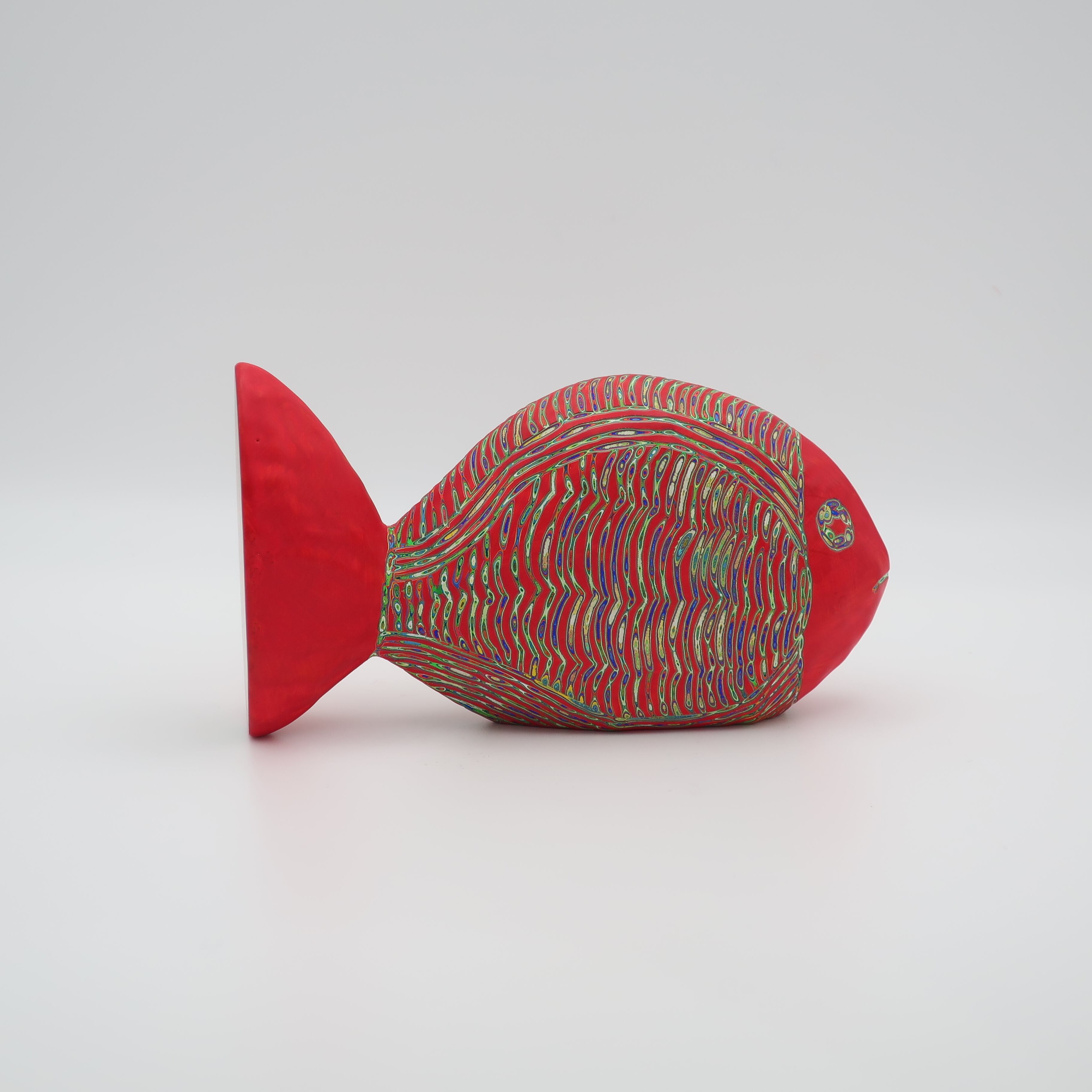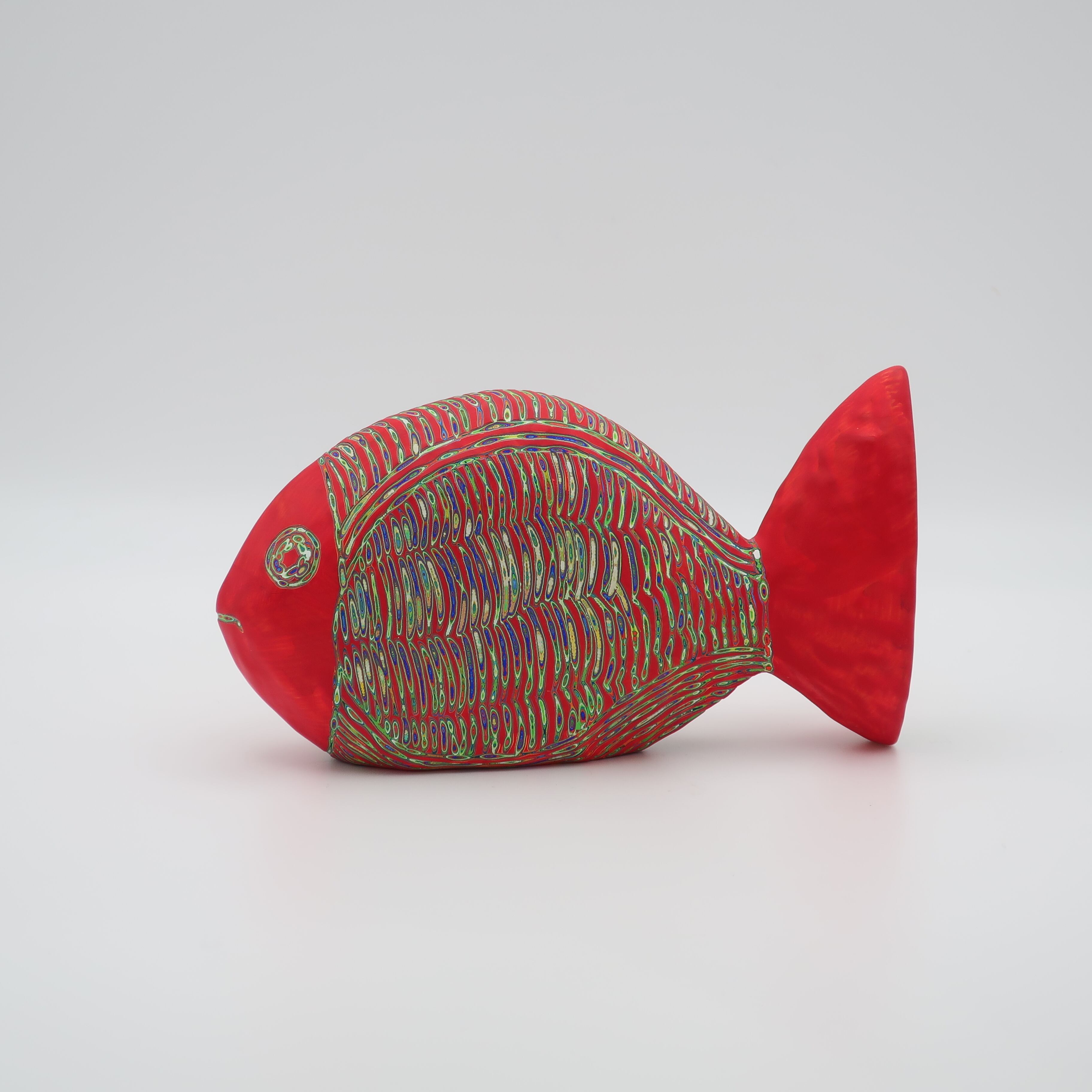 『COLOR SCULPTURE(色彩彫刻)』というオリジナルの手法で制作された木彫作品は、ポップでカラフルな見た目の奥に重層的なレイヤーが現れます。