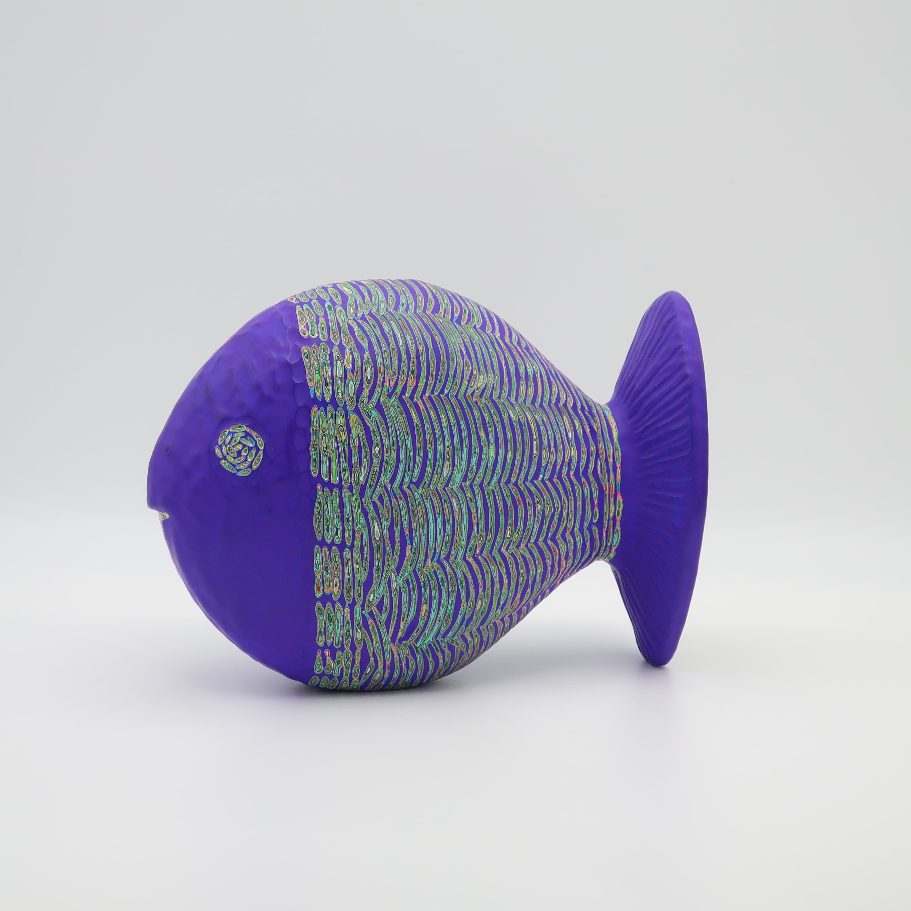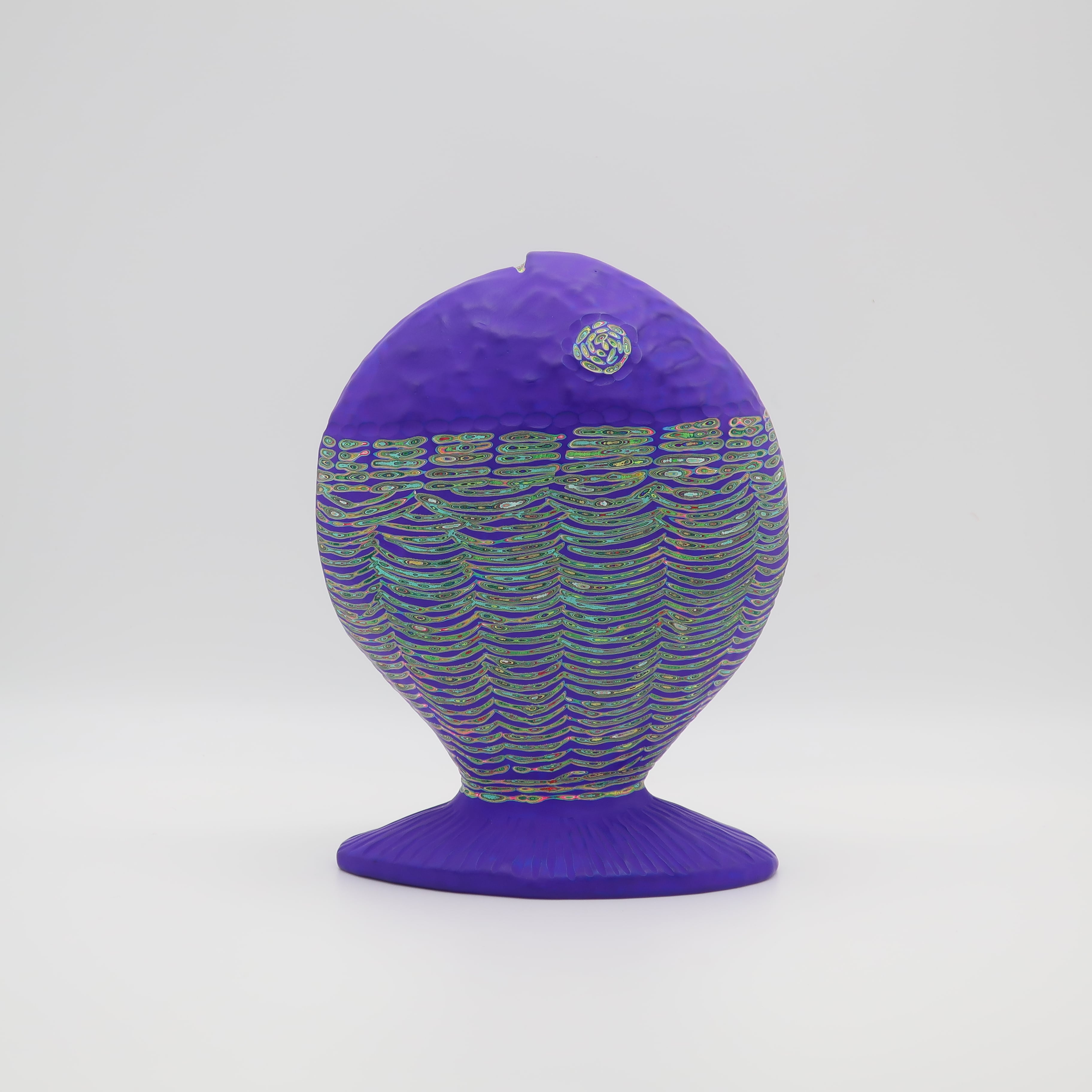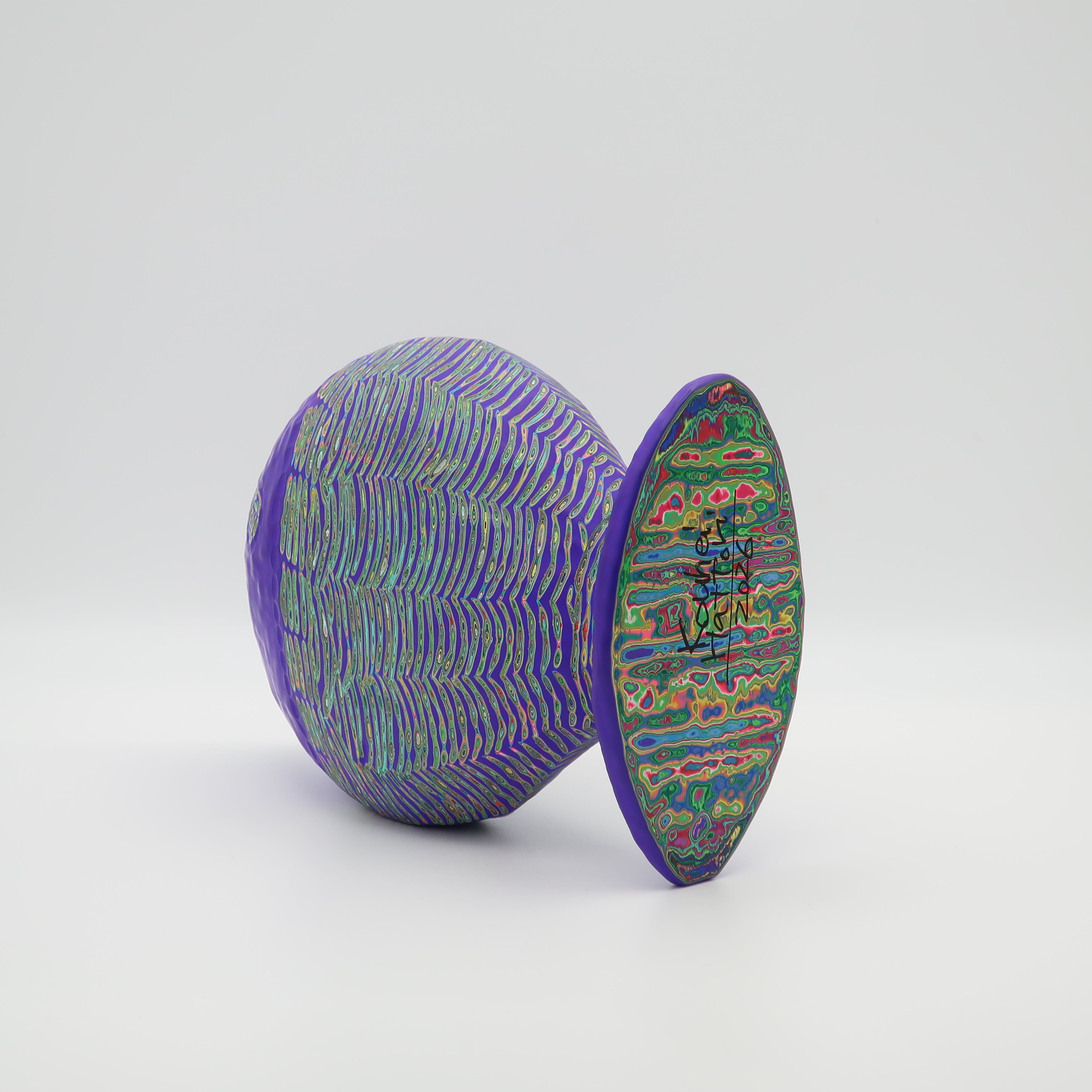 『COLOR SCULPTURE(色彩彫刻)』というオリジナルの手法で制作された木彫作品は、ポップでカラフルな見た目の奥に重層的なレイヤーが現れます。