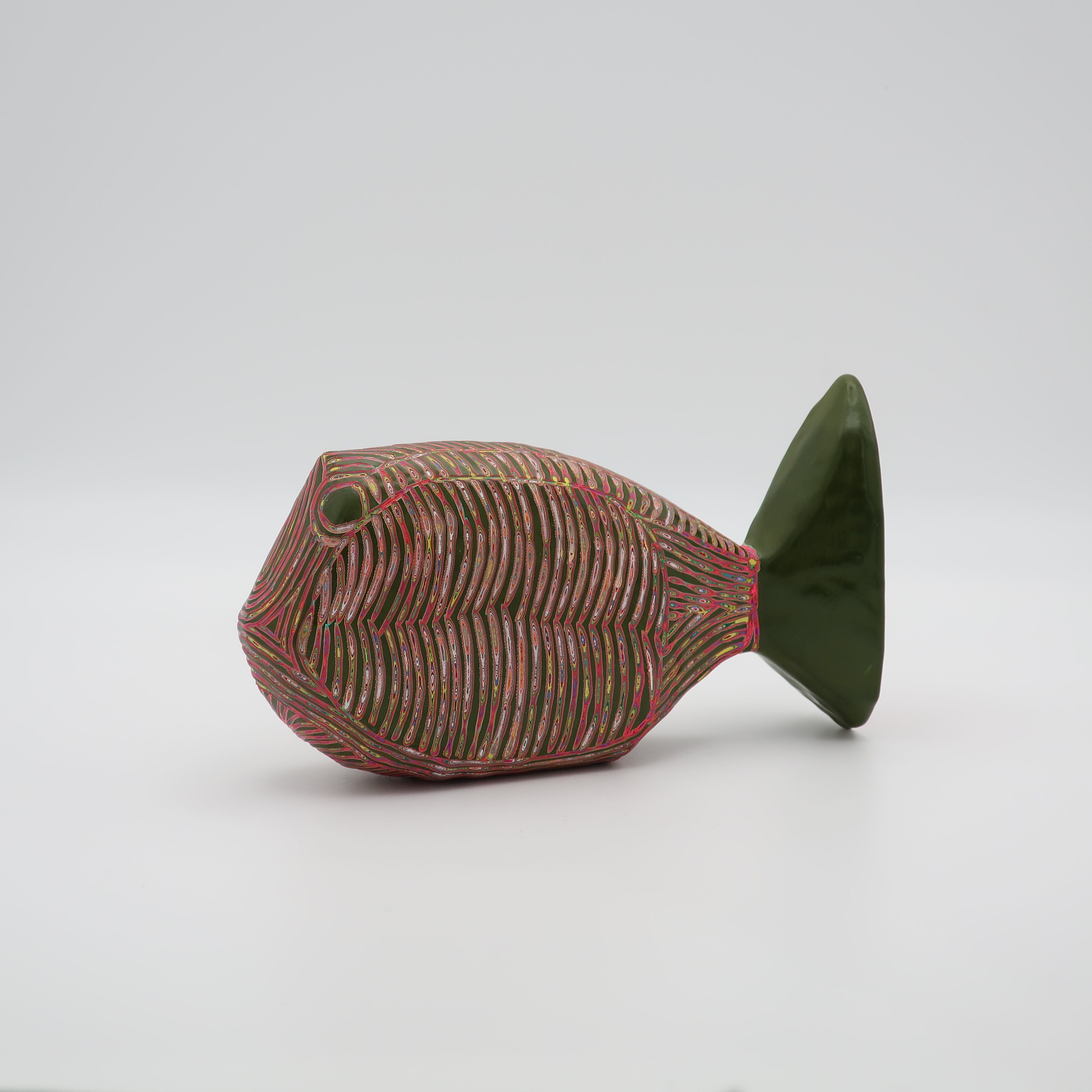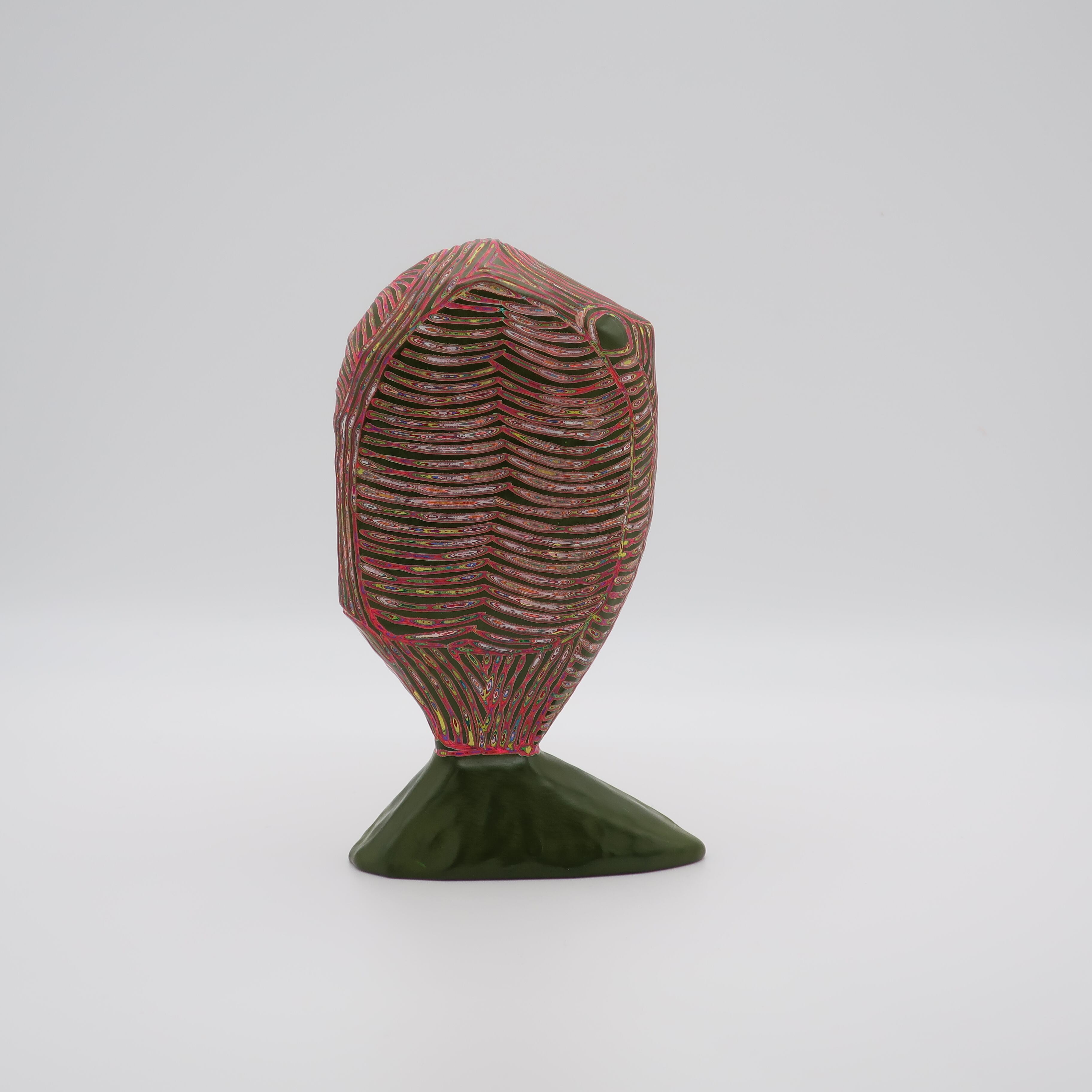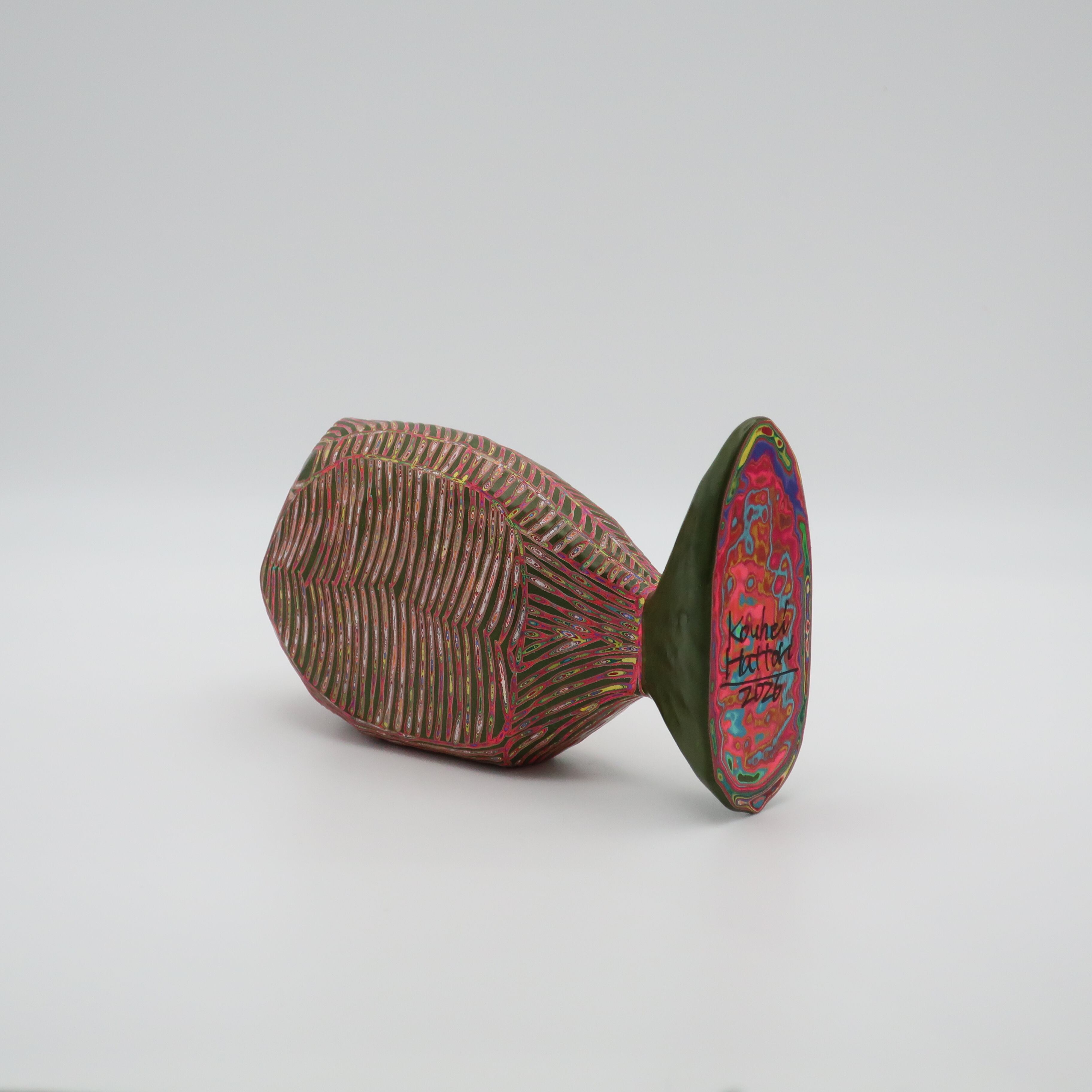 『COLOR SCULPTURE(色彩彫刻)』というオリジナルの手法で制作された木彫作品は、ポップでカラフルな見た目の奥に重層的なレイヤーが現れます。