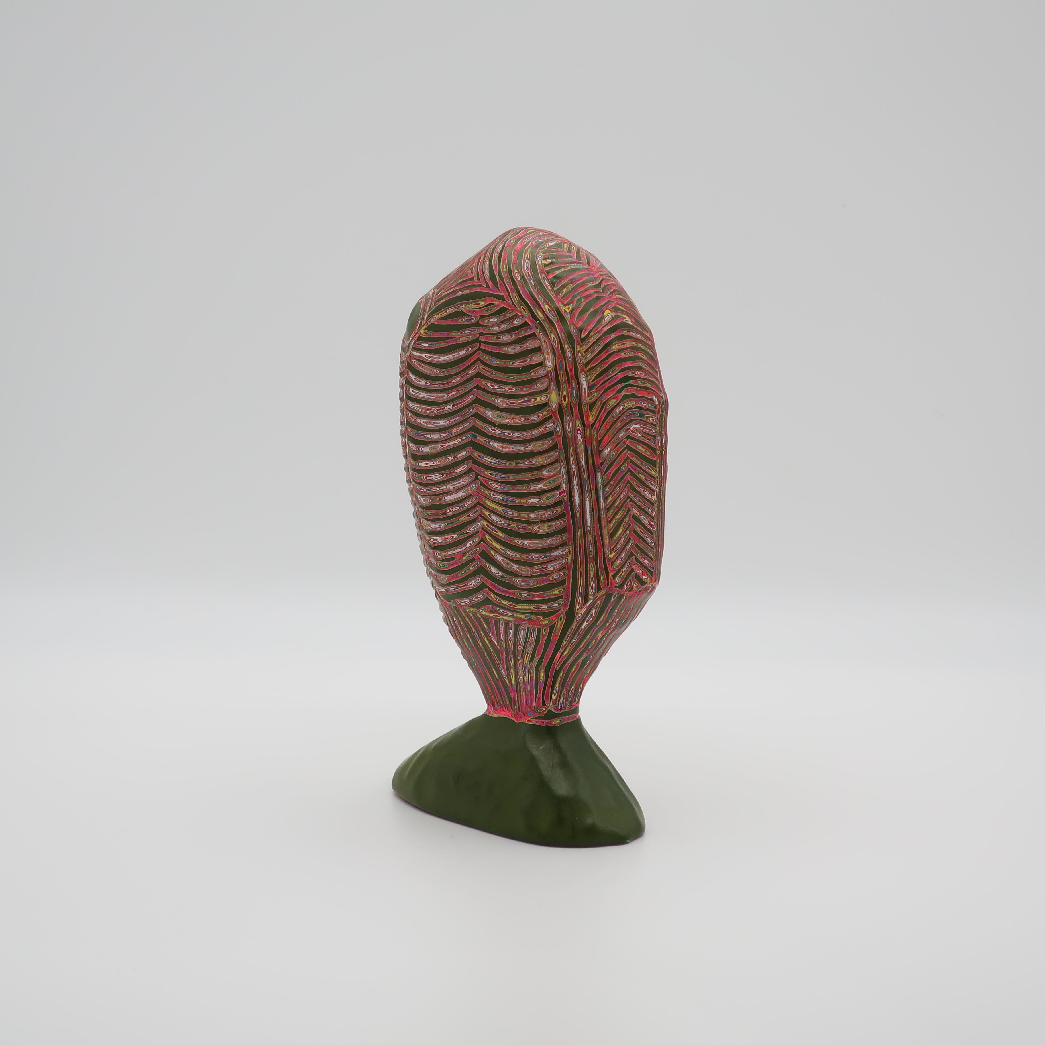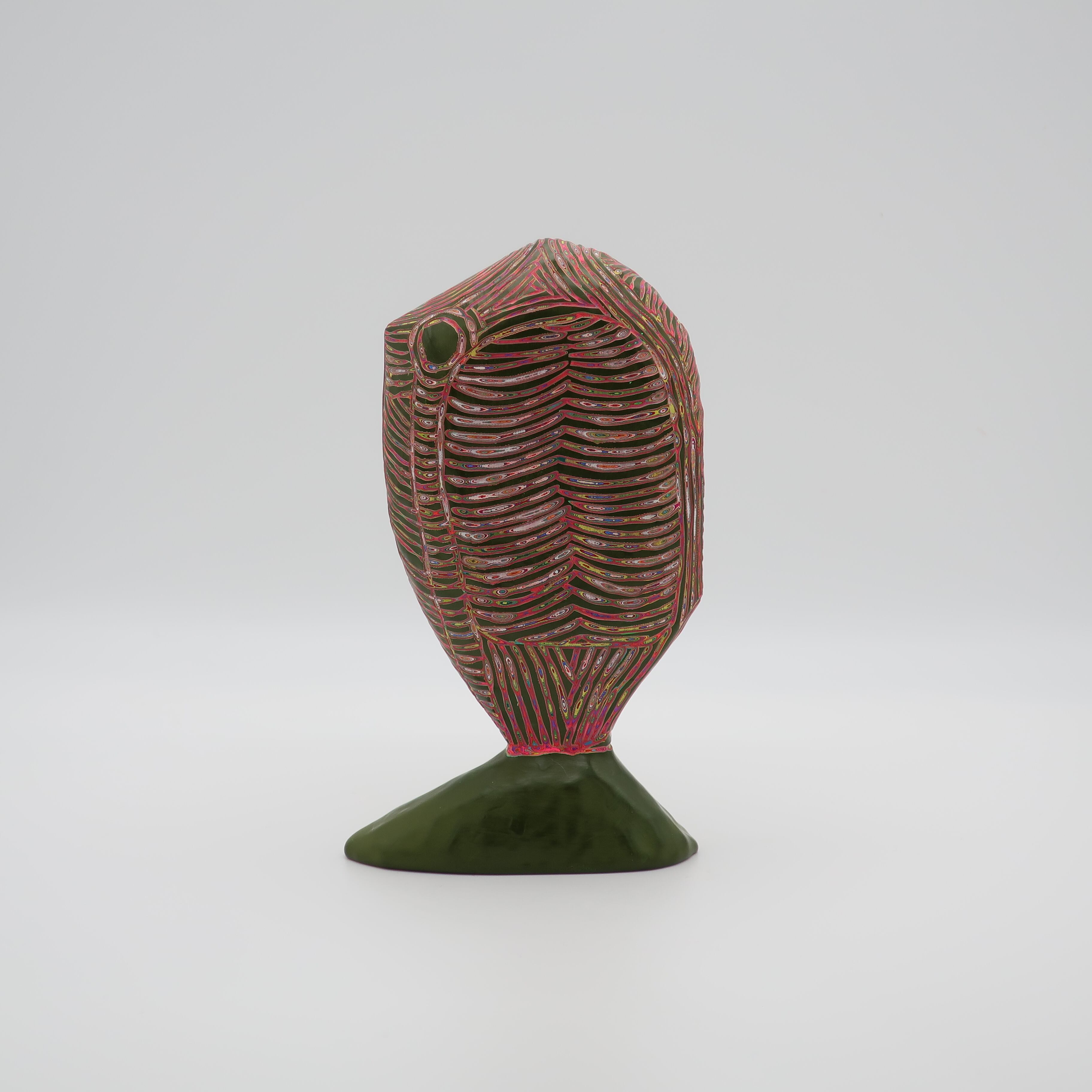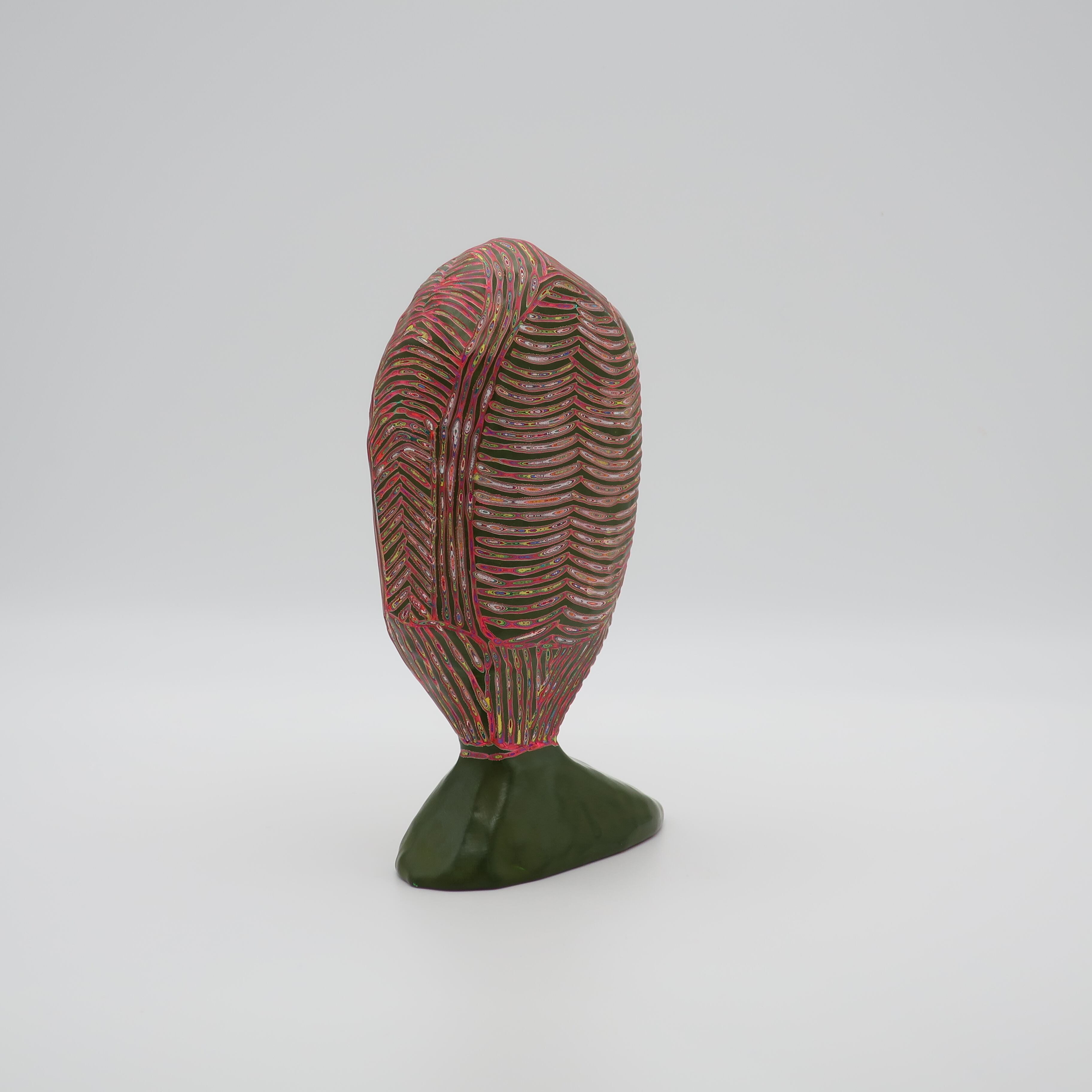 『COLOR SCULPTURE(色彩彫刻)』というオリジナルの手法で制作された木彫作品は、ポップでカラフルな見た目の奥に重層的なレイヤーが現れます。
