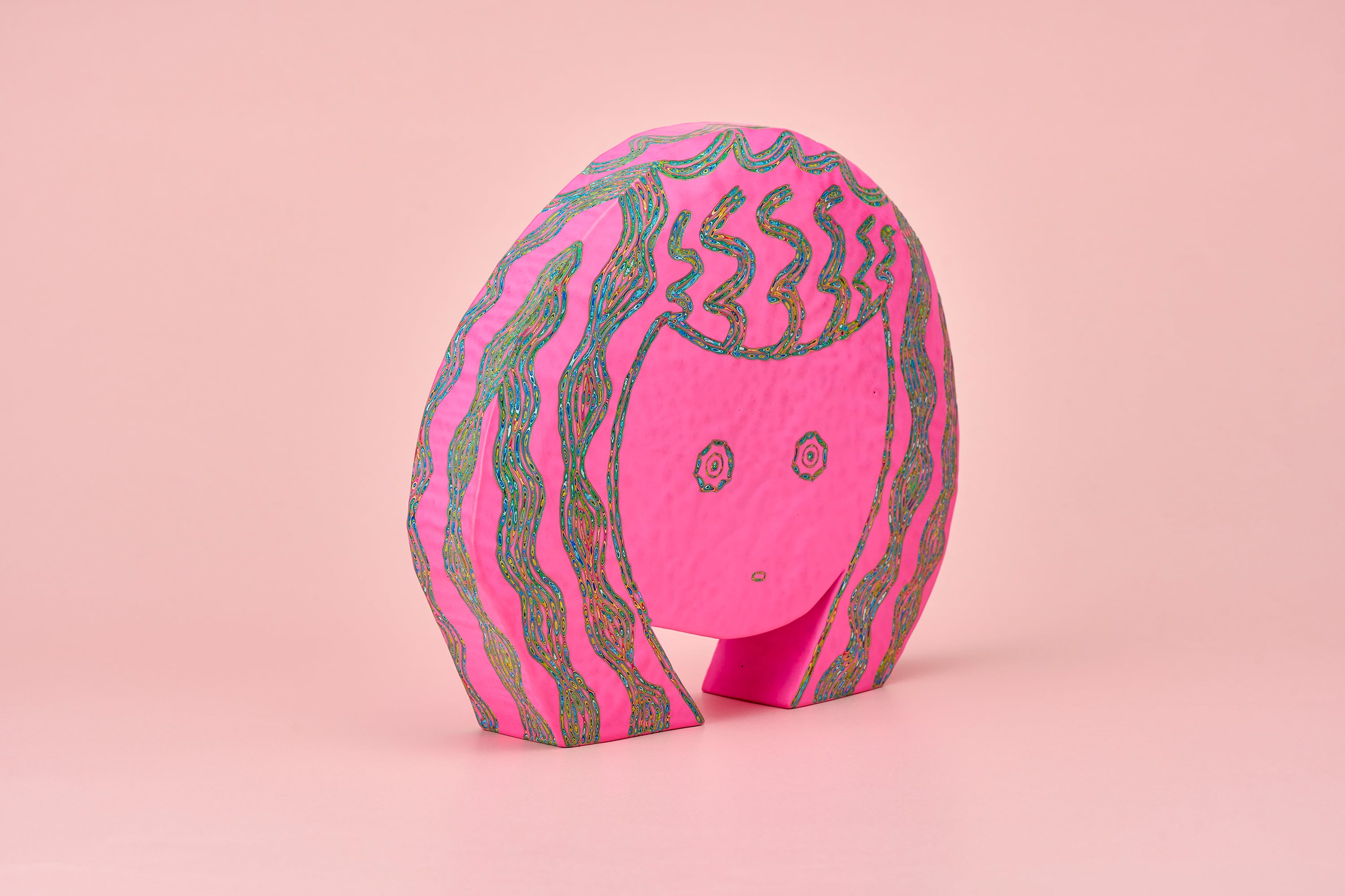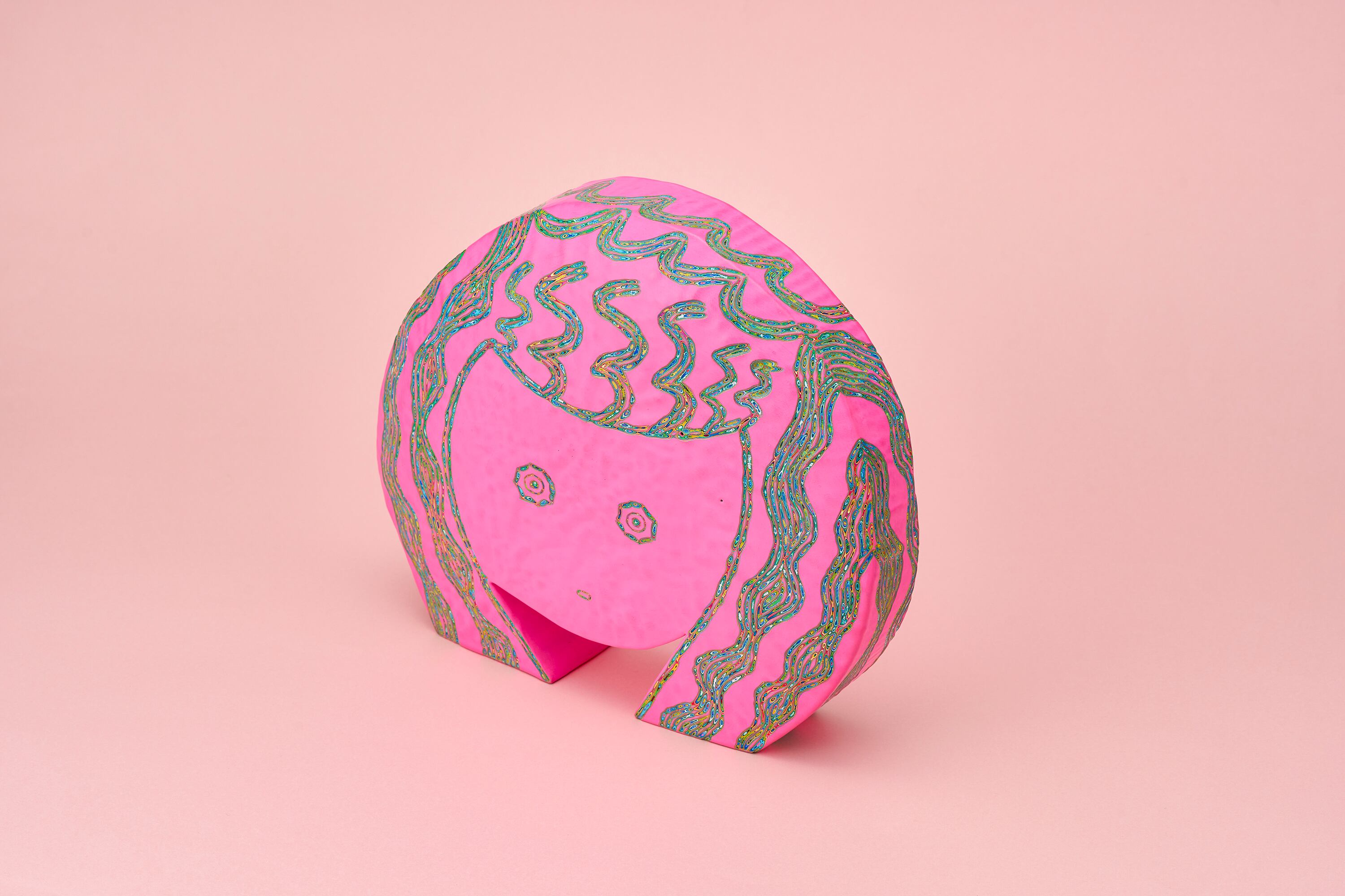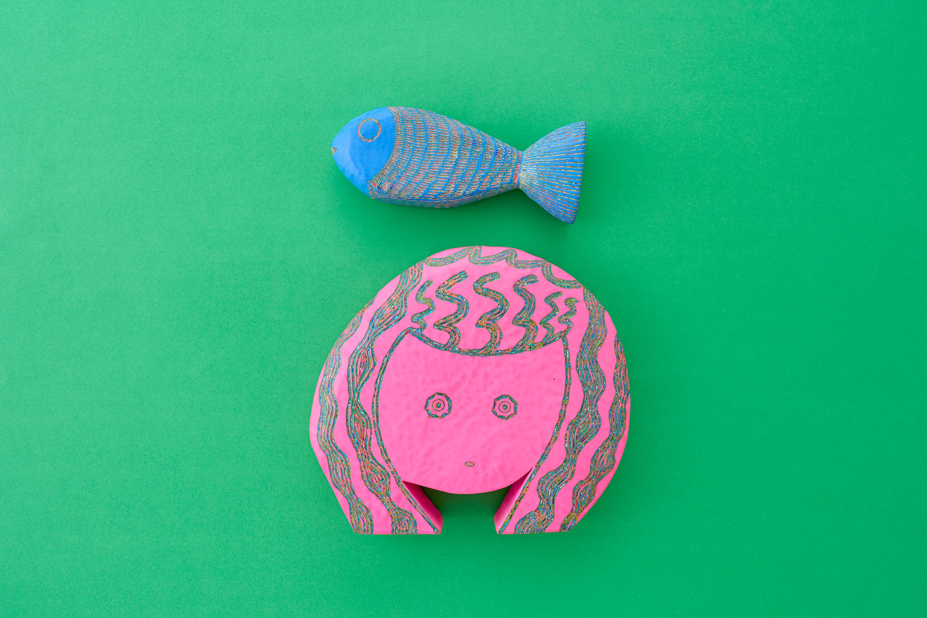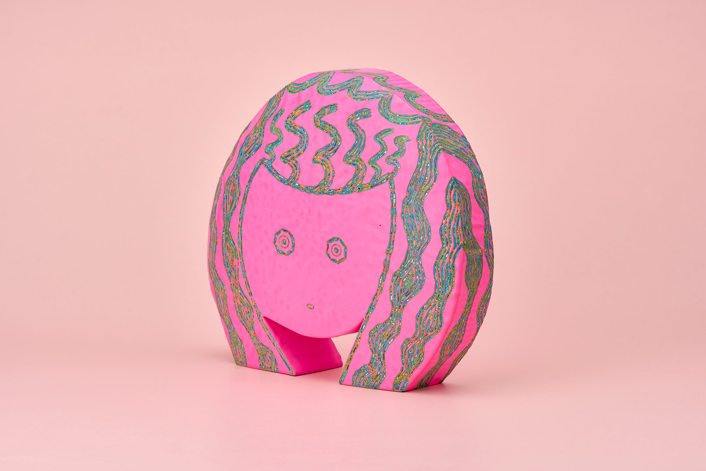 『COLOR SCULPTURE(色彩彫刻)』というオリジナルの手法で制作された木彫作品は、ポップでカラフルな見た目の奥に重層的なレイヤーが現れます。