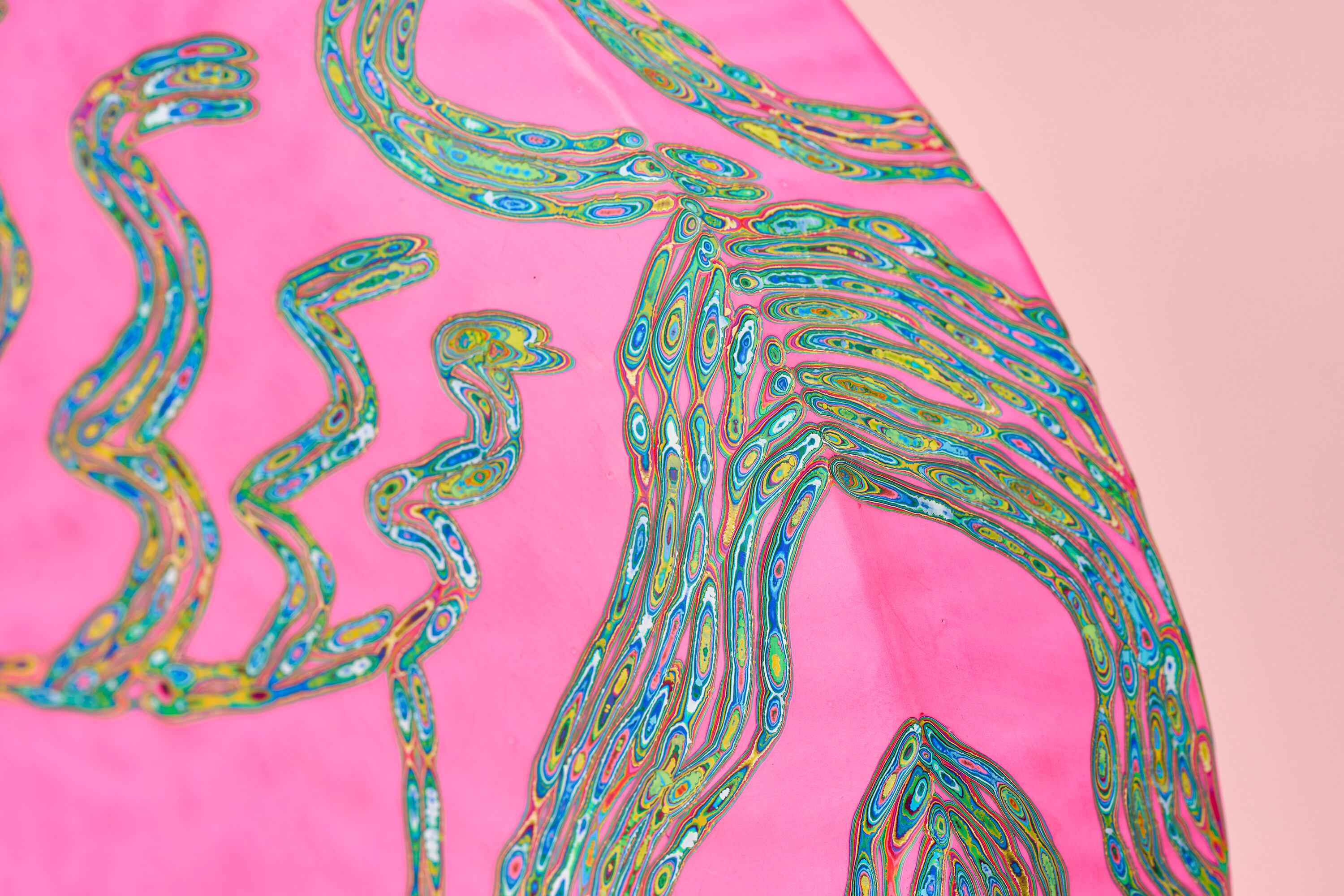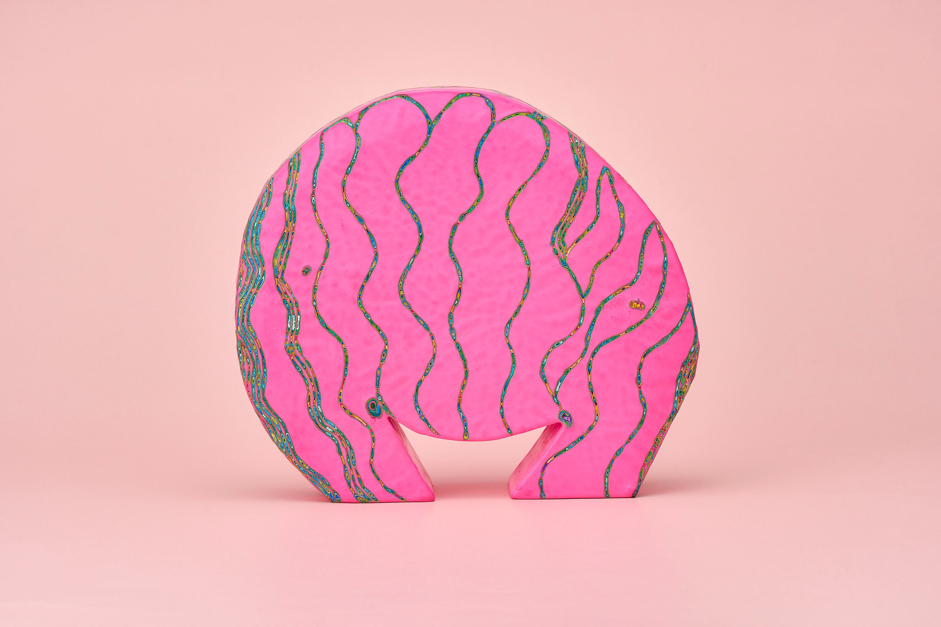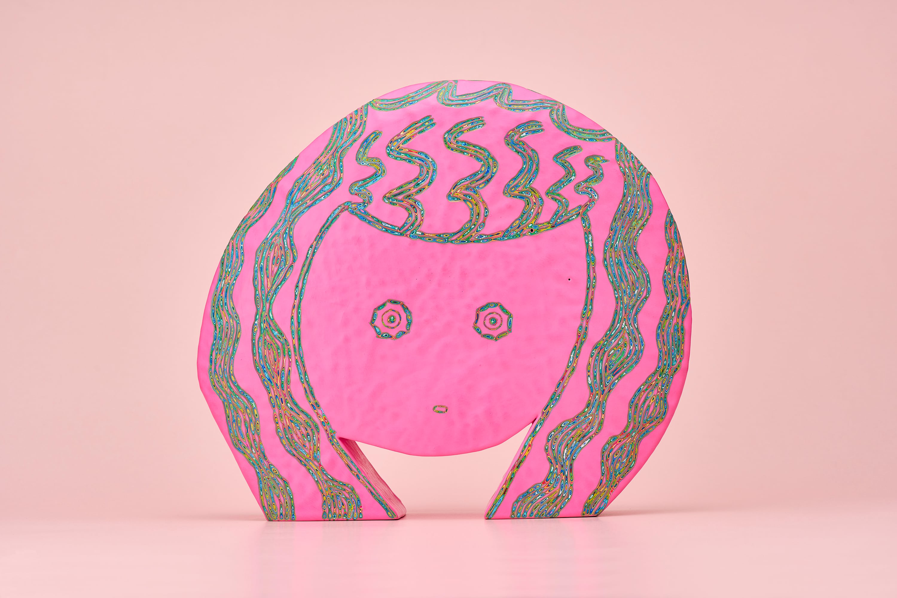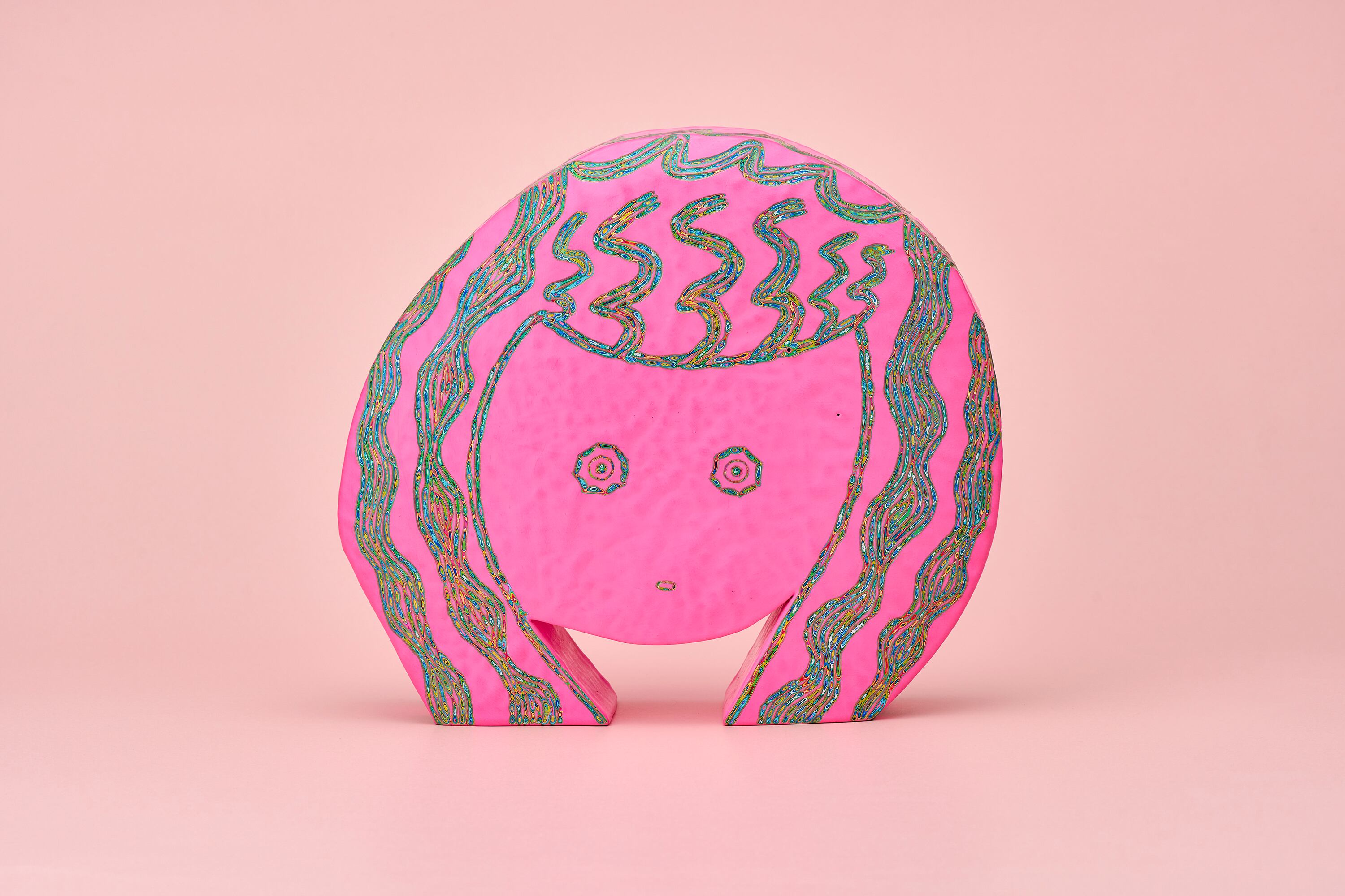 『COLOR SCULPTURE(色彩彫刻)』というオリジナルの手法で制作された木彫作品は、ポップでカラフルな見た目の奥に重層的なレイヤーが現れます。